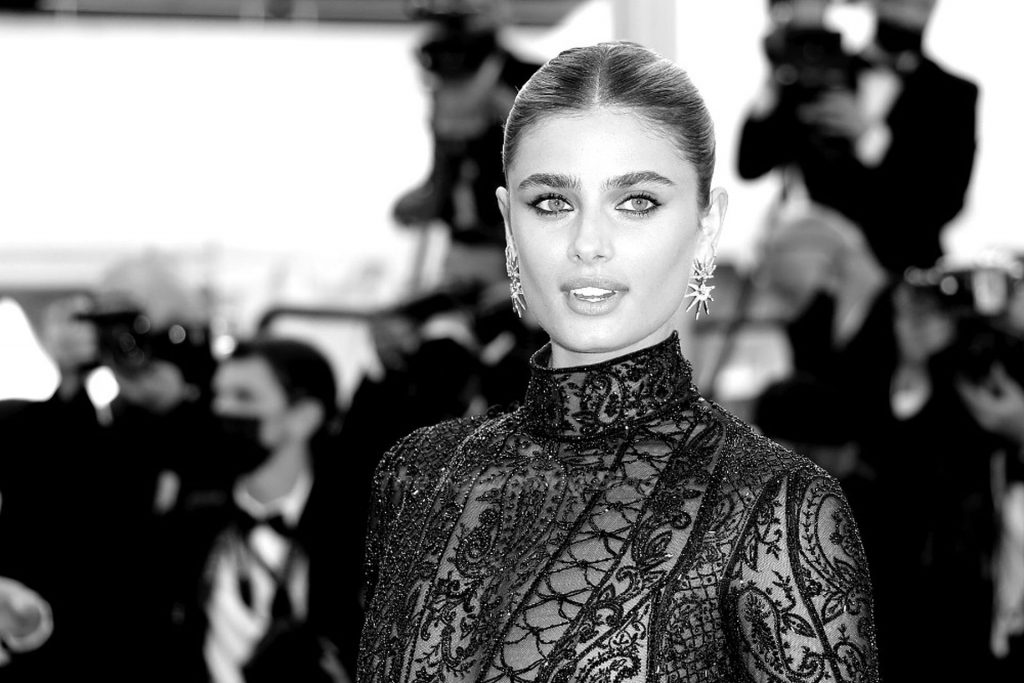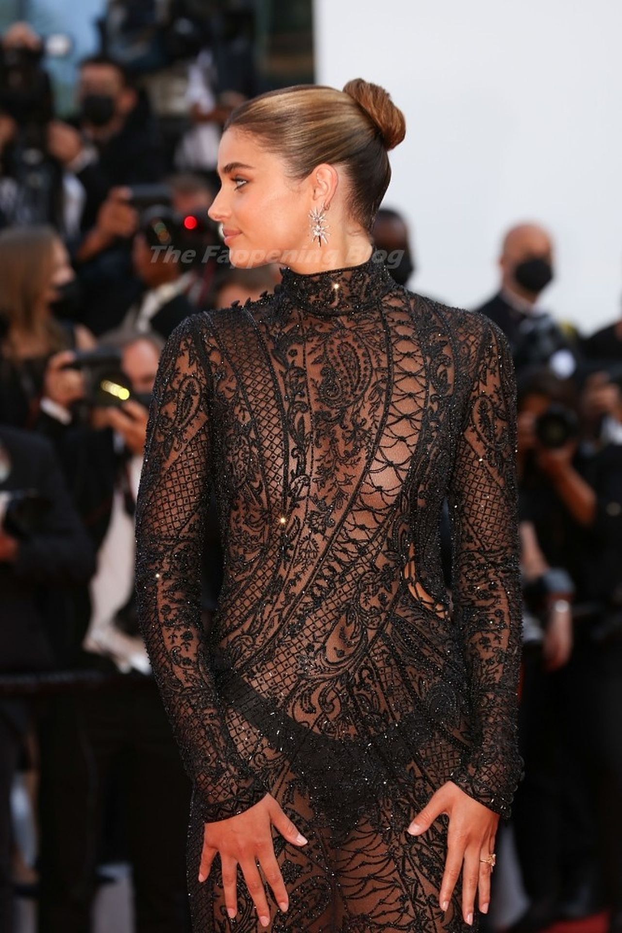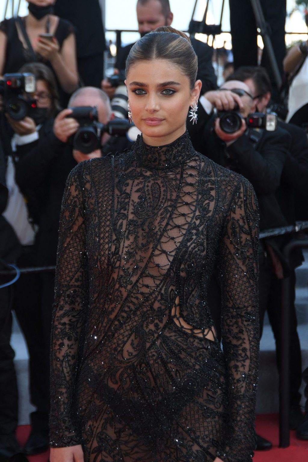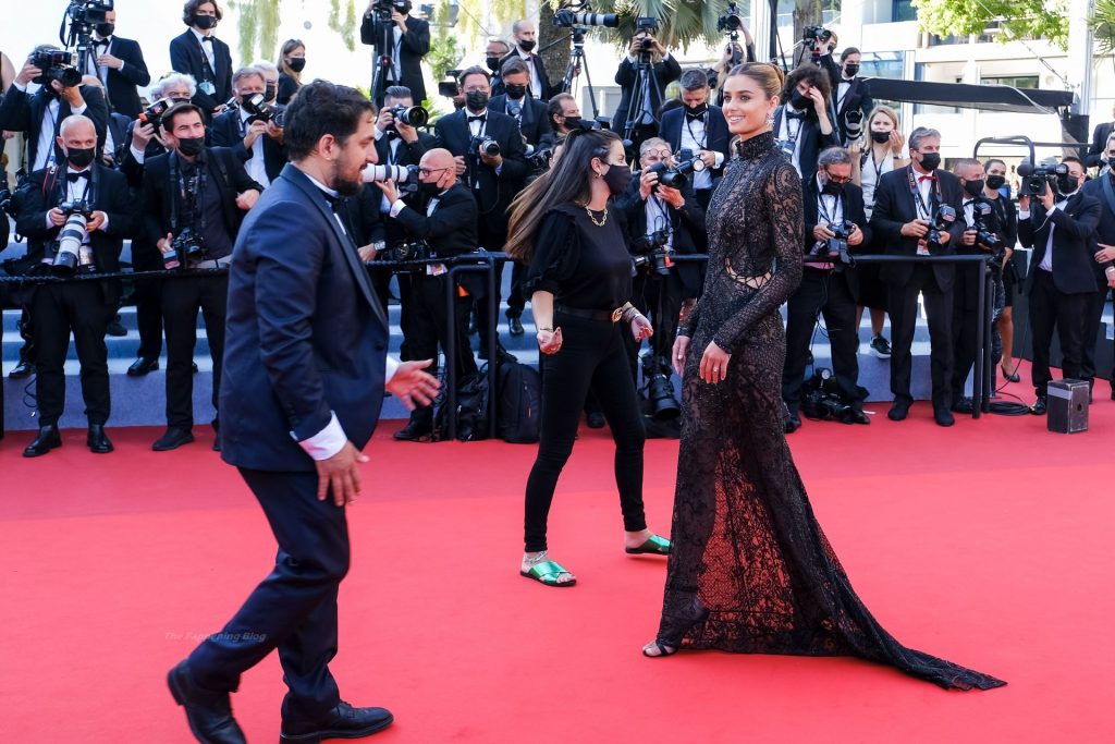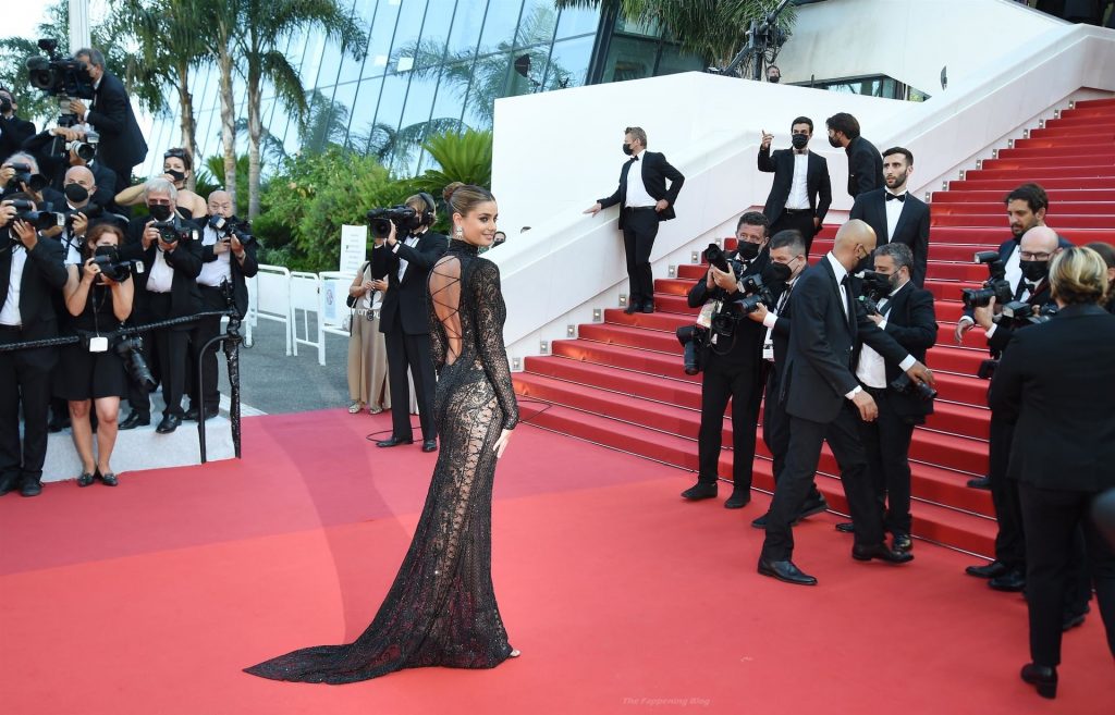 La modella Taylor Hill posa con un abito nero trasparente durante la proiezione di “De Son Vivant” al 74º Festival di Cannes a Cannes, 07/10/2021.