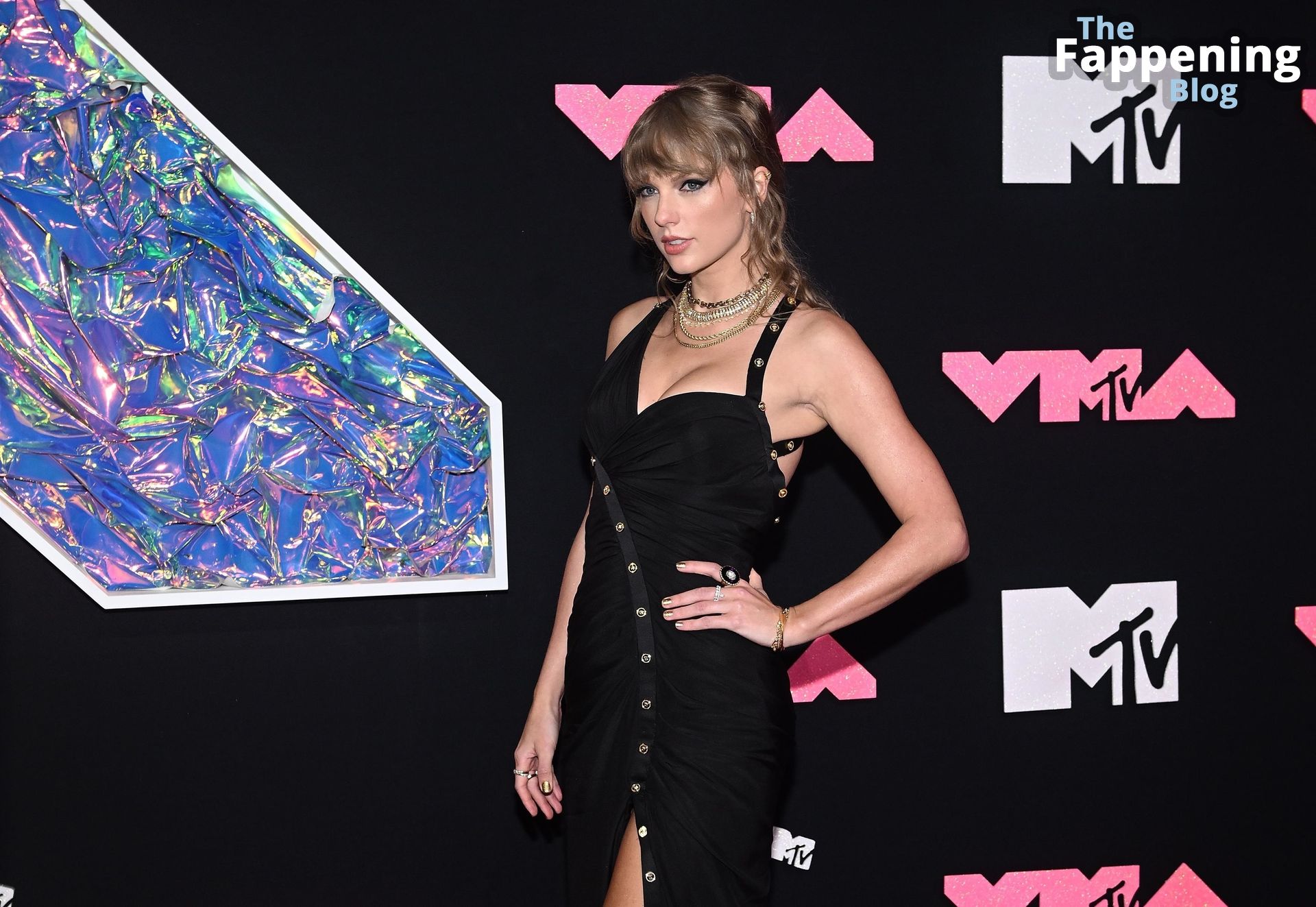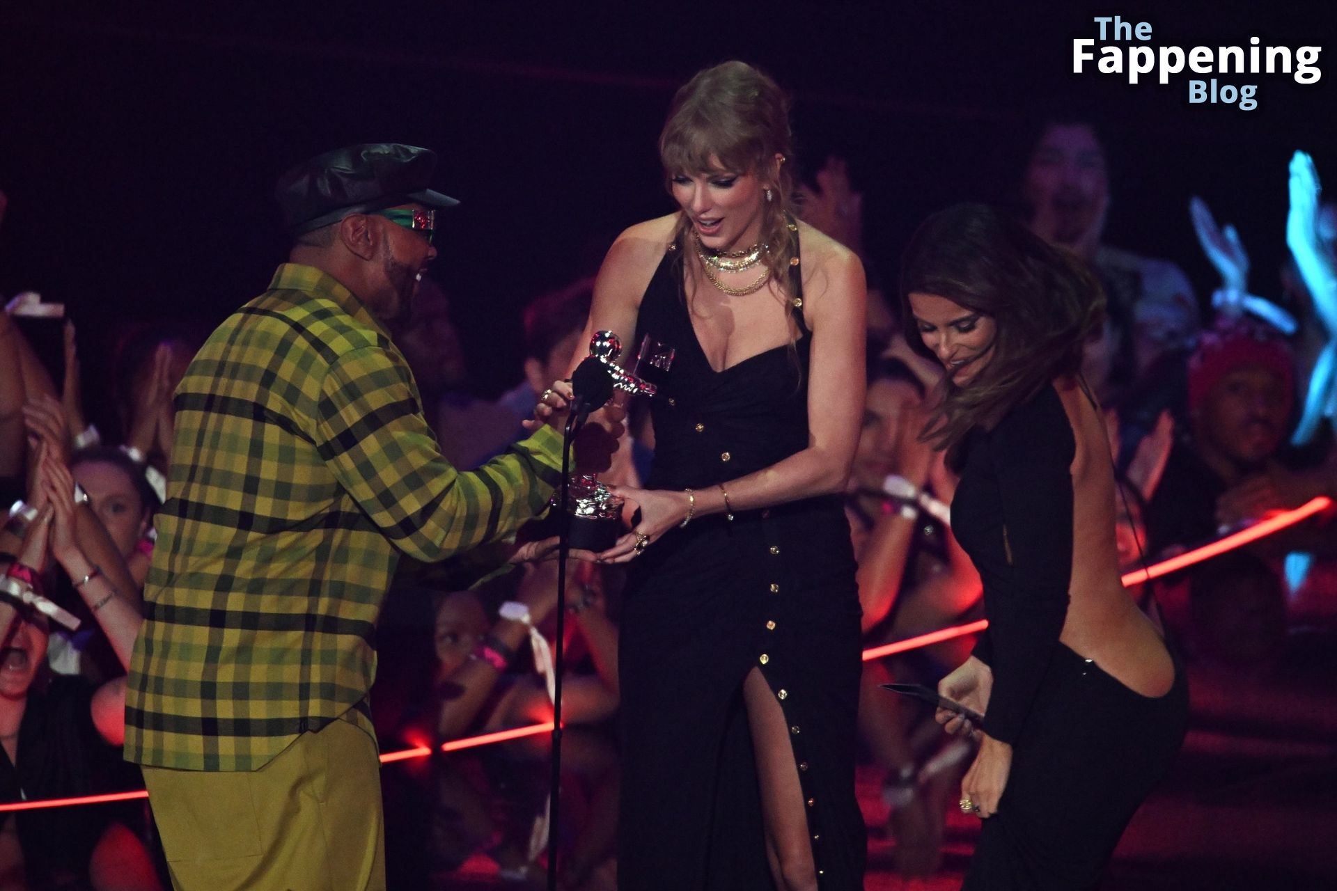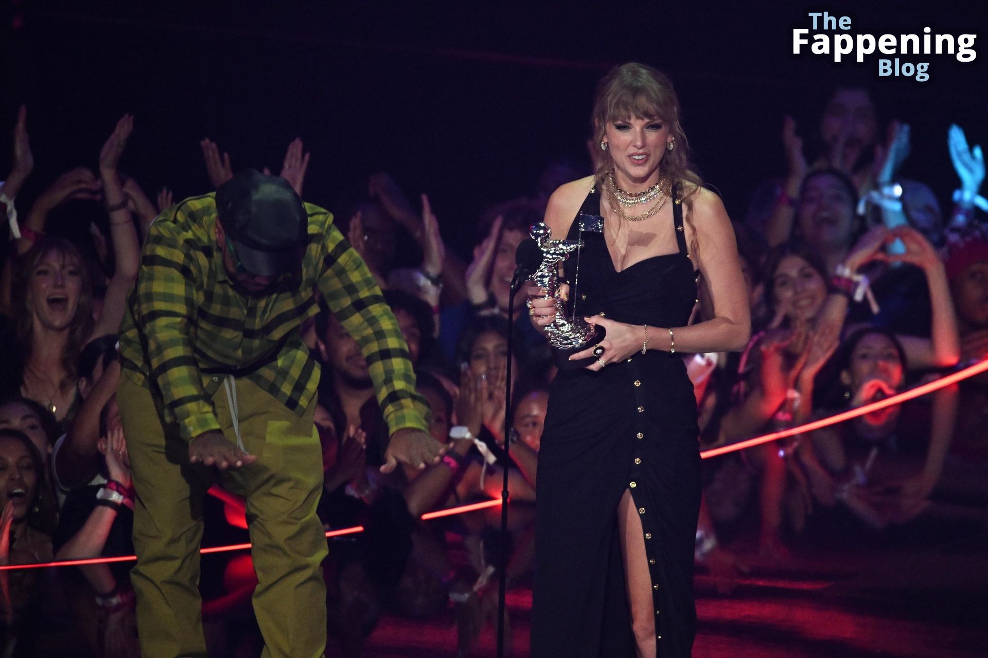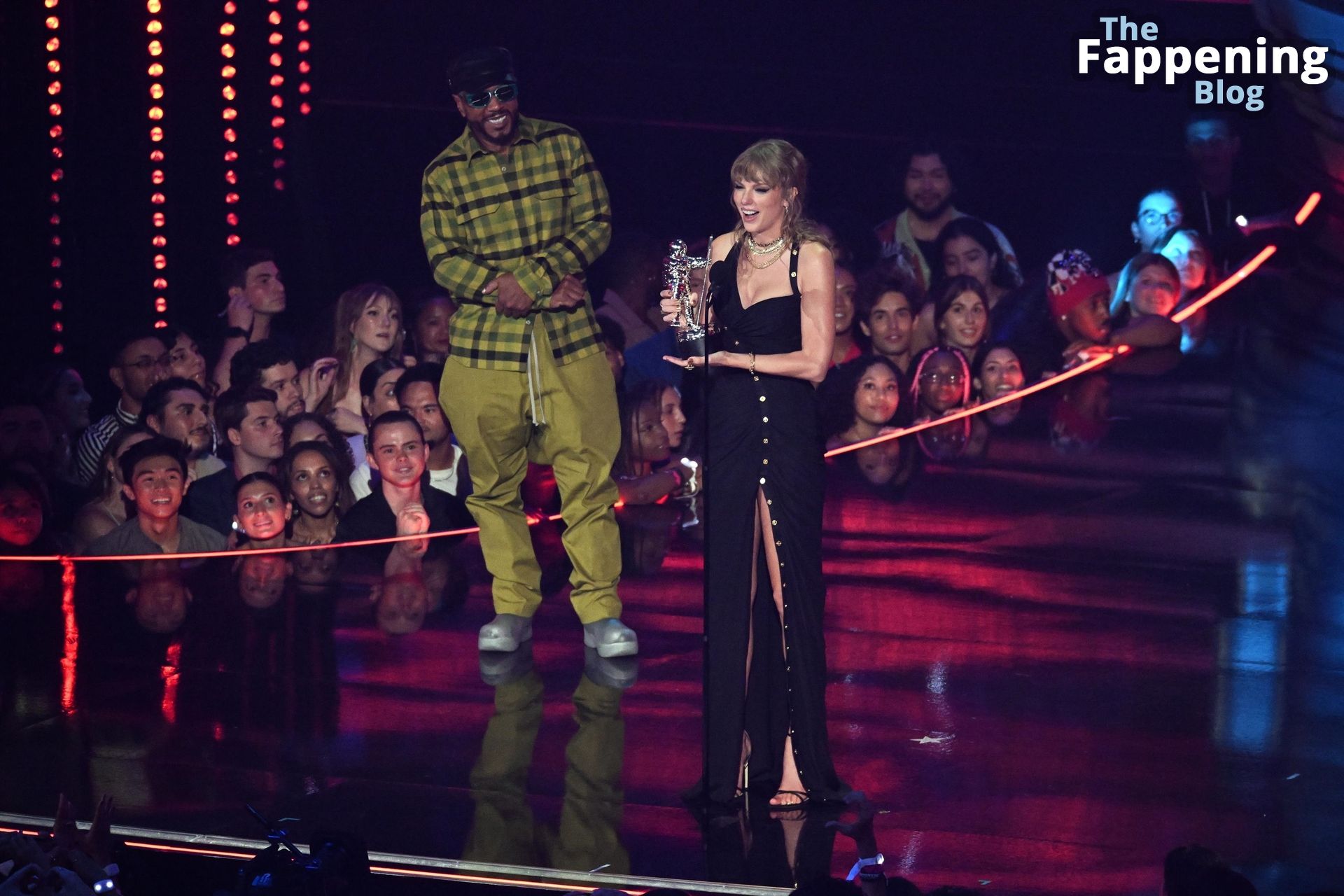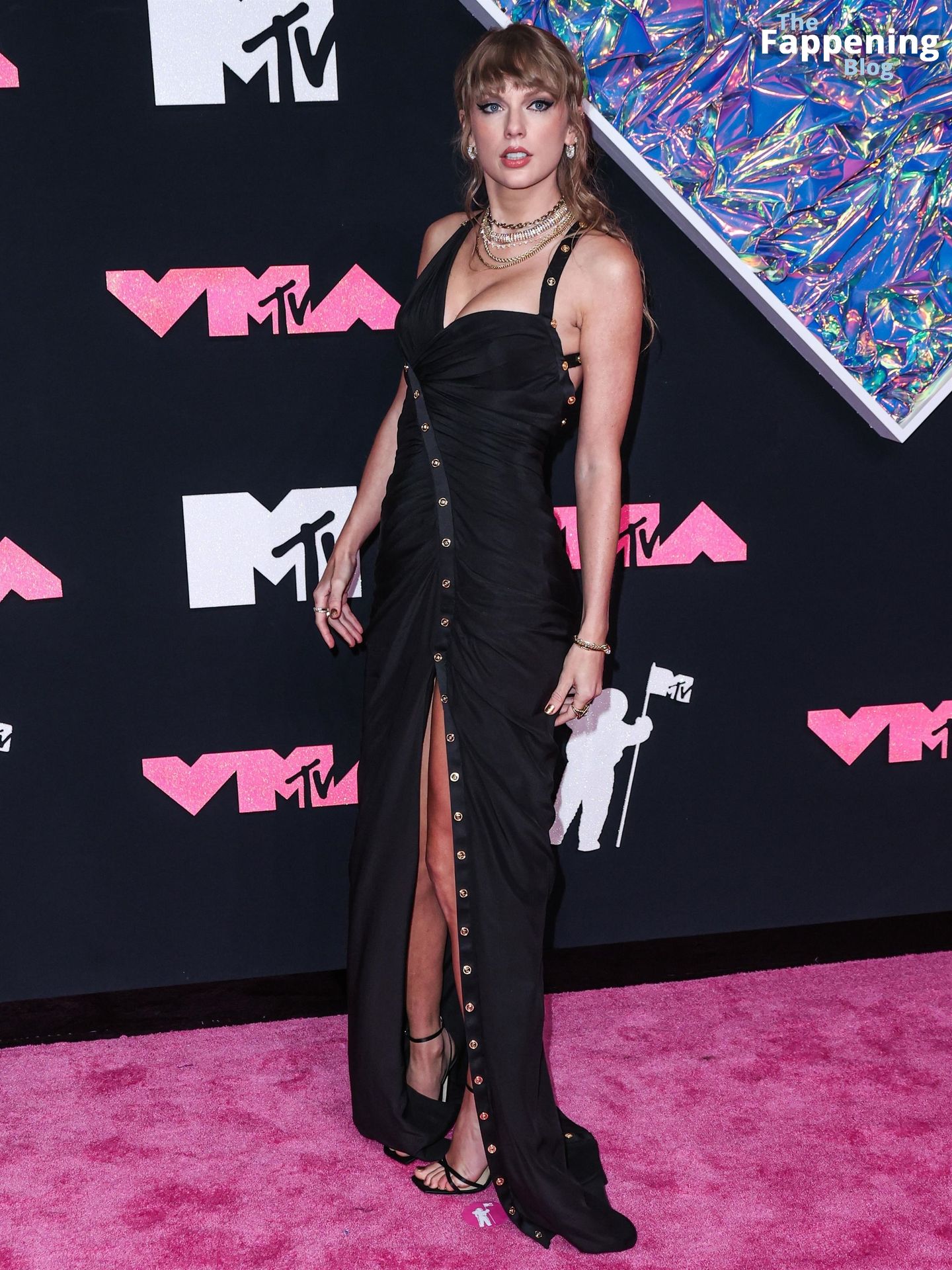 Taylor Swift mostra le sue gambe killer, indossando un abito nero asimmetrico con uno spacco audace mentre porta a casa alcune grandi vittorie agli MTV Video Music Awards.