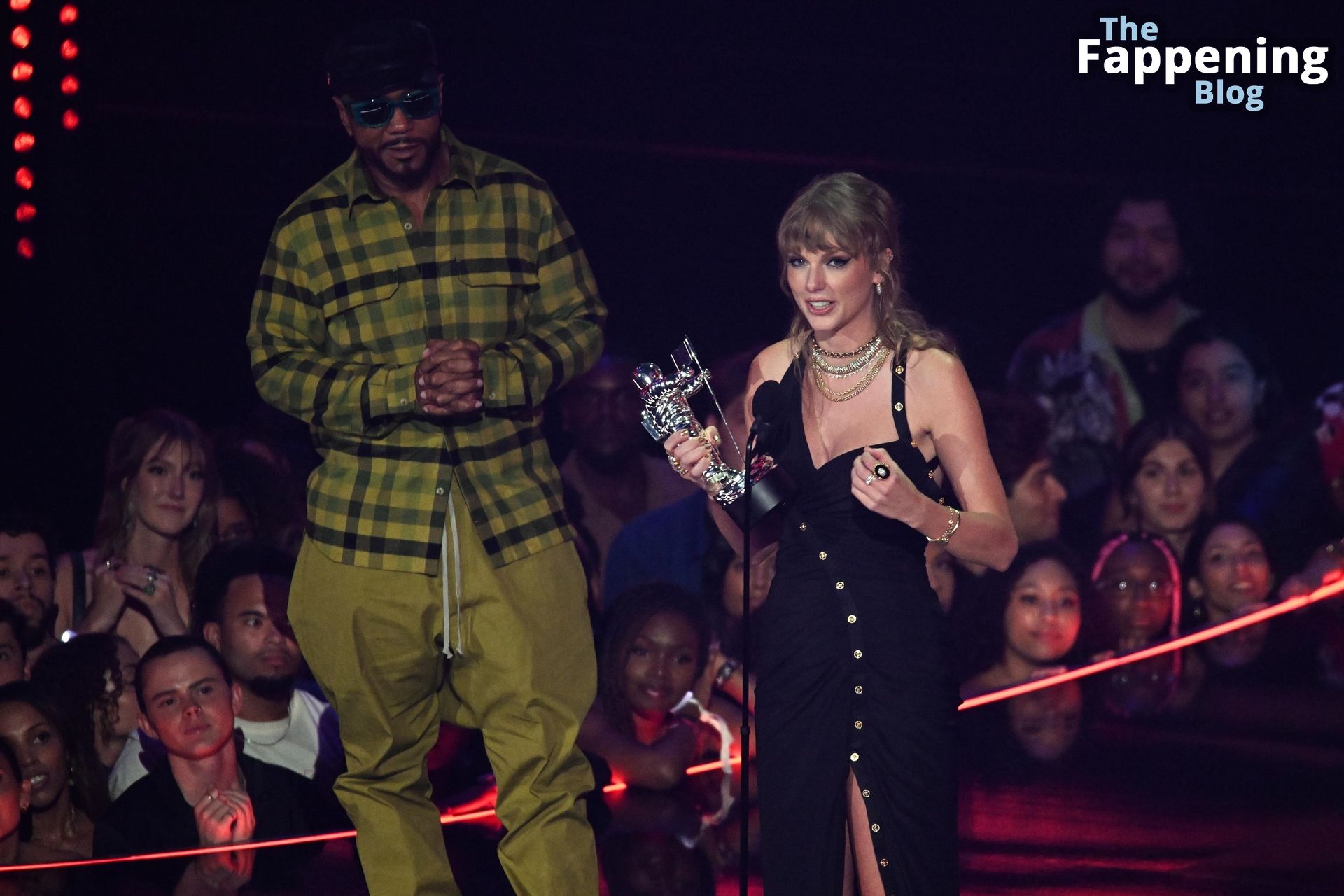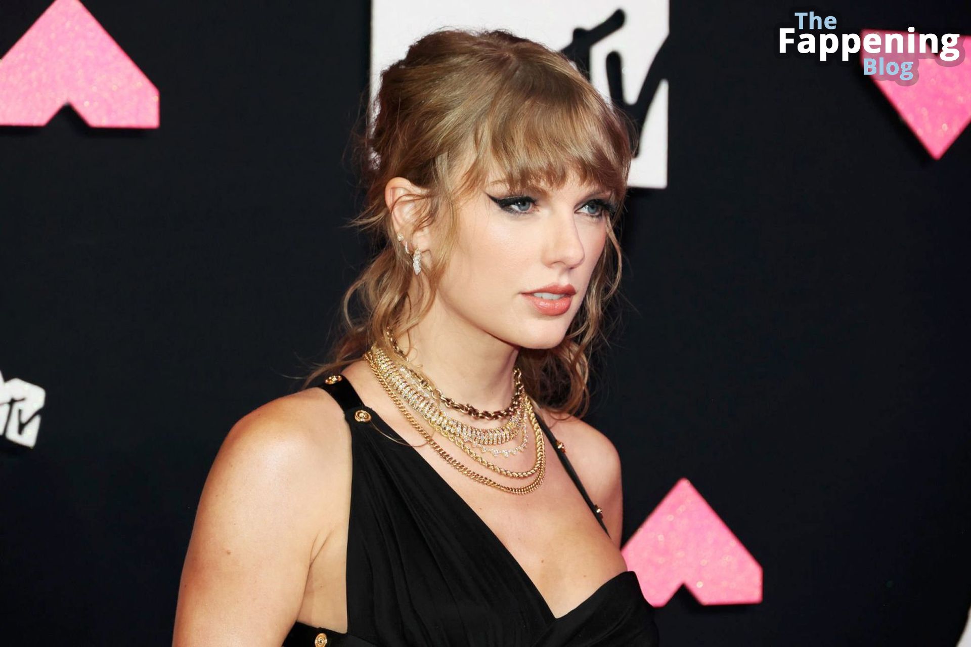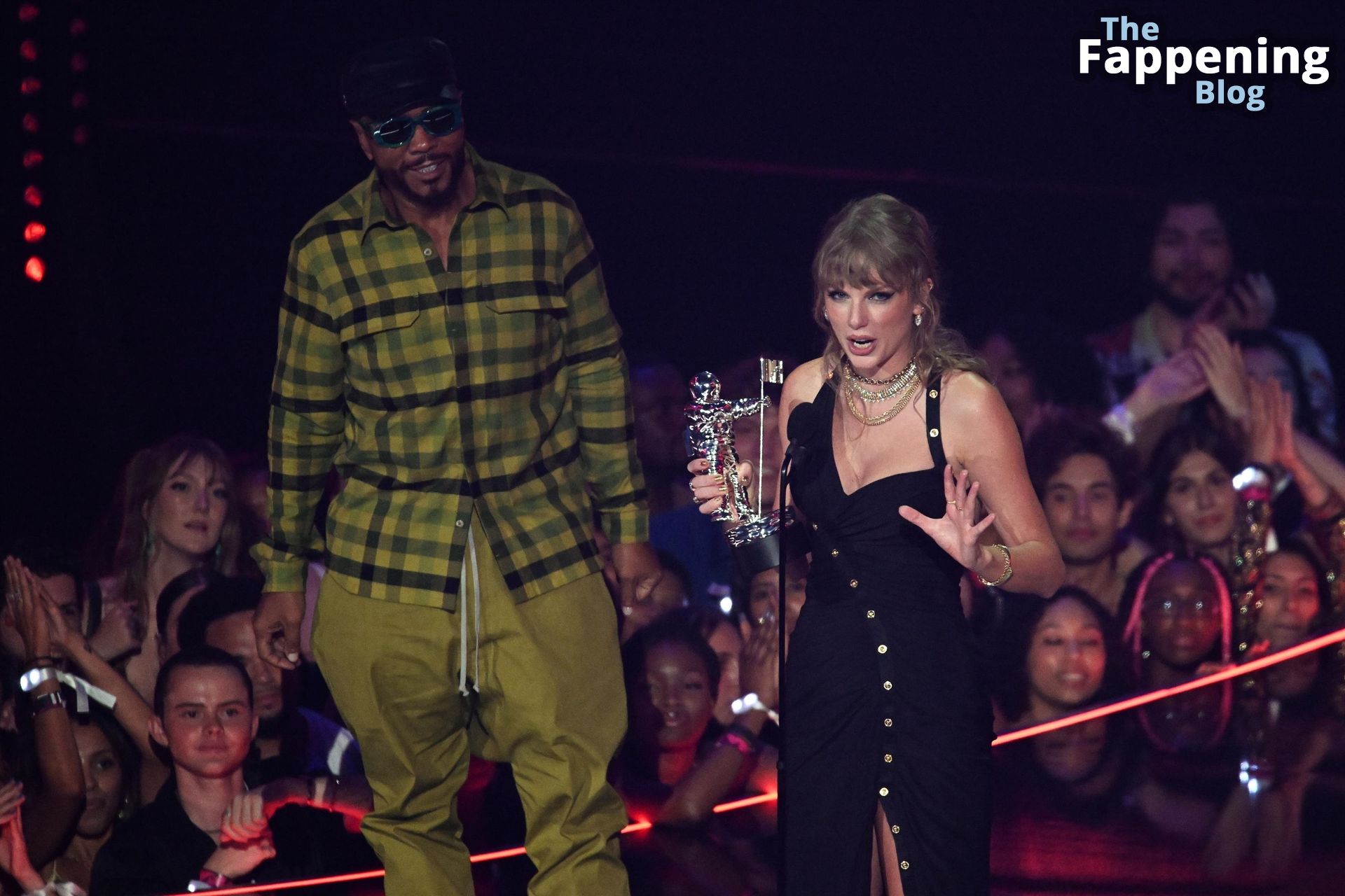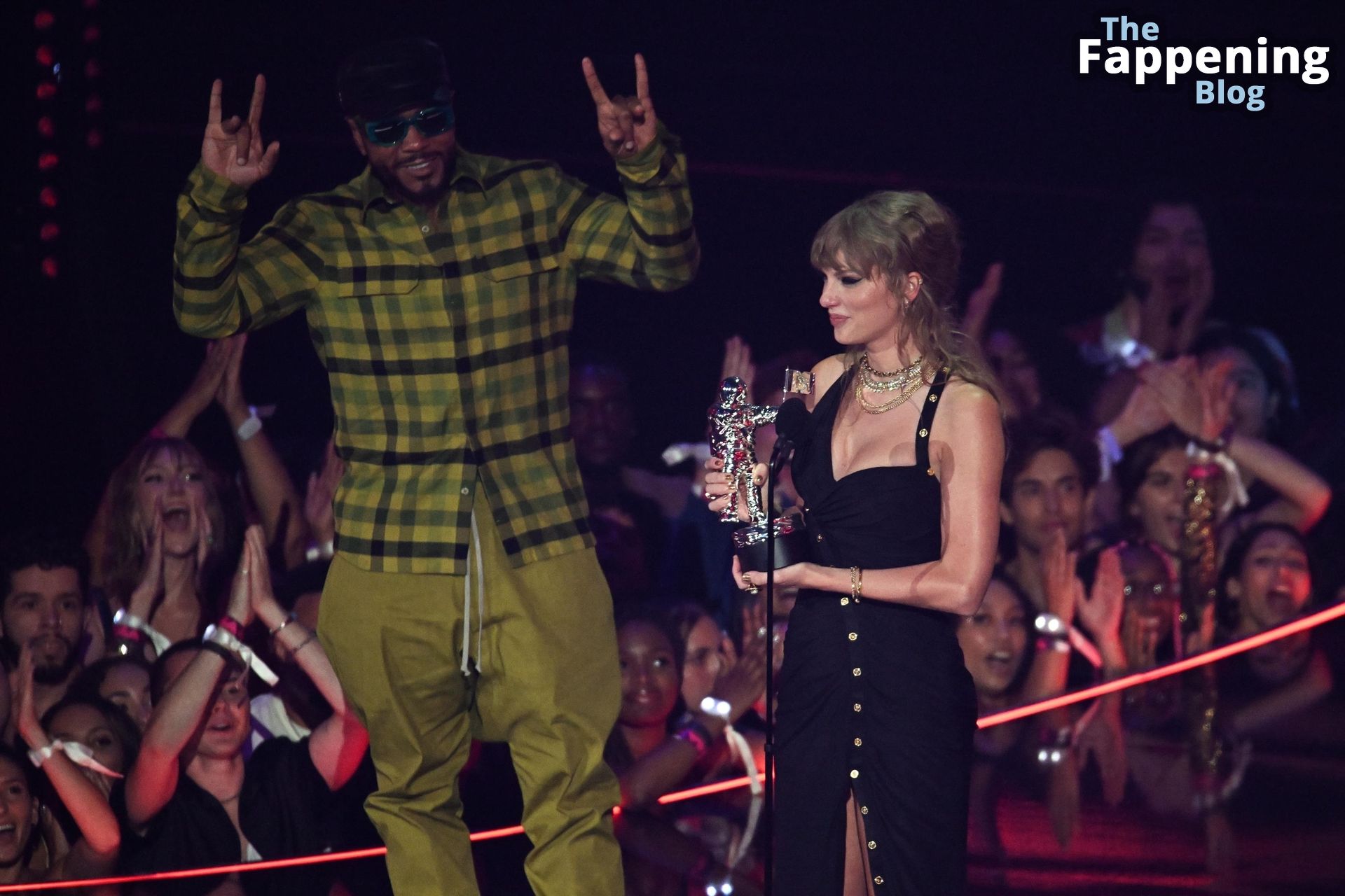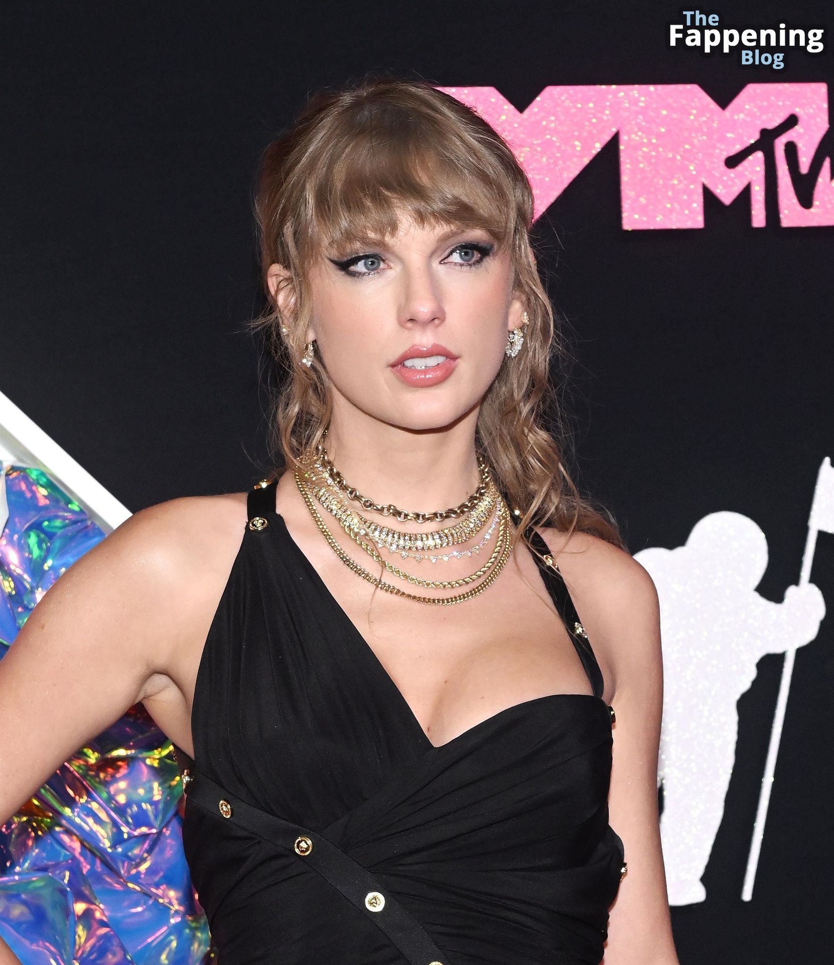 Taylor Swift mostra le sue gambe killer, indossando un abito nero asimmetrico con uno spacco audace mentre porta a casa alcune grandi vittorie agli MTV Video Music Awards.