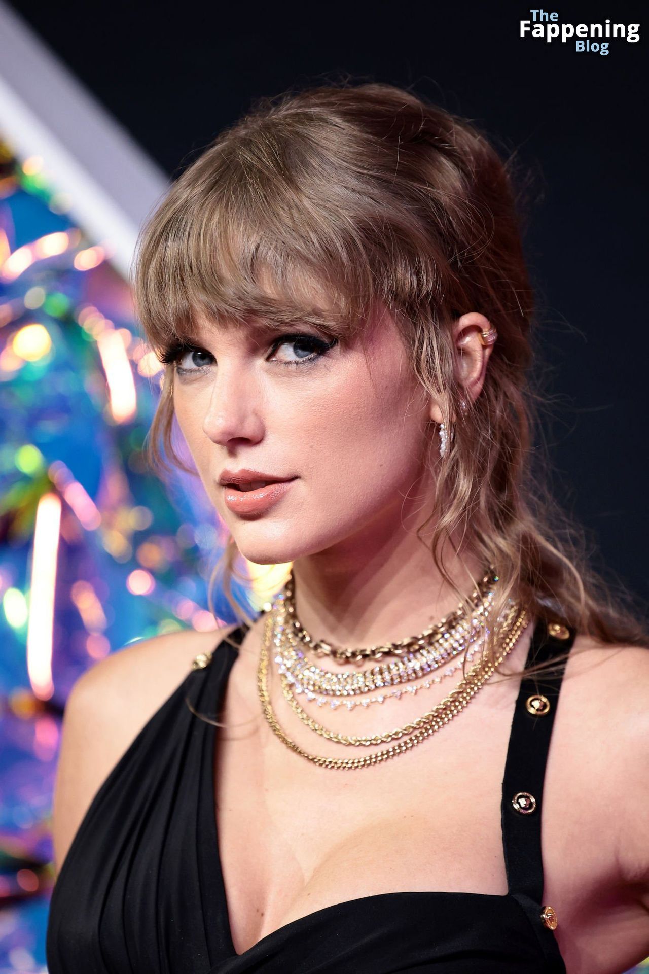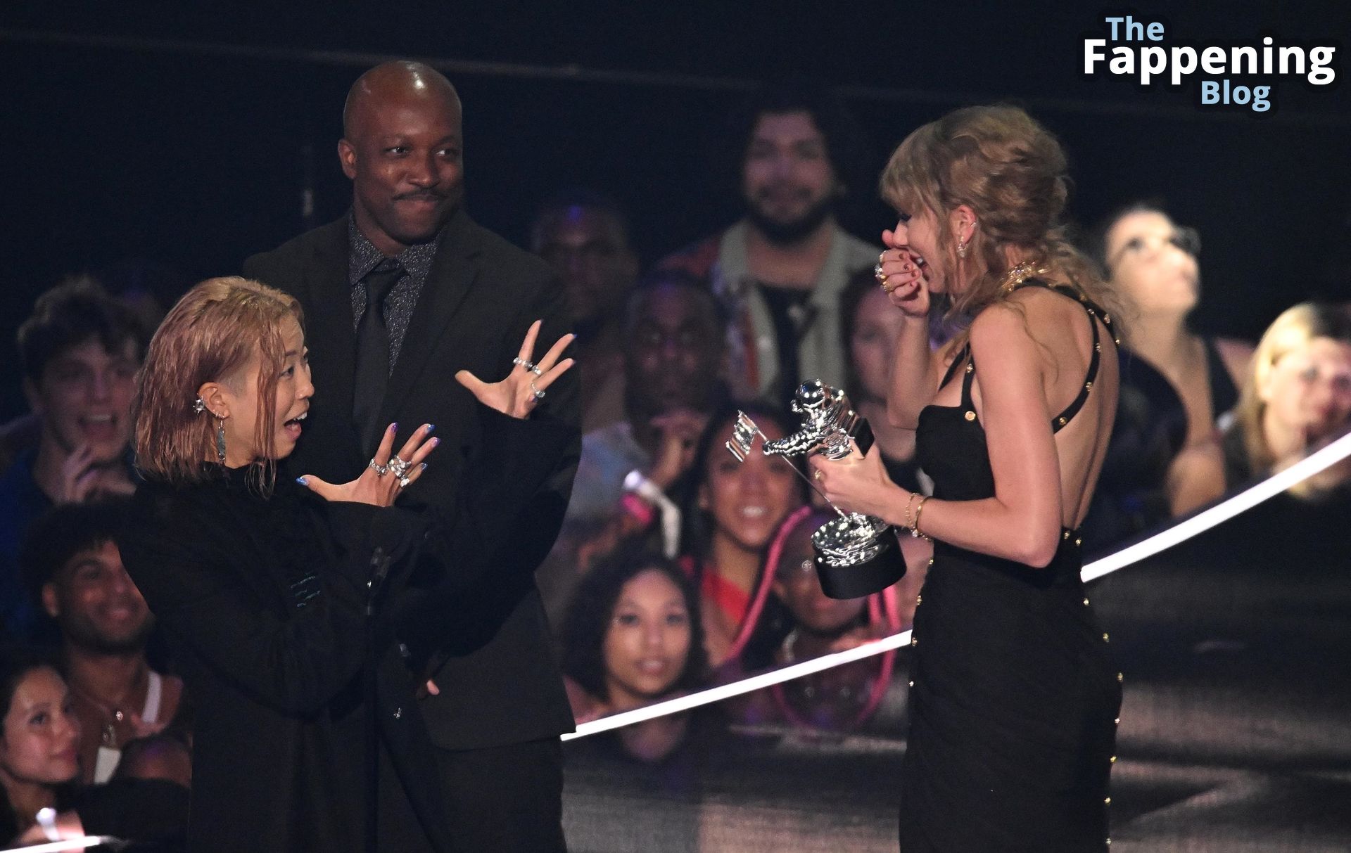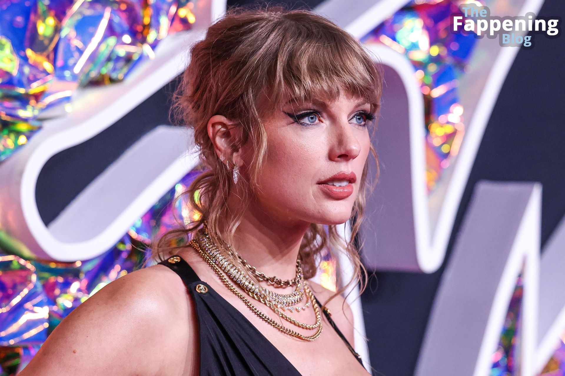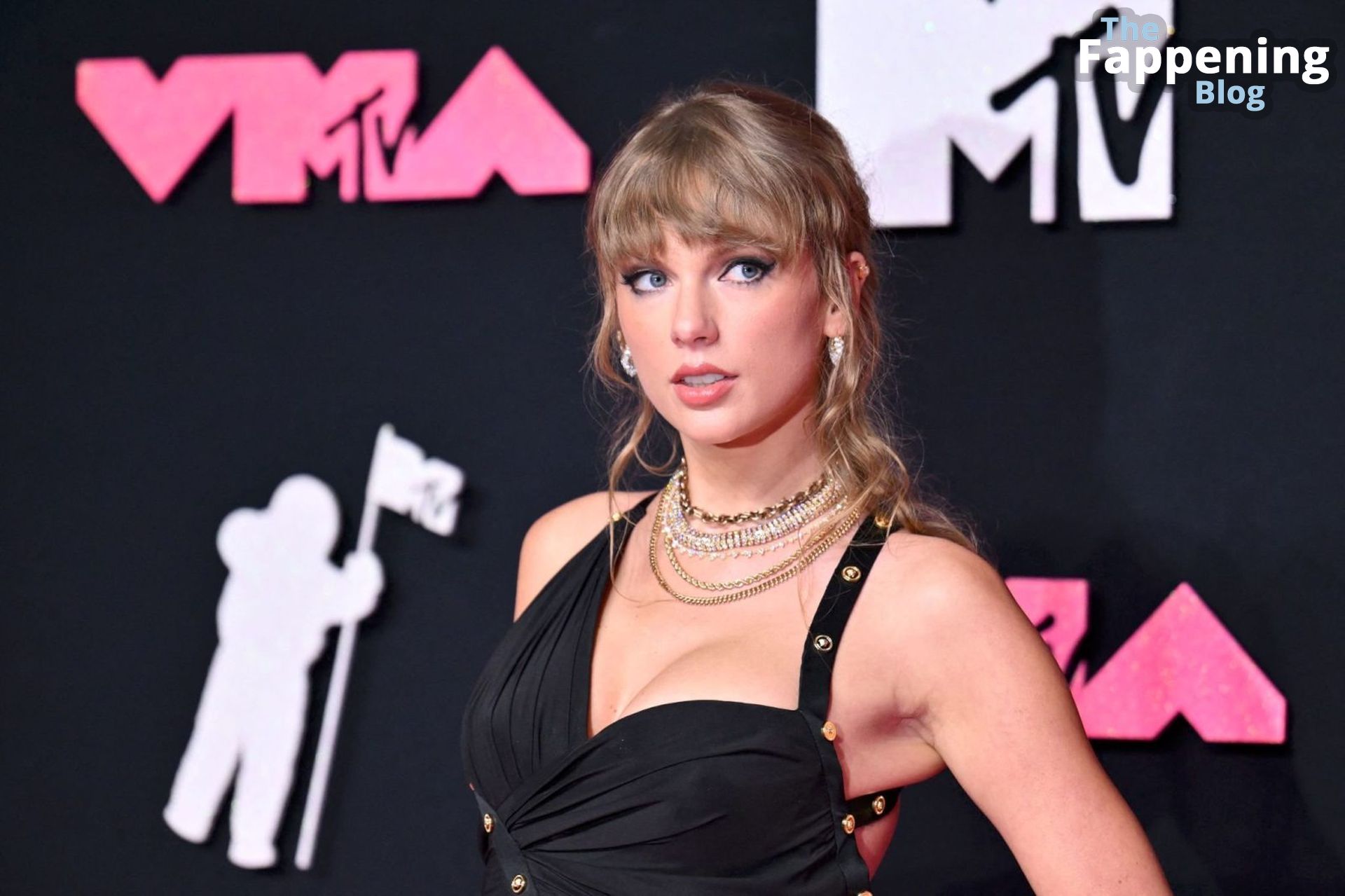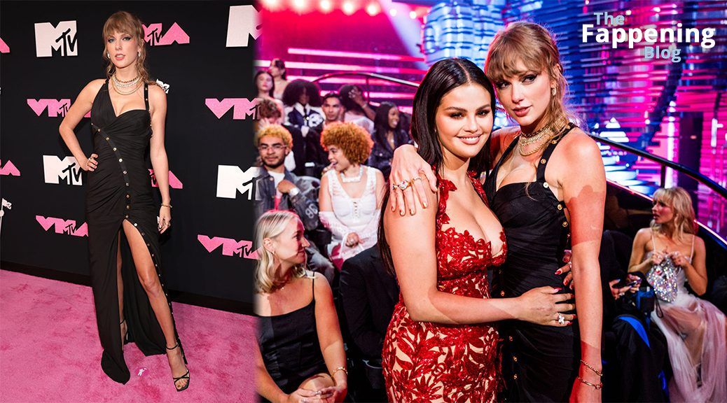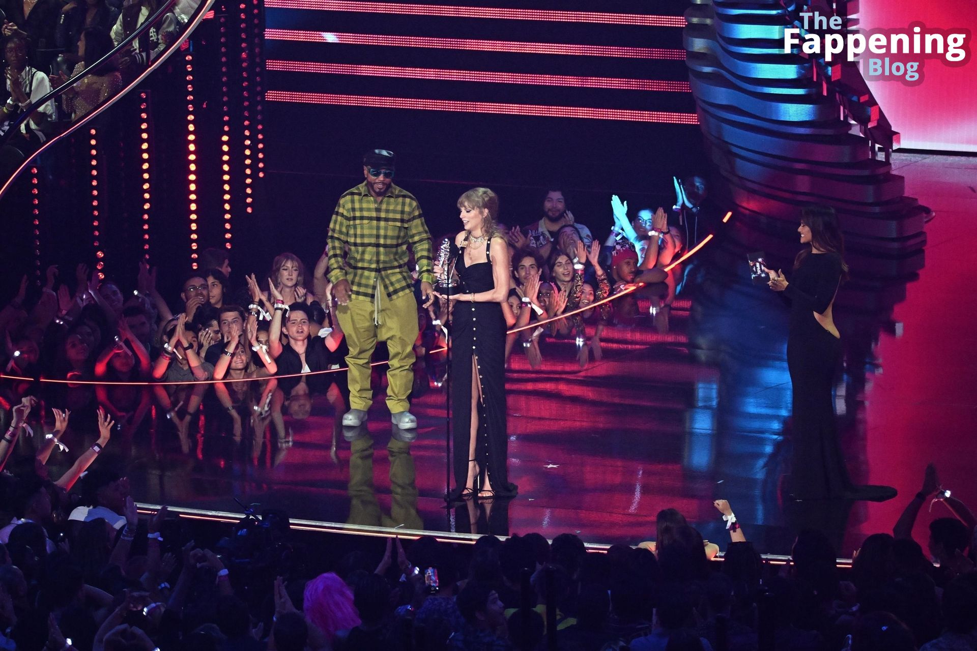 Taylor Swift mostra le sue gambe killer, indossando un abito nero asimmetrico con uno spacco audace mentre porta a casa alcune grandi vittorie agli MTV Video Music Awards.