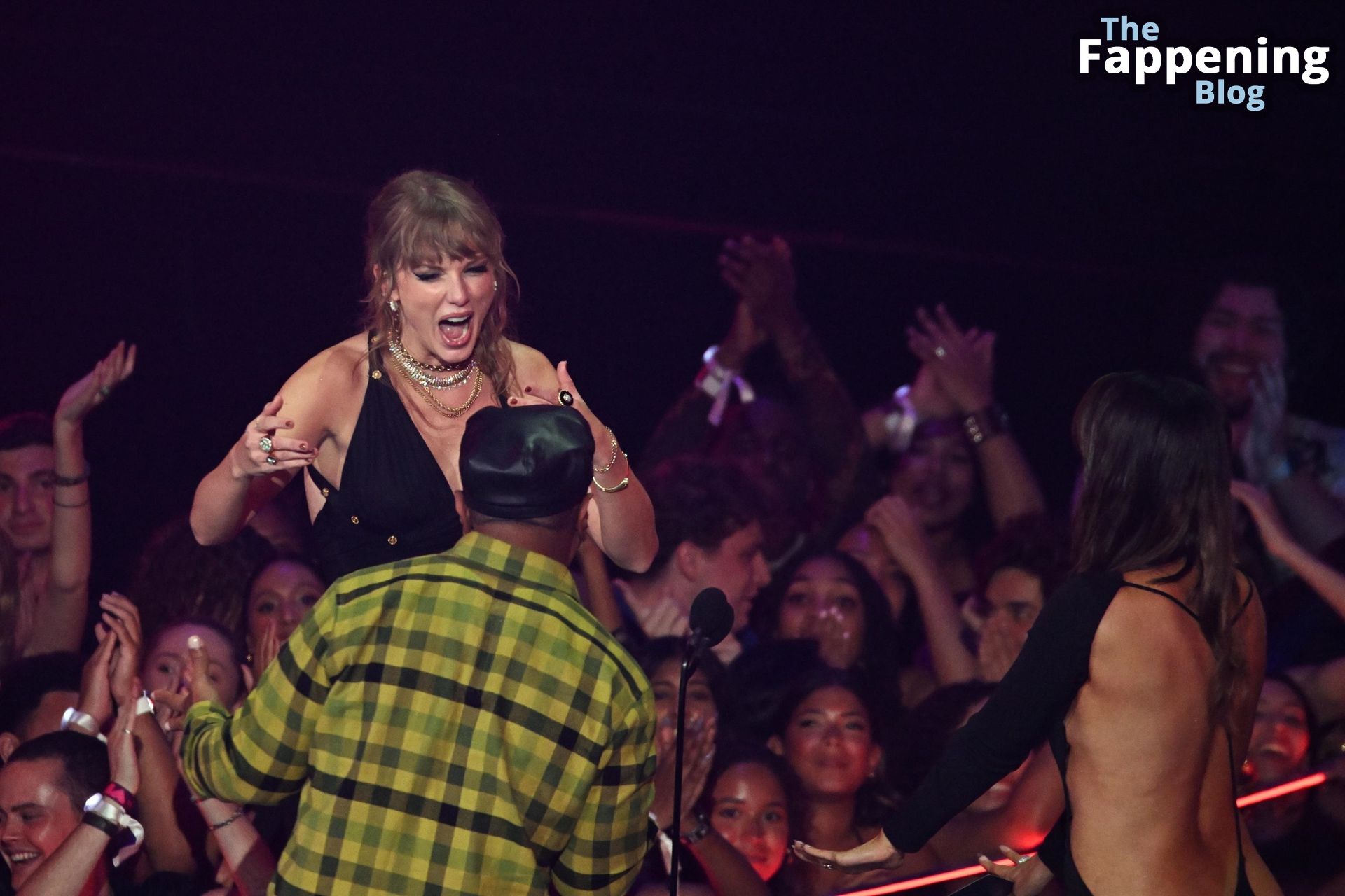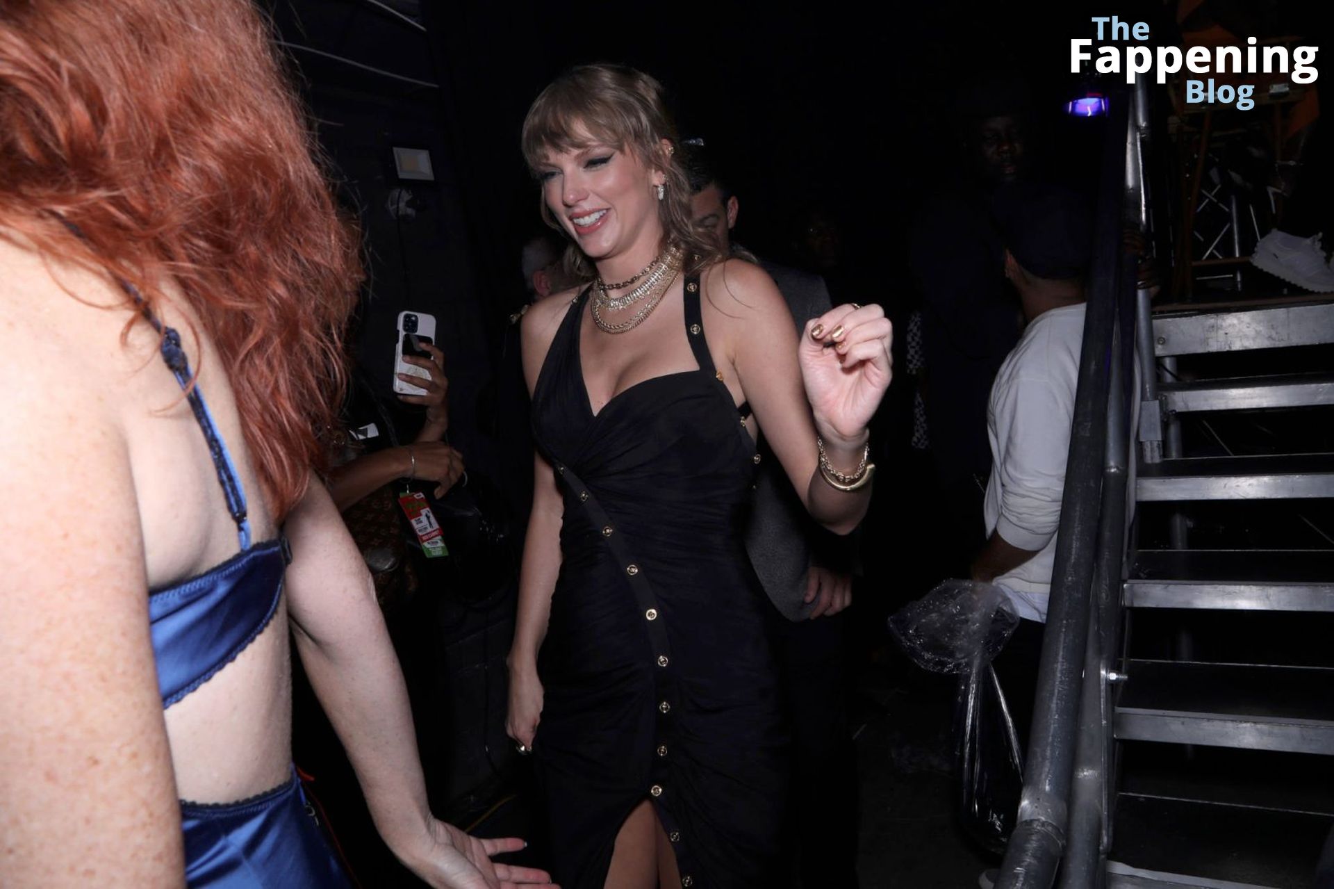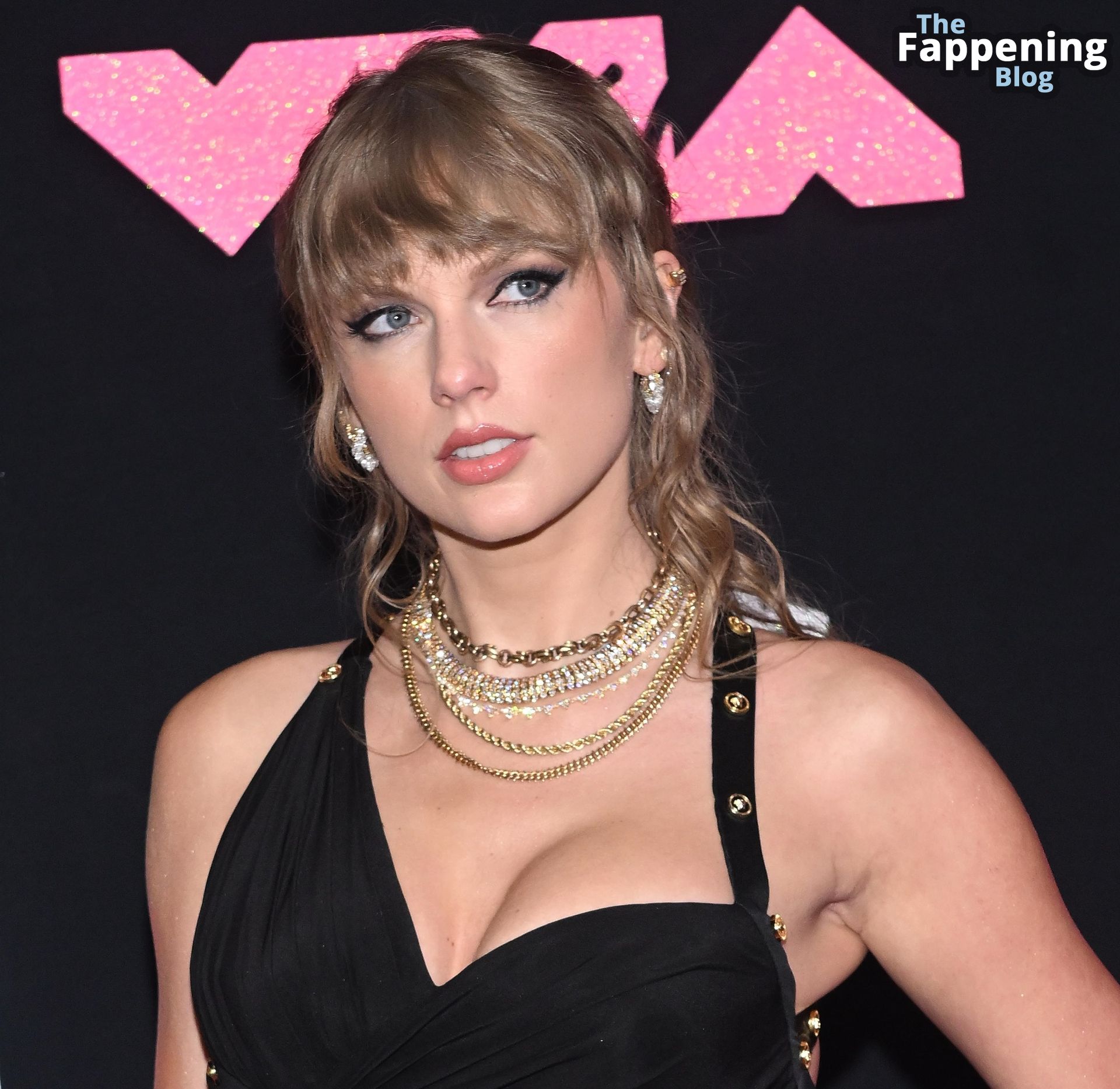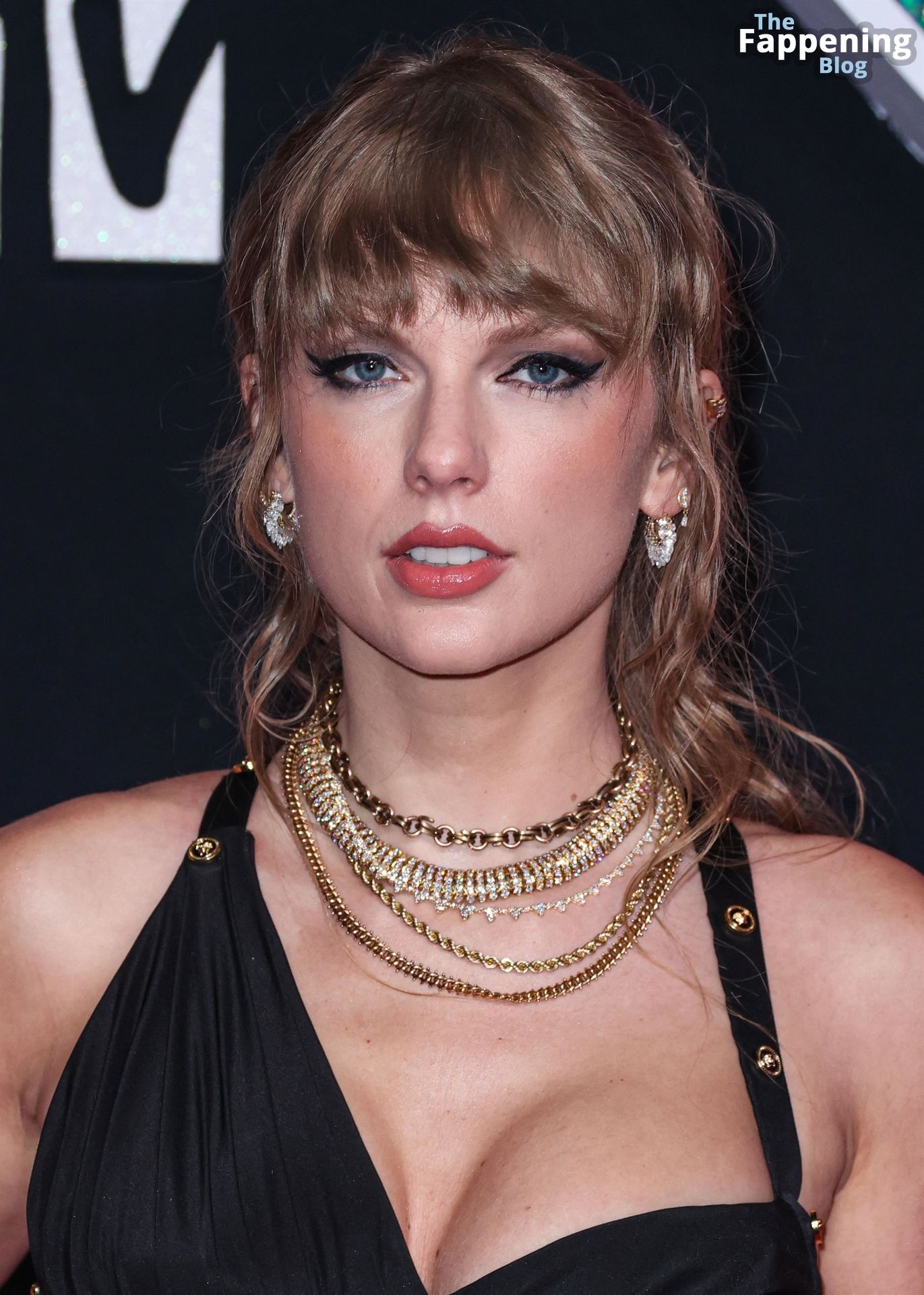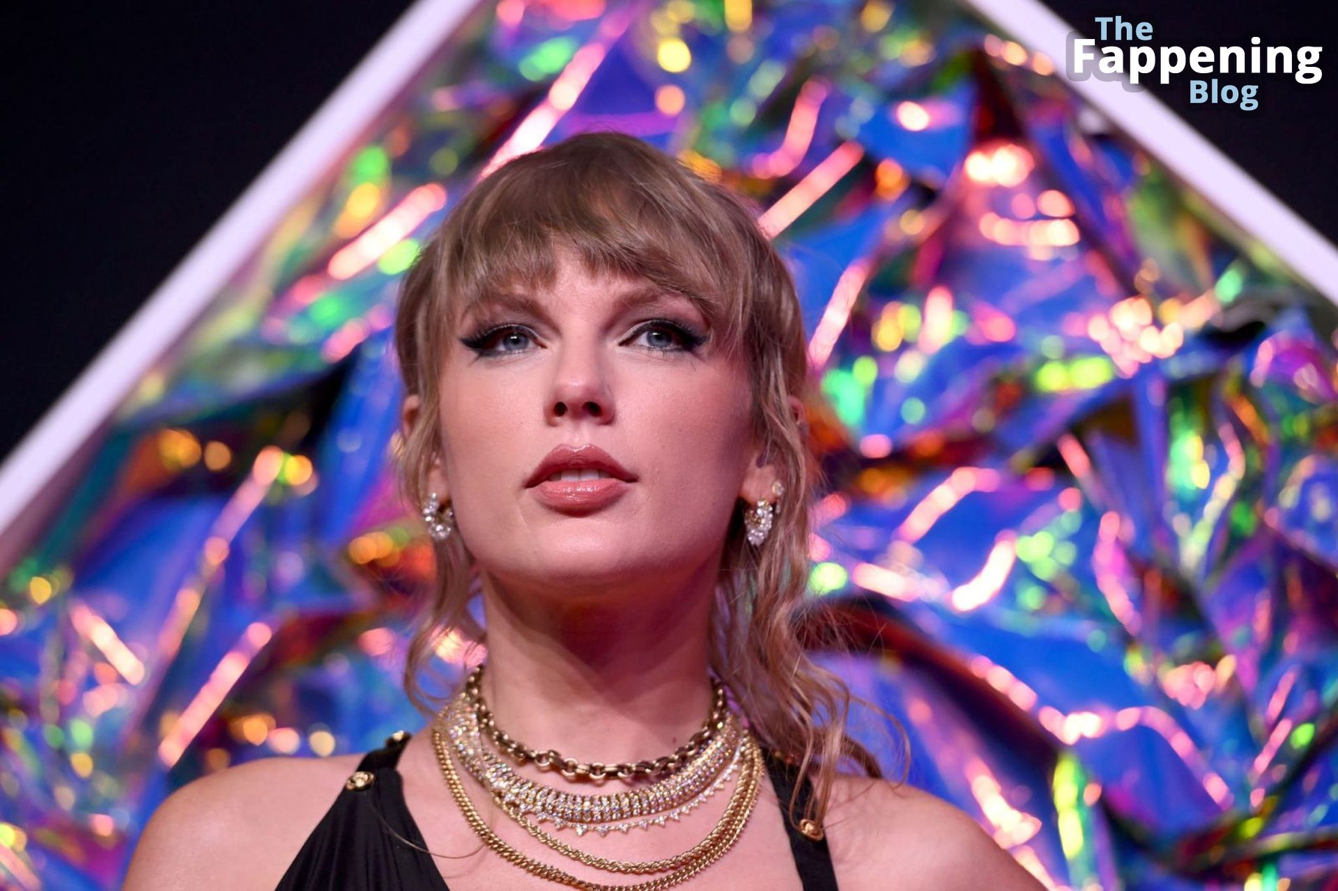 Taylor Swift mostra le sue gambe killer, indossando un abito nero asimmetrico con uno spacco audace mentre porta a casa alcune grandi vittorie agli MTV Video Music Awards.