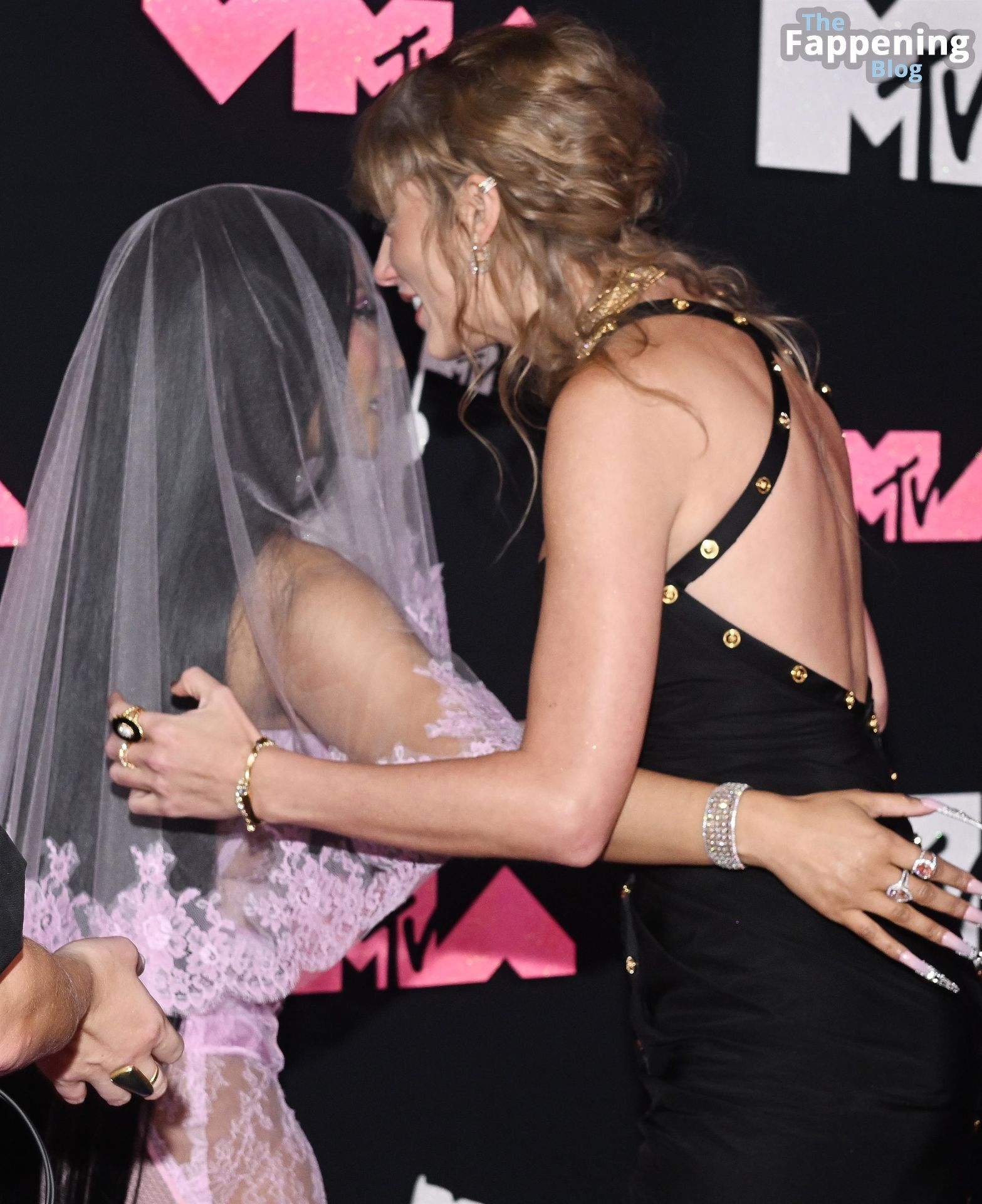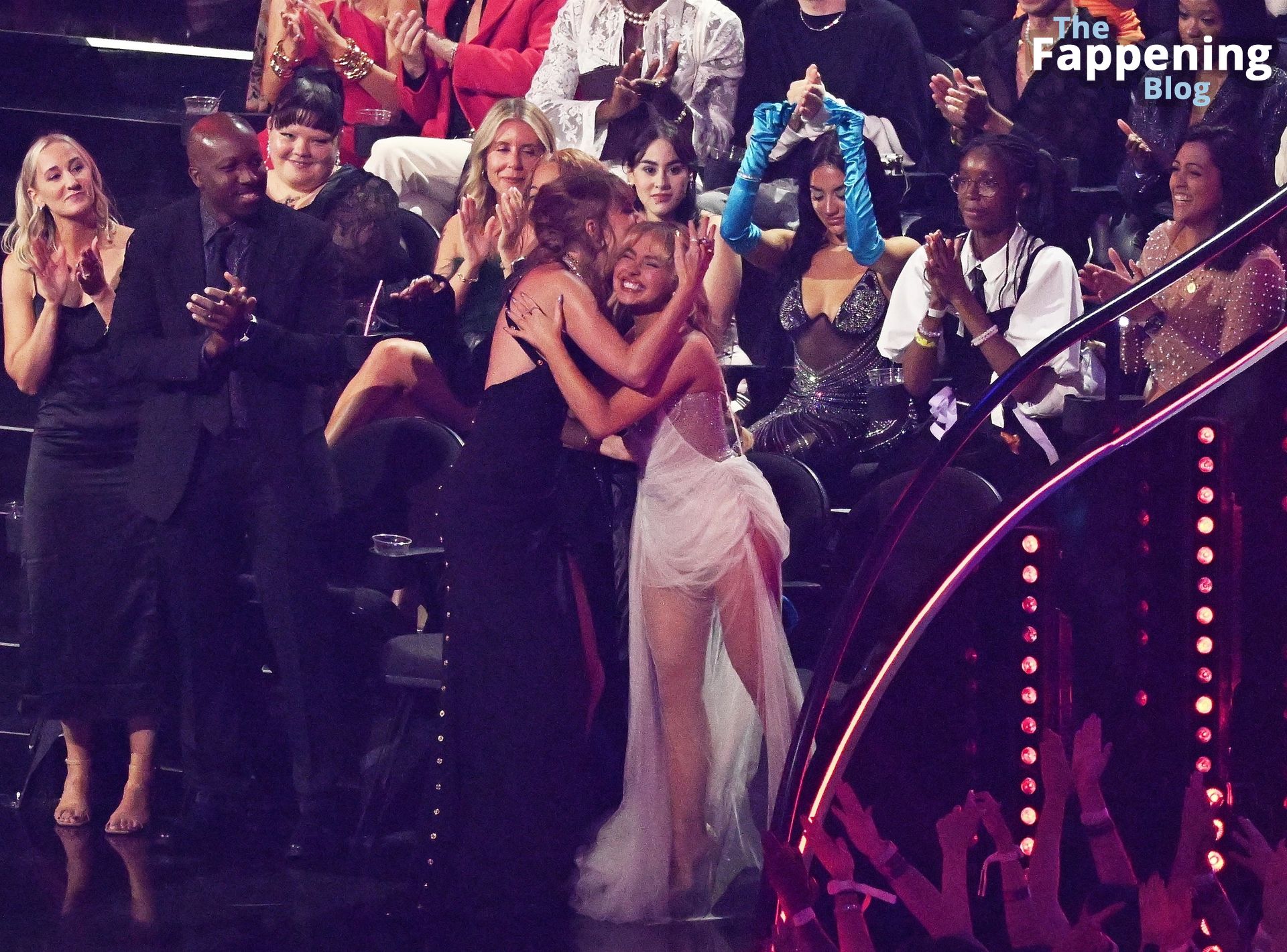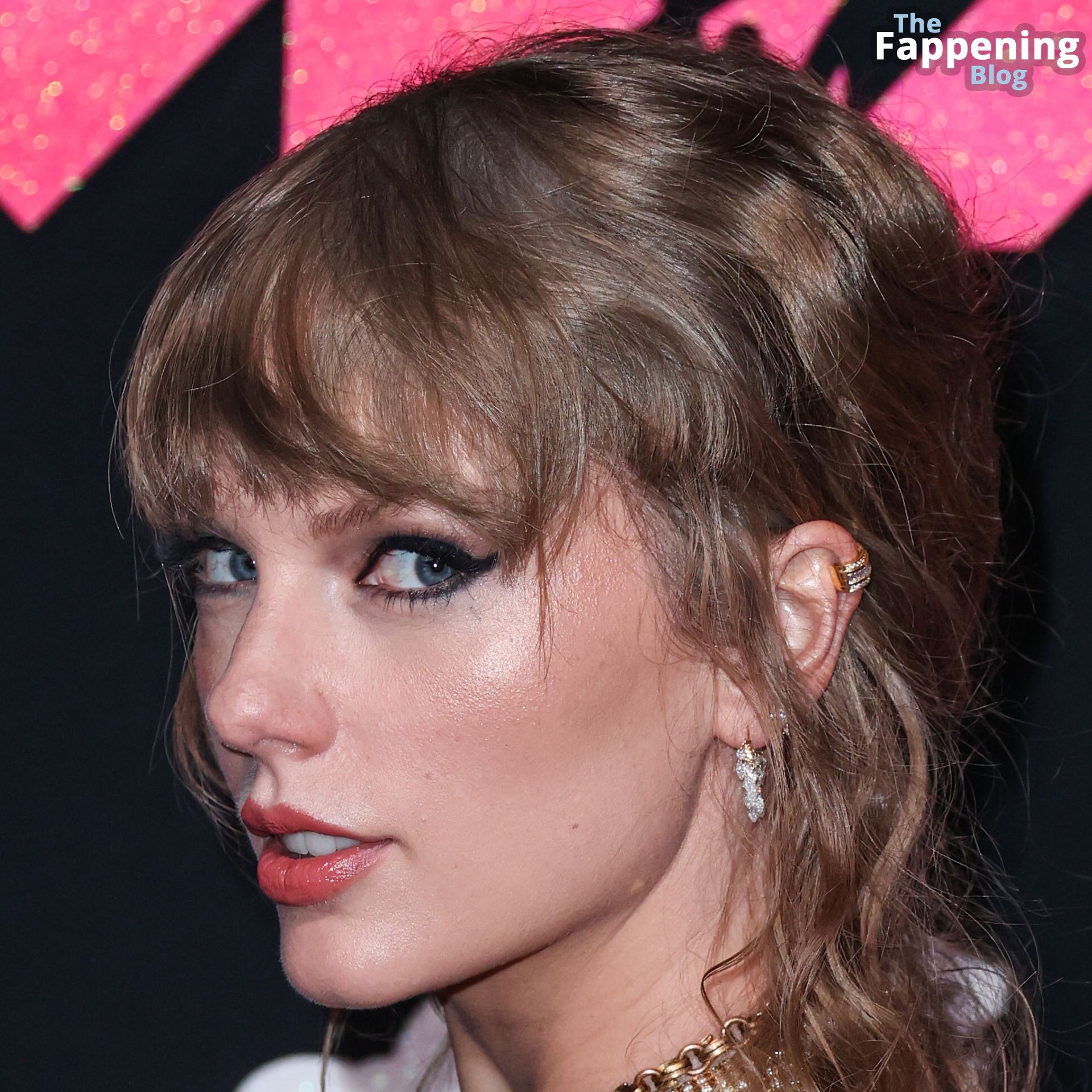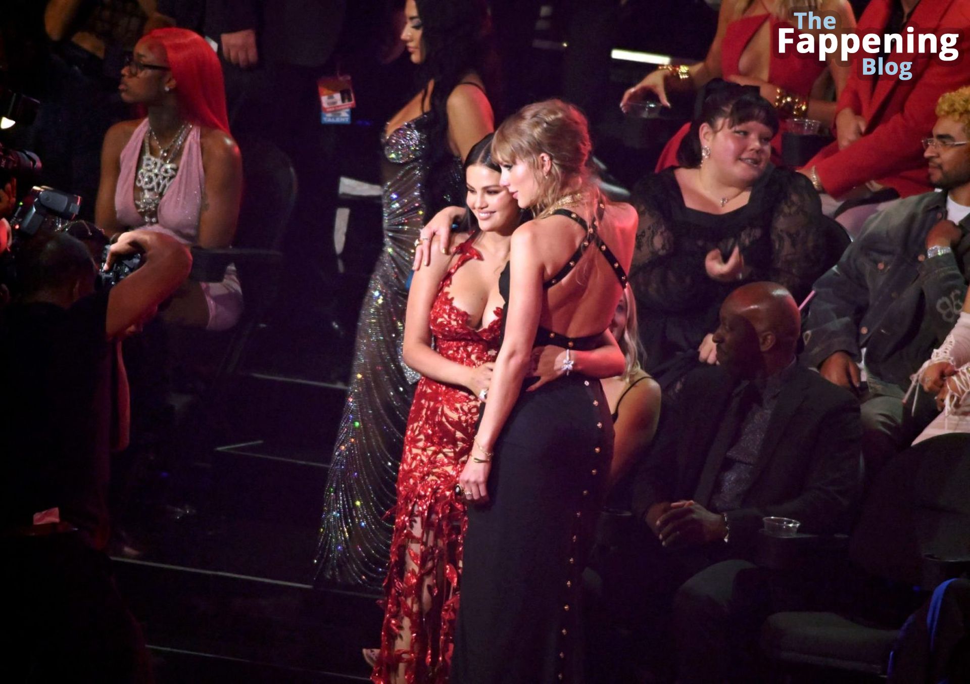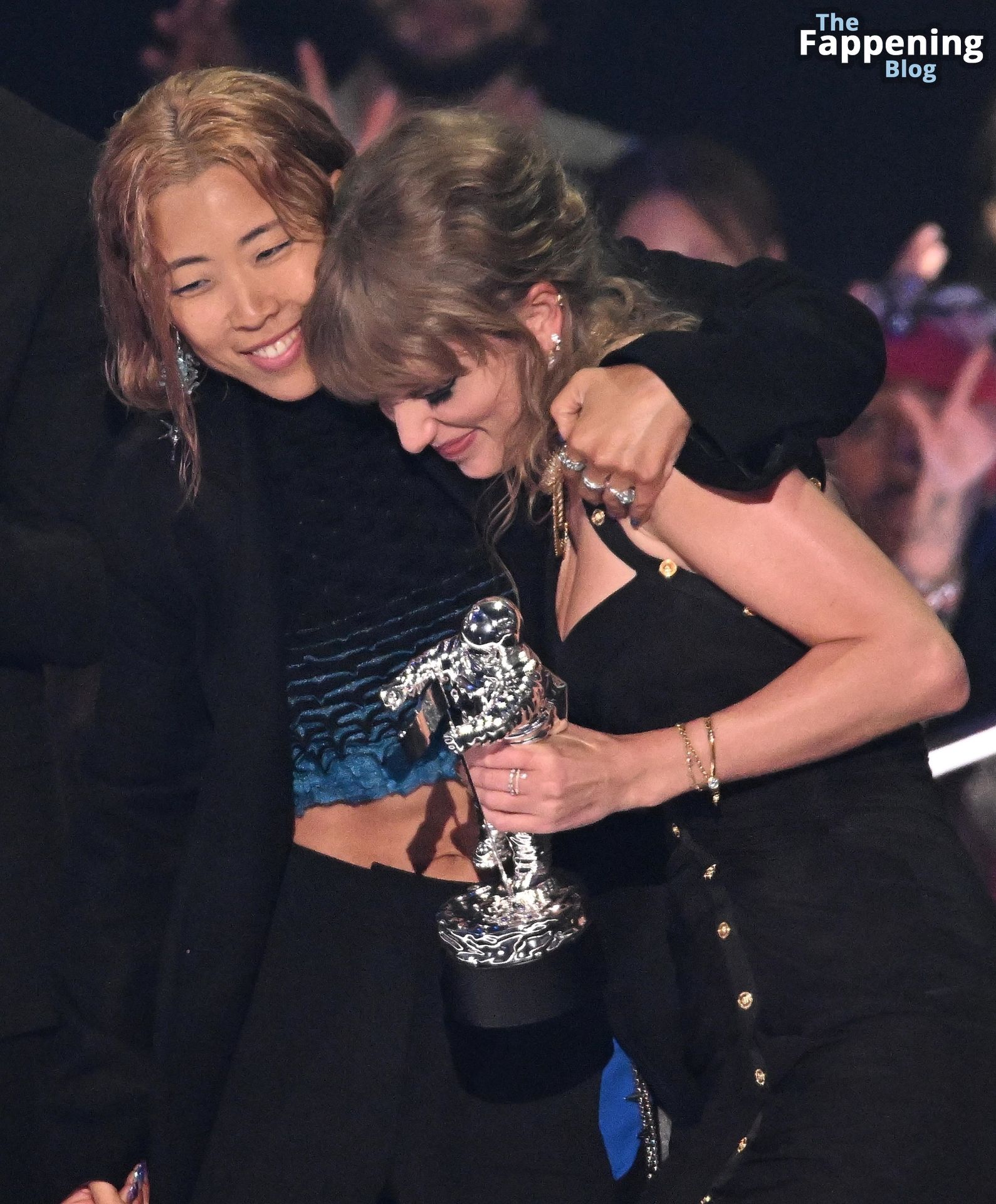 Taylor Swift mostra le sue gambe killer, indossando un abito nero asimmetrico con uno spacco audace mentre porta a casa alcune grandi vittorie agli MTV Video Music Awards.