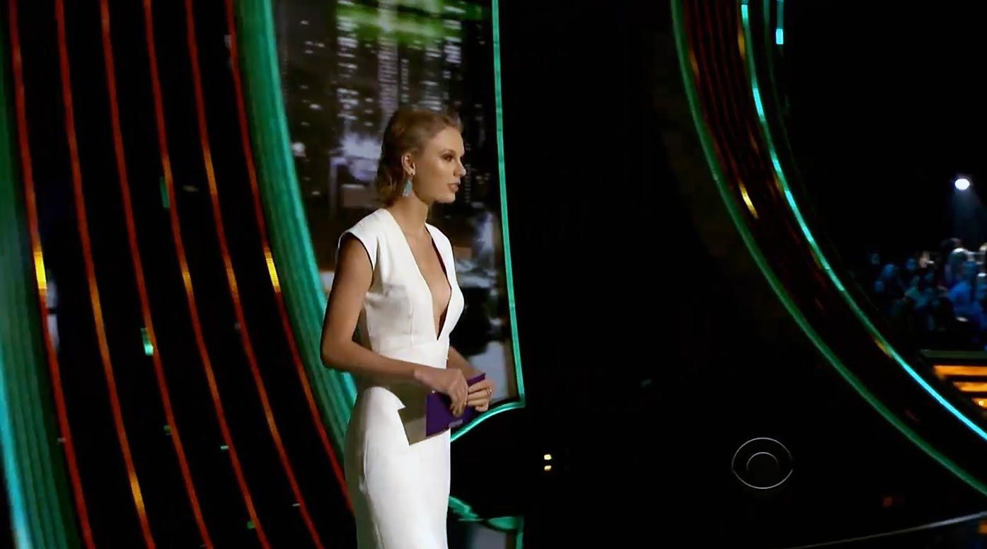 Taylor Swift takes the stage in a white dress with a cleavage-bearing split down the middle as she delivers an award to Jennifer Lawrence, who is dressed in a shimmering black gown. From the People’s Choice Awards in 2013.