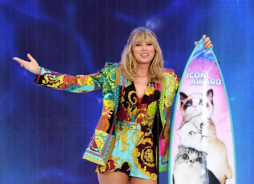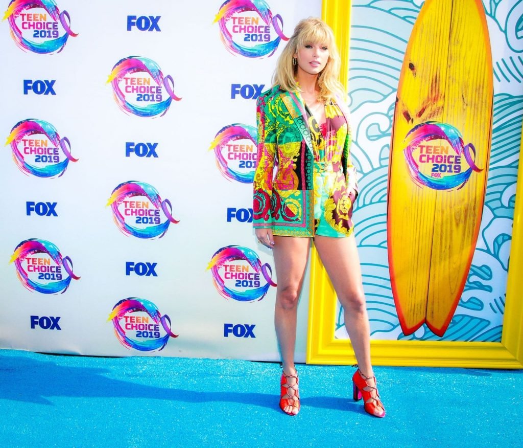 La cantante slanciata Taylor Swift indossava un body Versace, pantaloncini e blazer con scarpe Kat Maconie, orecchini Misahara e anelli di Irene Neuwirth, VRAM e Emily P Wheeler arriva ai Teen Choice Awards 2019 di FOX tenutisi al Hermosa Beach Pier Plaza a Hermosa Beach, 08/11/2019.