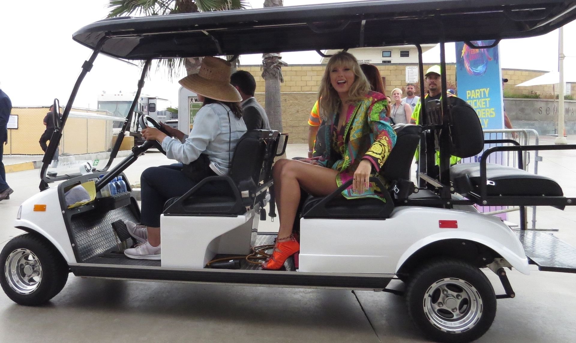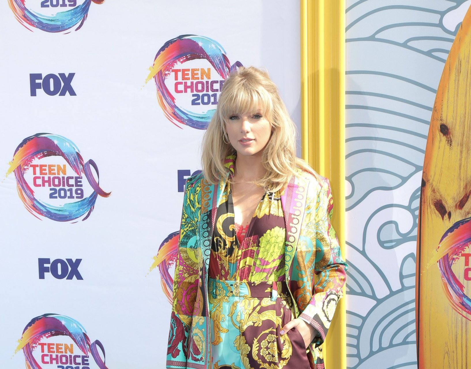 La cantante slanciata Taylor Swift indossava un body Versace, pantaloncini e blazer con scarpe Kat Maconie, orecchini Misahara e anelli di Irene Neuwirth, VRAM e Emily P Wheeler arriva ai Teen Choice Awards 2019 di FOX tenutisi al Hermosa Beach Pier Plaza a Hermosa Beach, 08/11/2019.