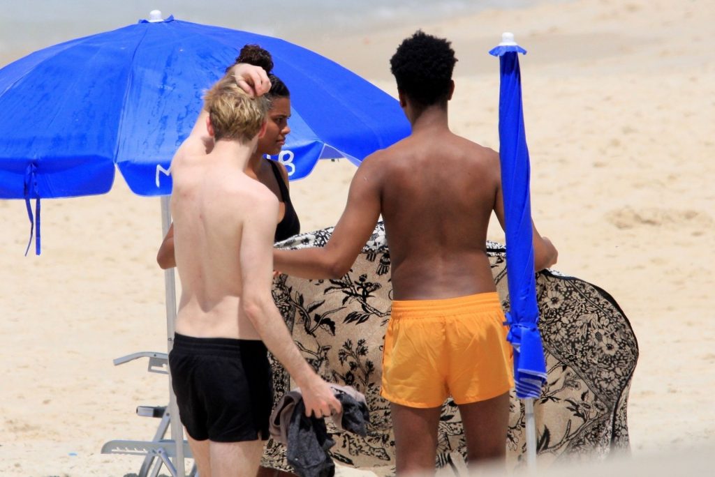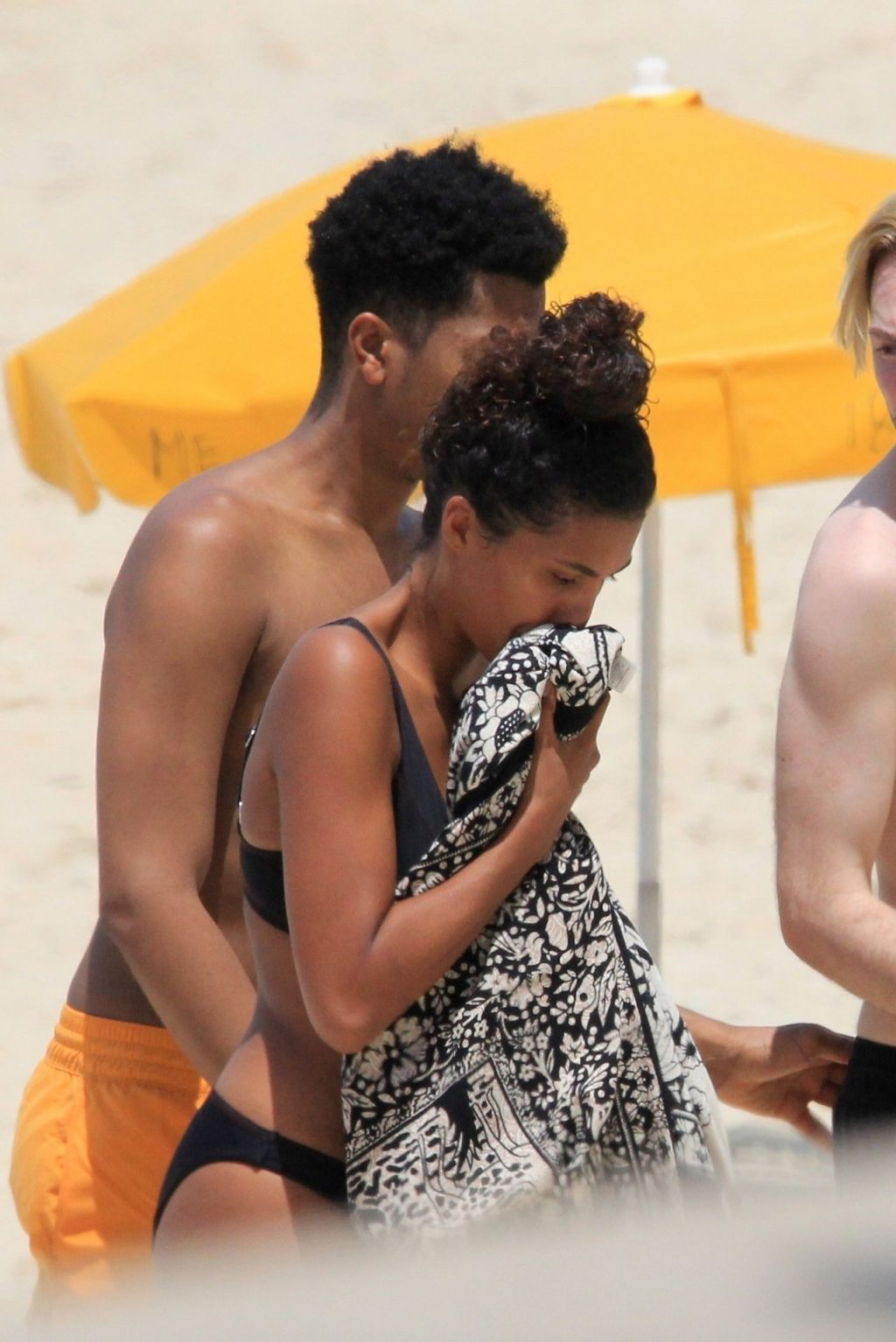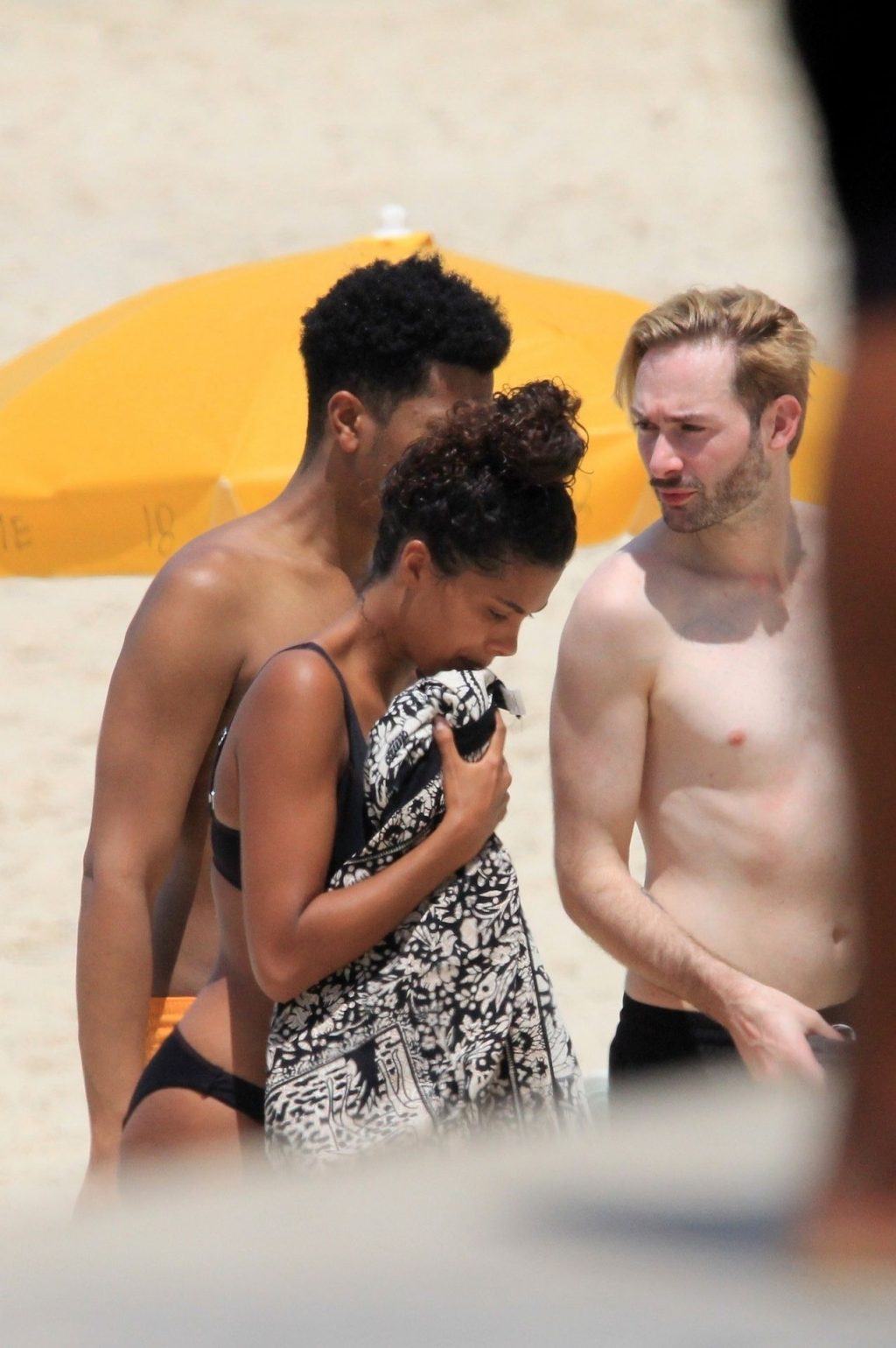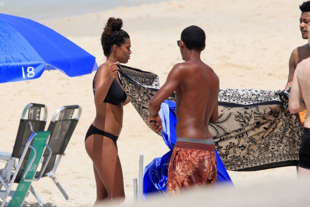 La moglie modella di Vincent Cassel, Tina Kunakey, è accompagnata da due amiche per una giornata in spiaggia a Rio de Janeiro, 24/02/2020. La modella, indossando un bikini nero, piega un asciugamano da spiaggia prima di lasciare la spiaggia con le sue due amiche.
