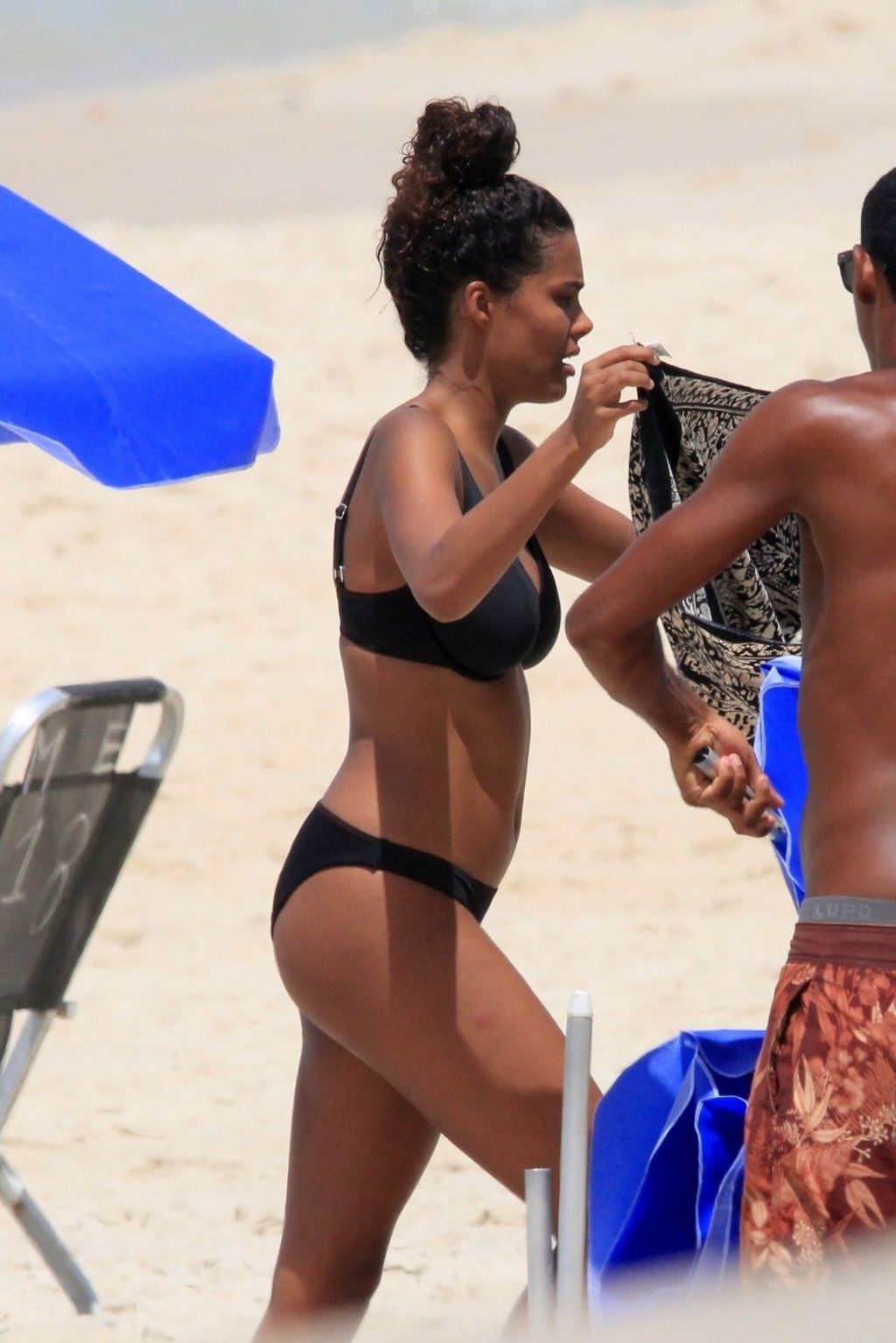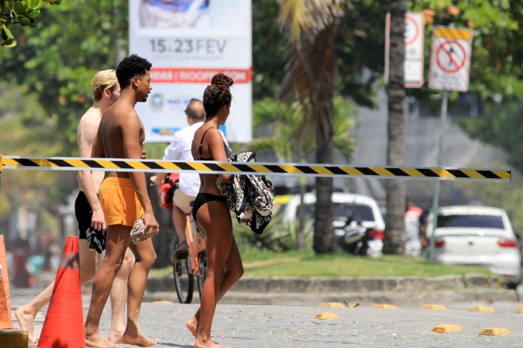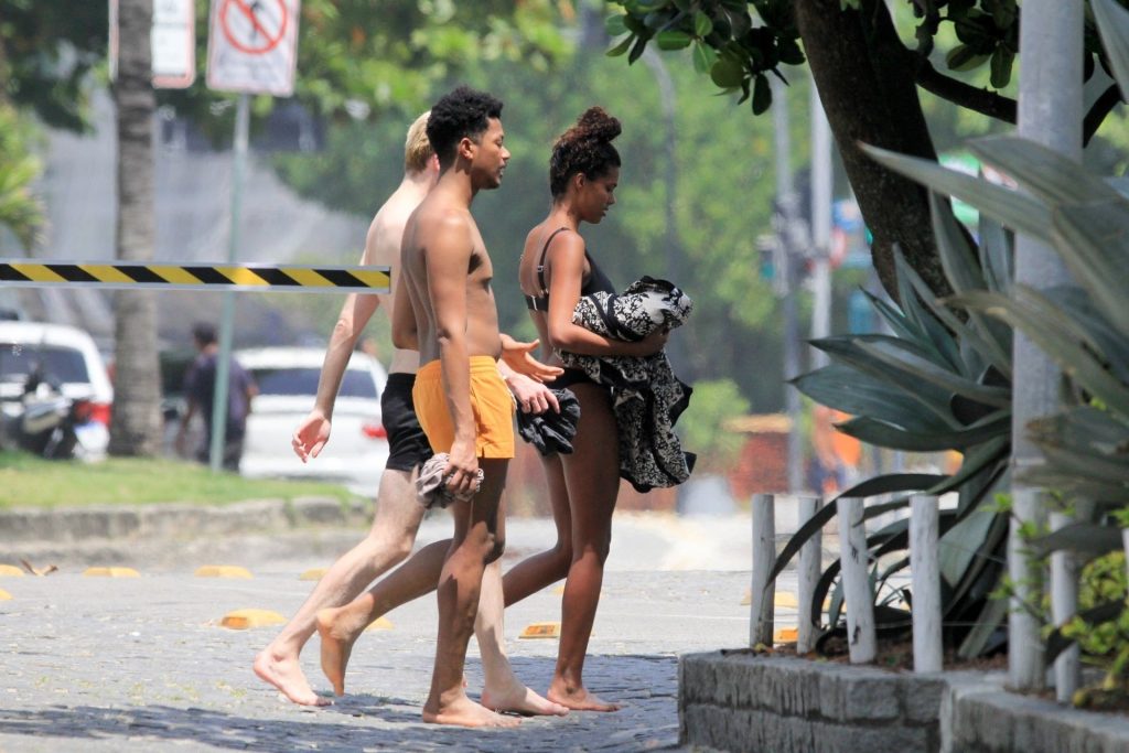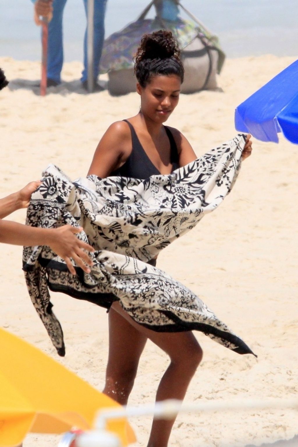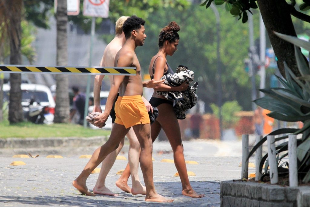 La moglie modella di Vincent Cassel, Tina Kunakey, è accompagnata da due amiche per una giornata in spiaggia a Rio de Janeiro, 24/02/2020. La modella, indossando un bikini nero, piega un asciugamano da spiaggia prima di lasciare la spiaggia con le sue due amiche.