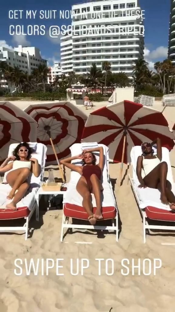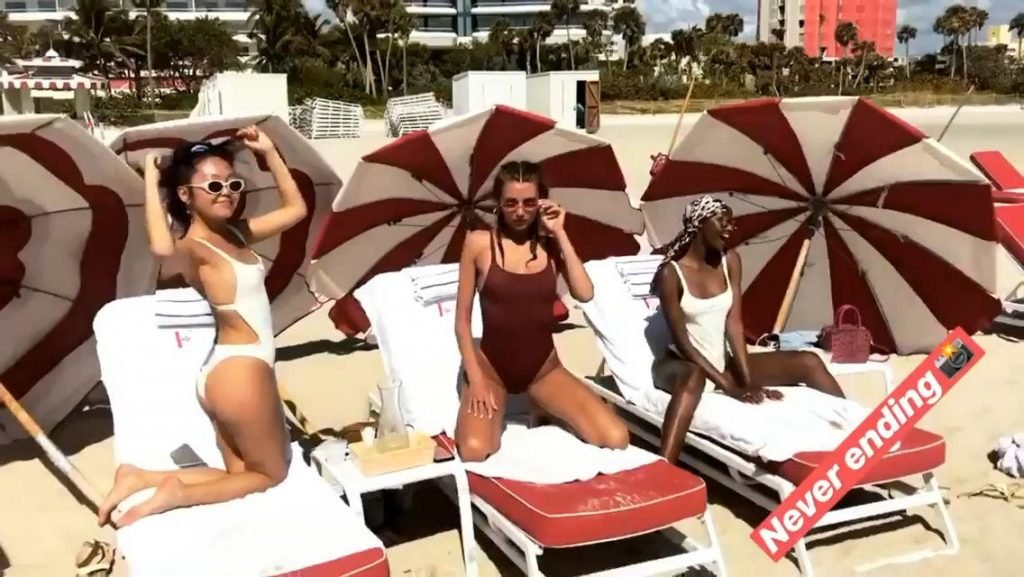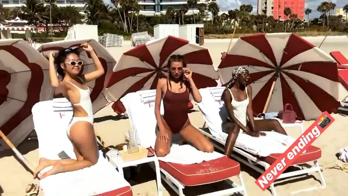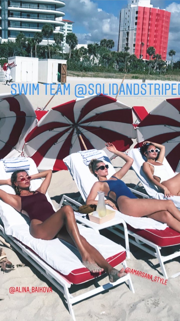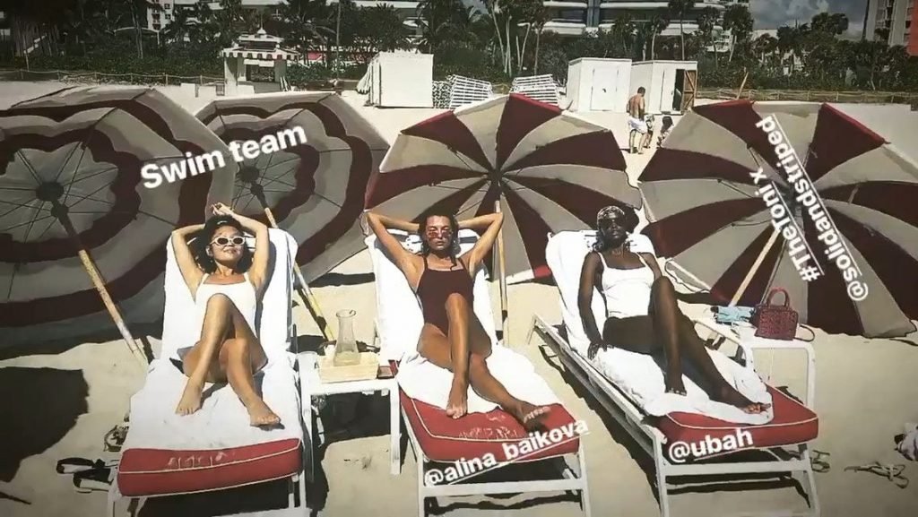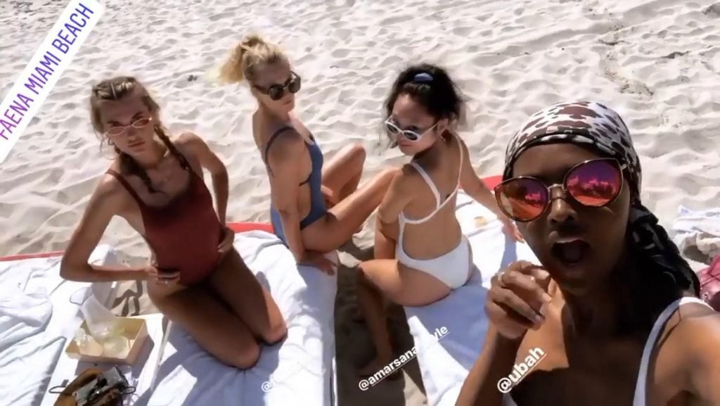 Models Toni Garrn, Alina Baikova, Ubah Hassan e la stylist di moda Amarsana Gendunova indossano bikini abbinati sulla spiaggia di Miami, 04/02/2018.