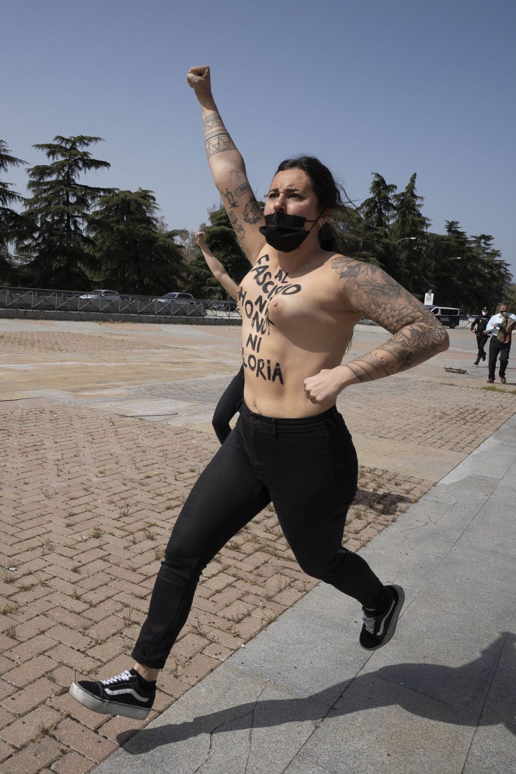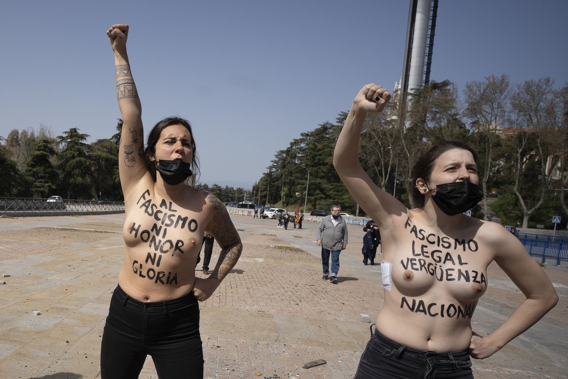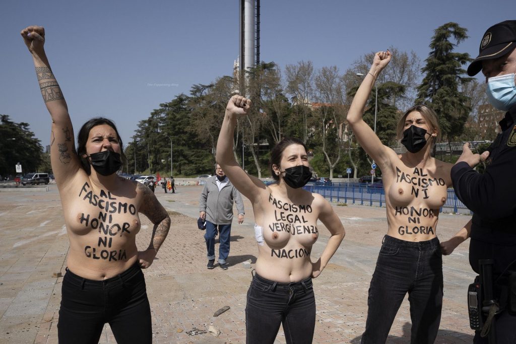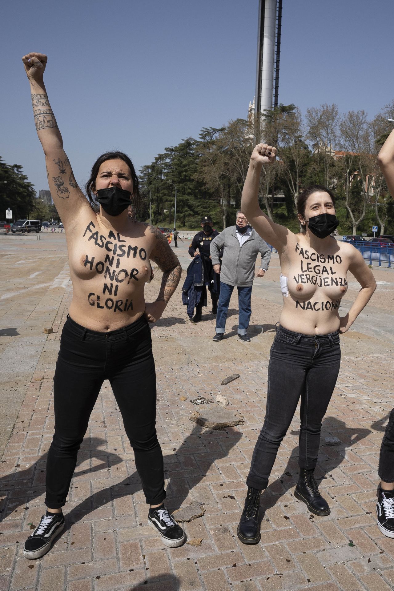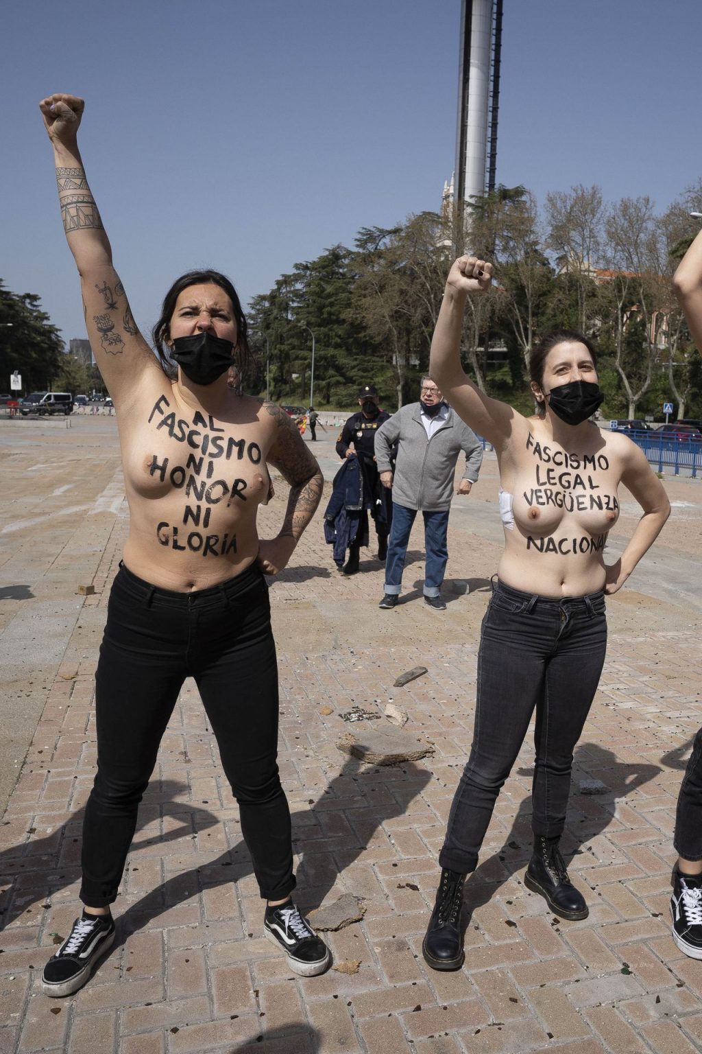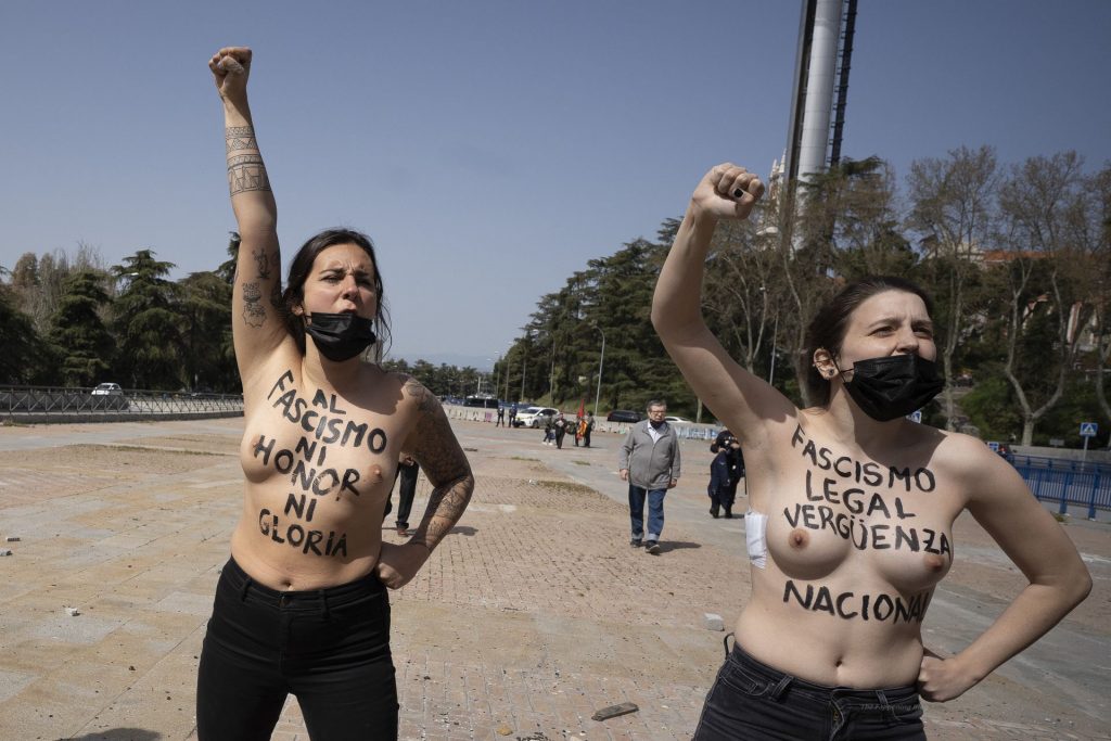 Attiviste di Femen con dipinti sui loro corpi che recitano: ‘Nessun onore al fascismo’ e aquile di Franco disegnate sulle loro schiene durante un evento per il Giorno della Vittoria nell’82° Anniversario della “Liberazione di Madrid”, all’Arco della Vittoria, a Madrid, Spagna, 28/03/2021.
