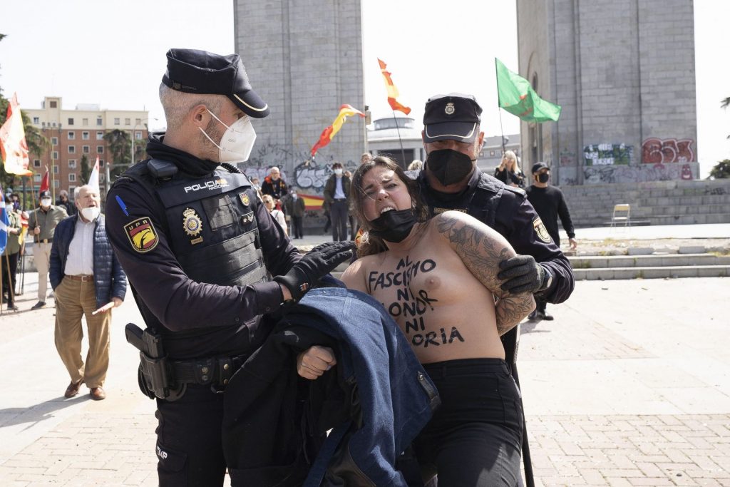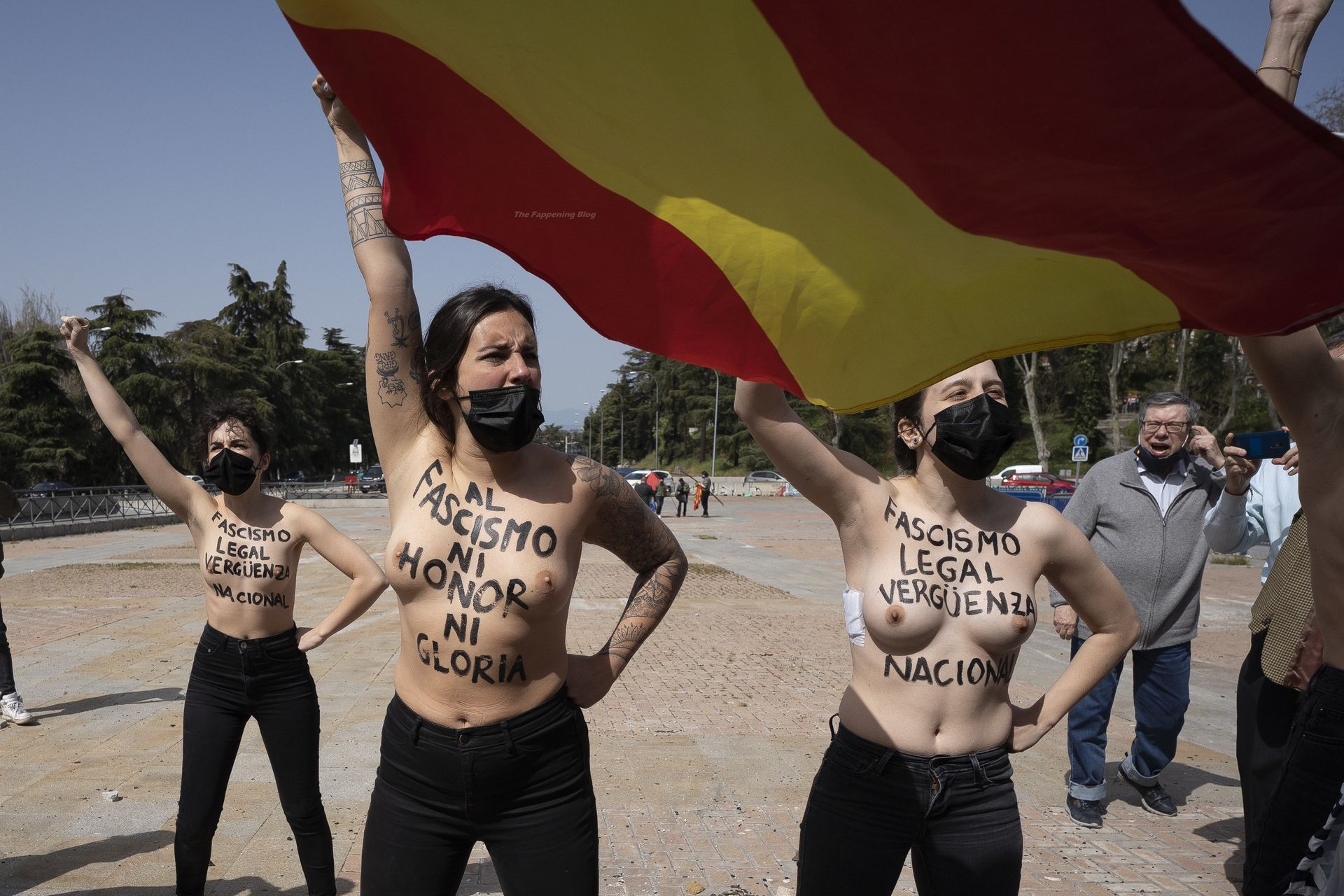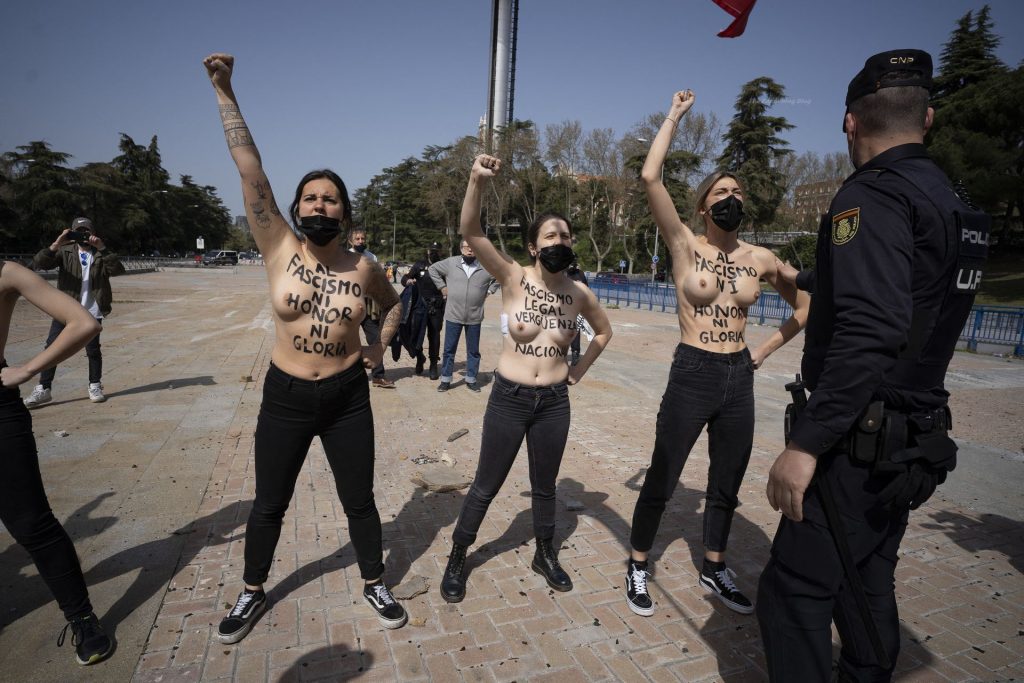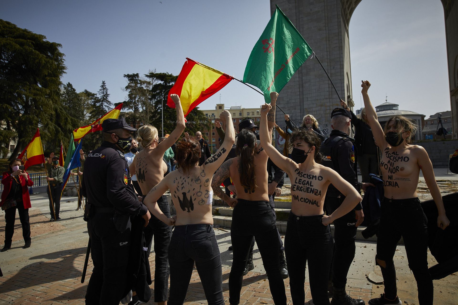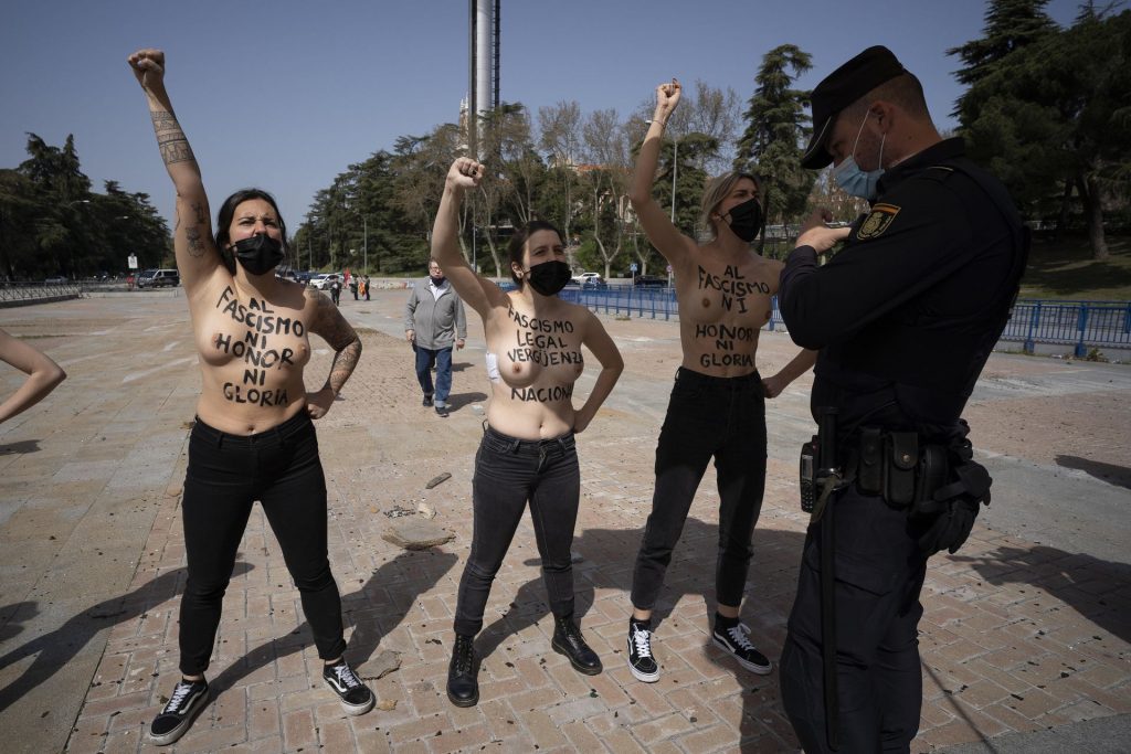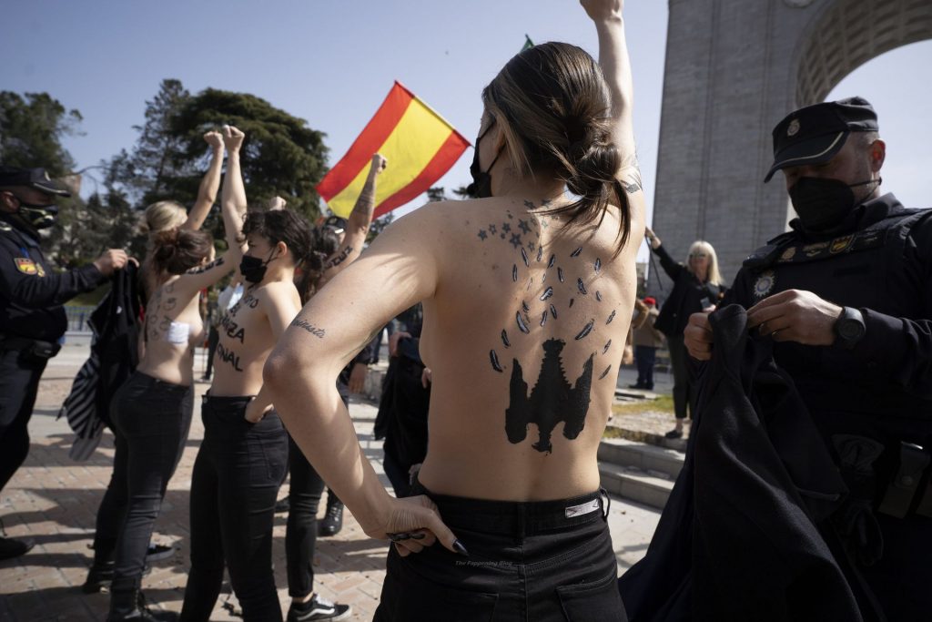 Attiviste di Femen con dipinti sui loro corpi che recitano: ‘Nessun onore al fascismo’ e aquile di Franco disegnate sulle loro schiene durante un evento per il Giorno della Vittoria nell’82° Anniversario della “Liberazione di Madrid”, all’Arco della Vittoria, a Madrid, Spagna, 28/03/2021.