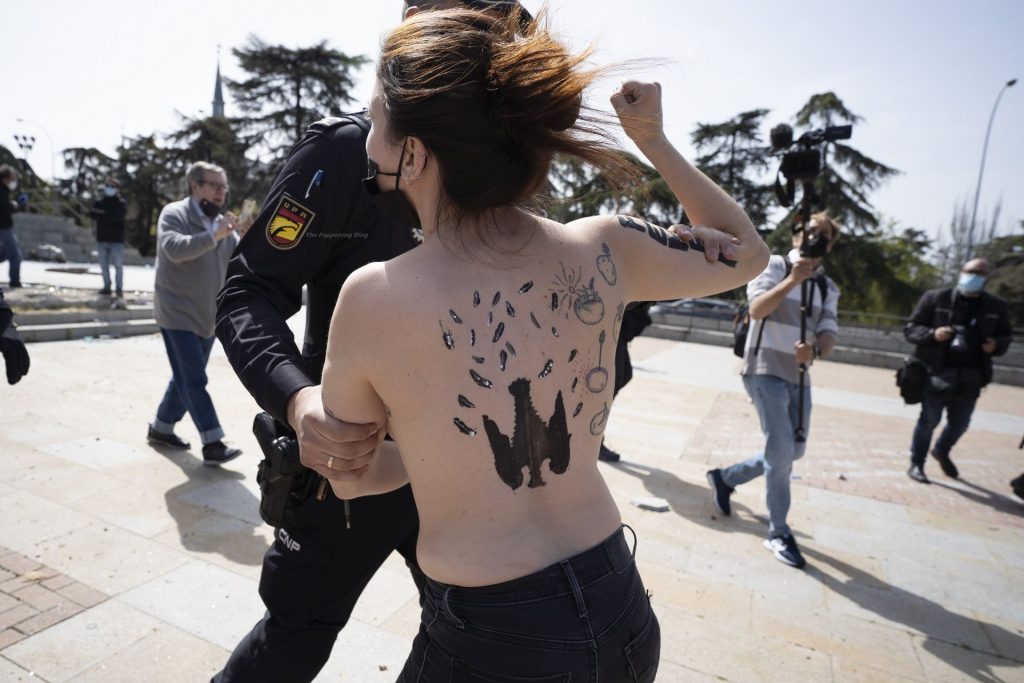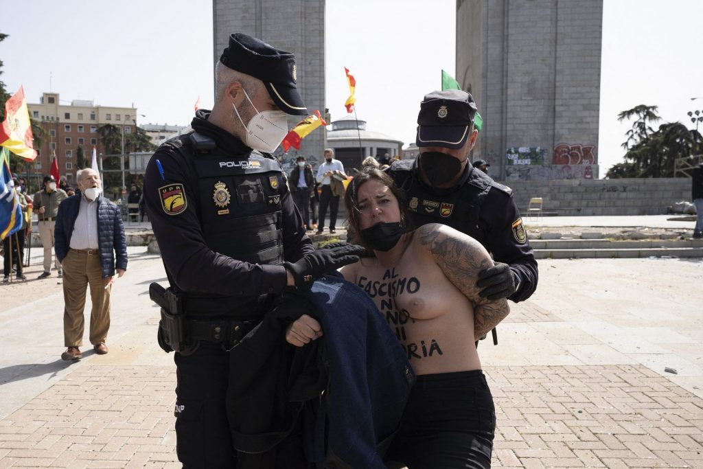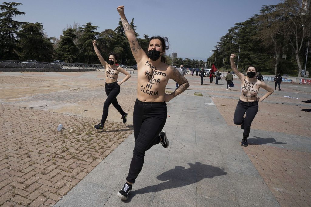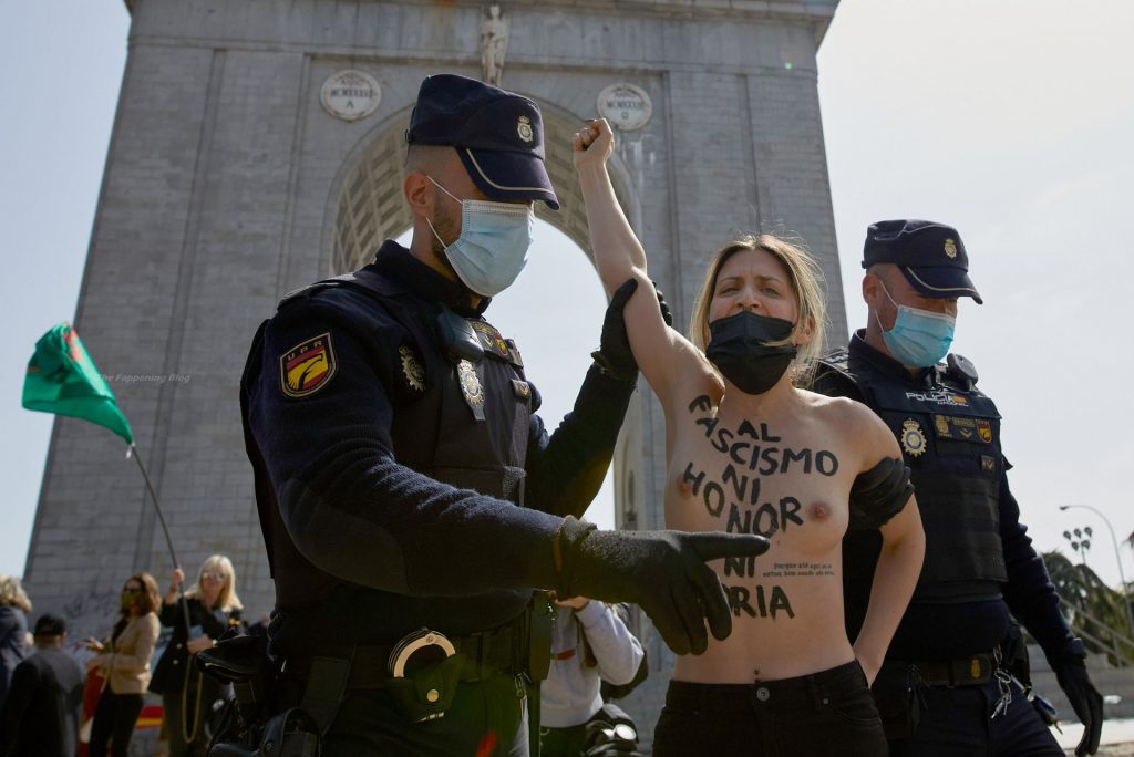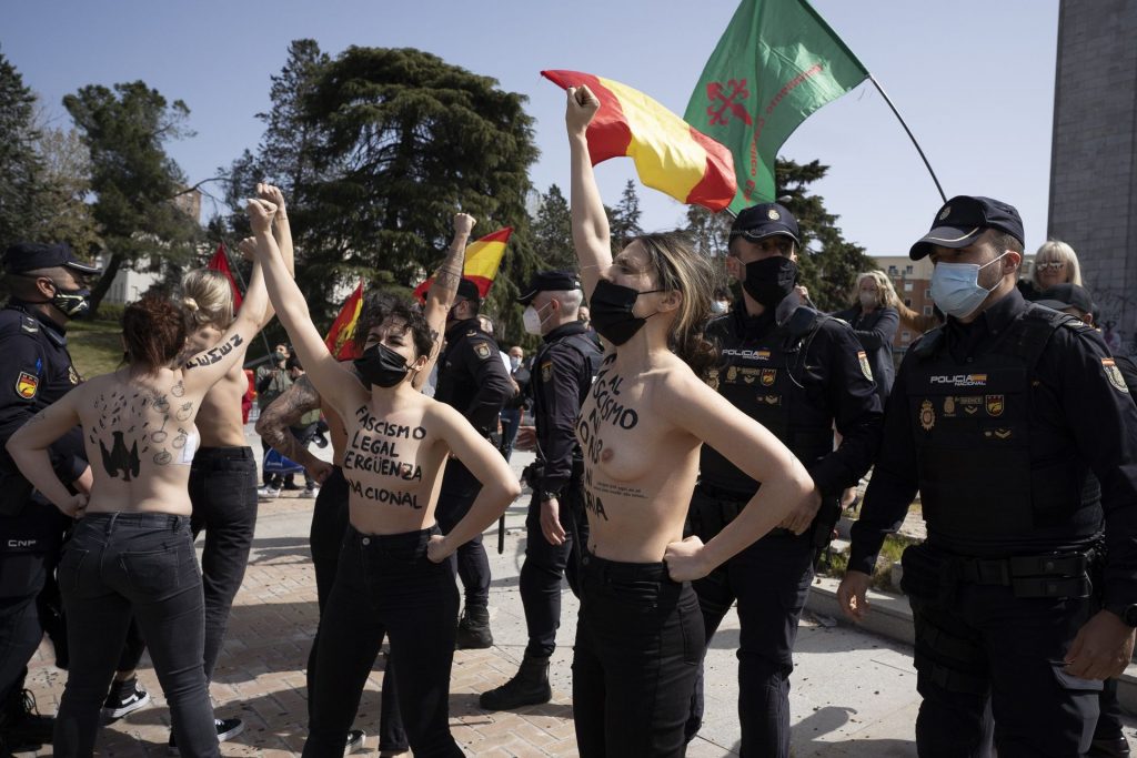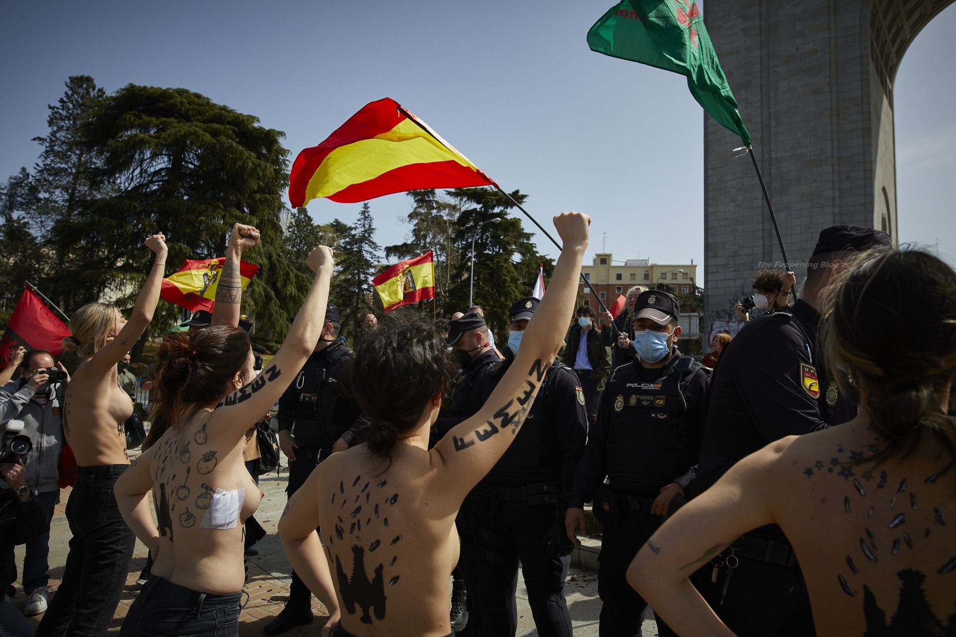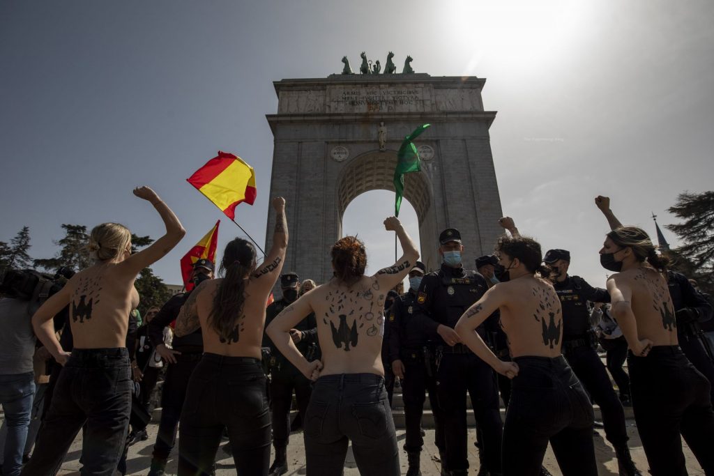 Attiviste di Femen con dipinti sui loro corpi che recitano: ‘Nessun onore al fascismo’ e aquile di Franco disegnate sulle loro schiene durante un evento per il Giorno della Vittoria nell’82° Anniversario della “Liberazione di Madrid”, all’Arco della Vittoria, a Madrid, Spagna, 28/03/2021.