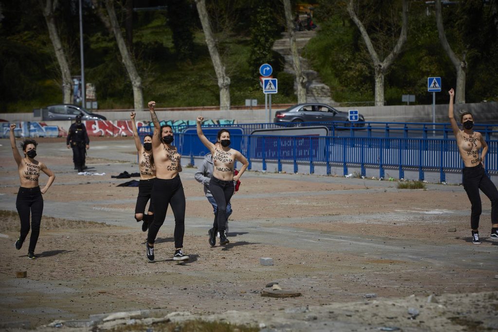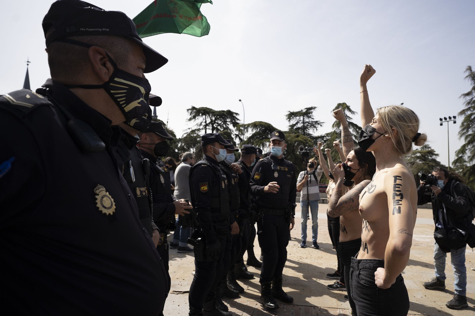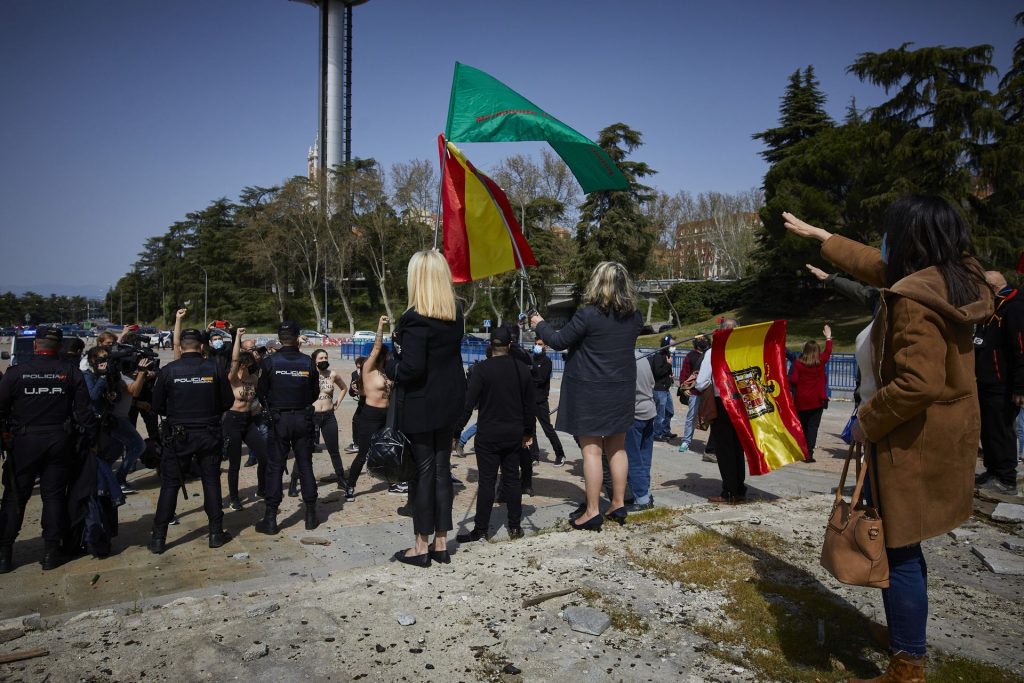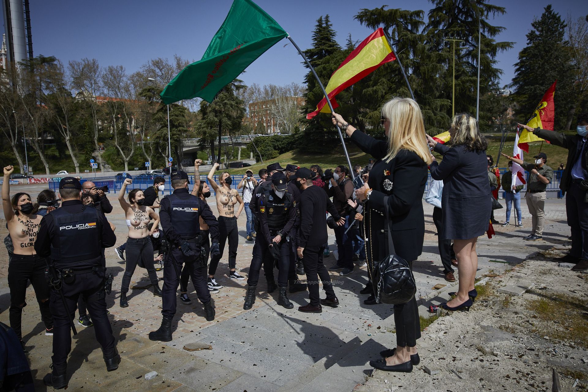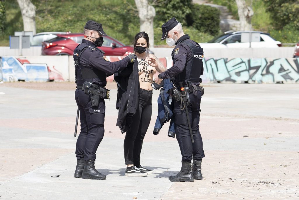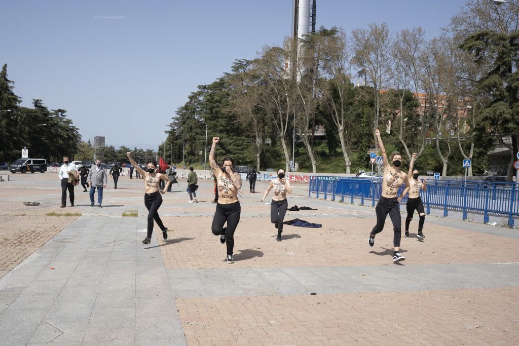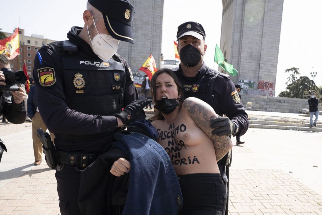 Attiviste di Femen con dipinti sui loro corpi che recitano: ‘Nessun onore al fascismo’ e aquile di Franco disegnate sulle loro schiene durante un evento per il Giorno della Vittoria nell’82° Anniversario della “Liberazione di Madrid”, all’Arco della Vittoria, a Madrid, Spagna, 28/03/2021.