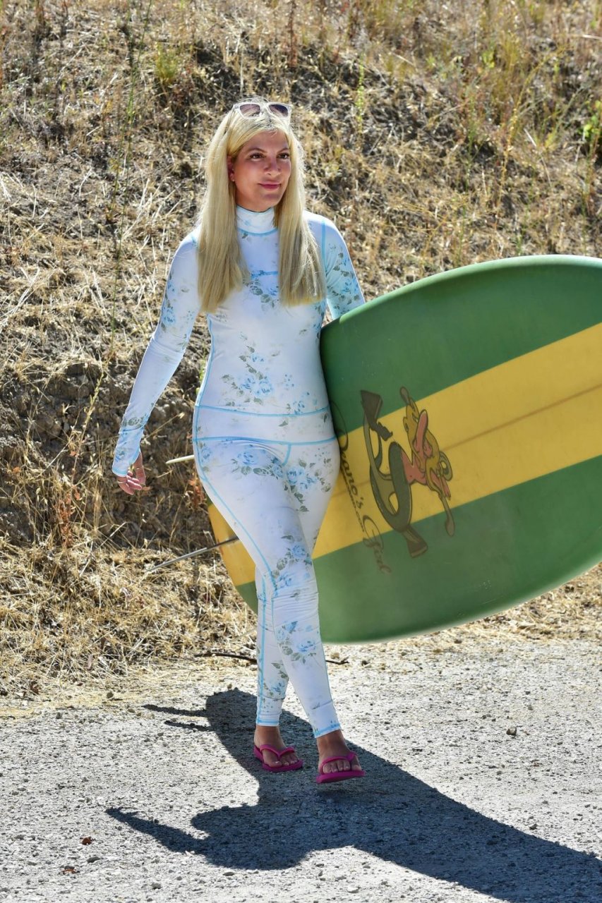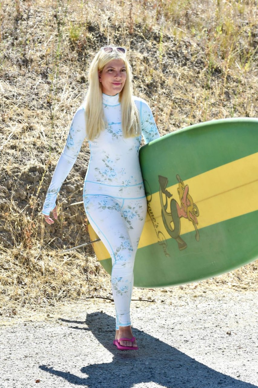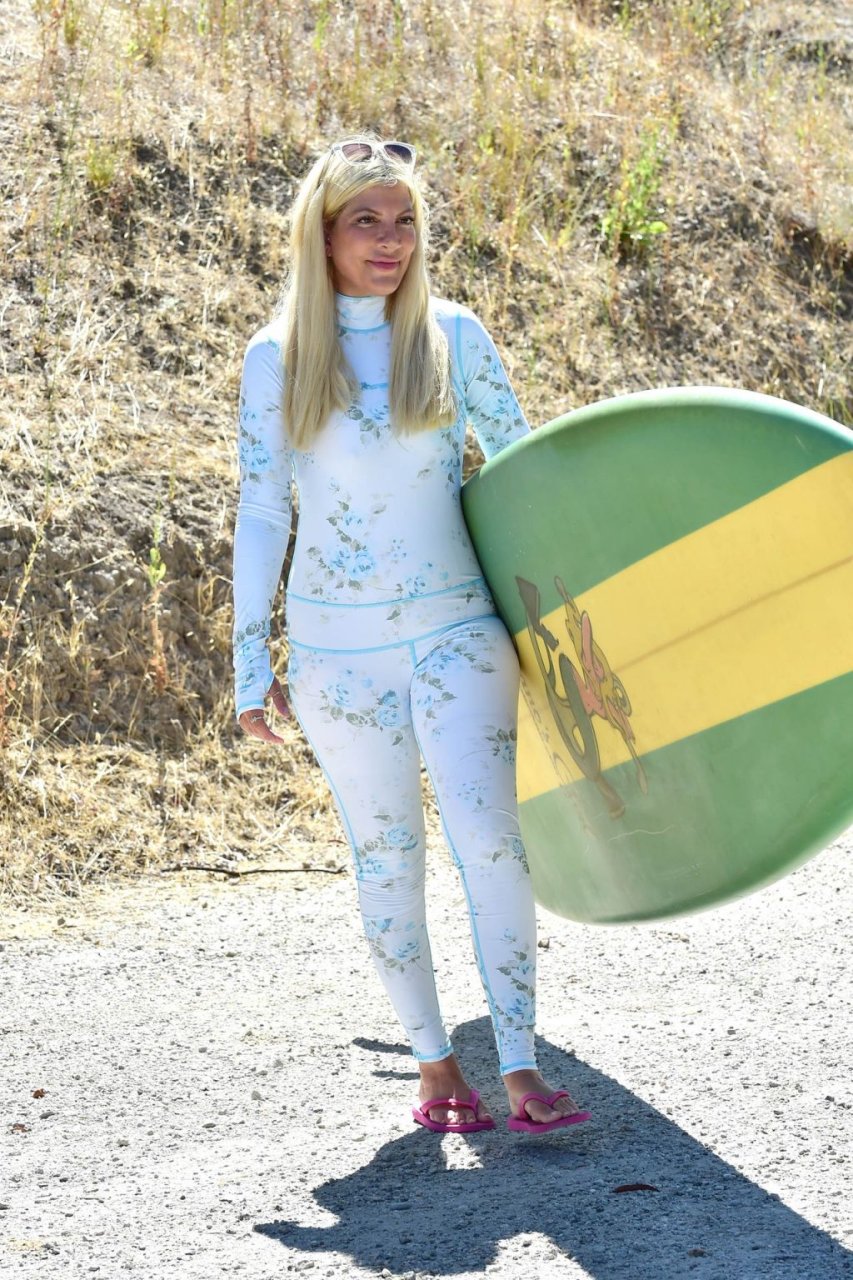 Tori Spelling è stata fotografata mentre si recava a una lezione di surf a Malibu, 17/09/2019. Quando le è stato chiesto cosa indossasse, ha detto al nostro fotografo che si tratta di una linea di costumi da bagno di un’amica attrice, Sarah Buxton, che è stata nello show del padre di Spelling, Sunset Beach.