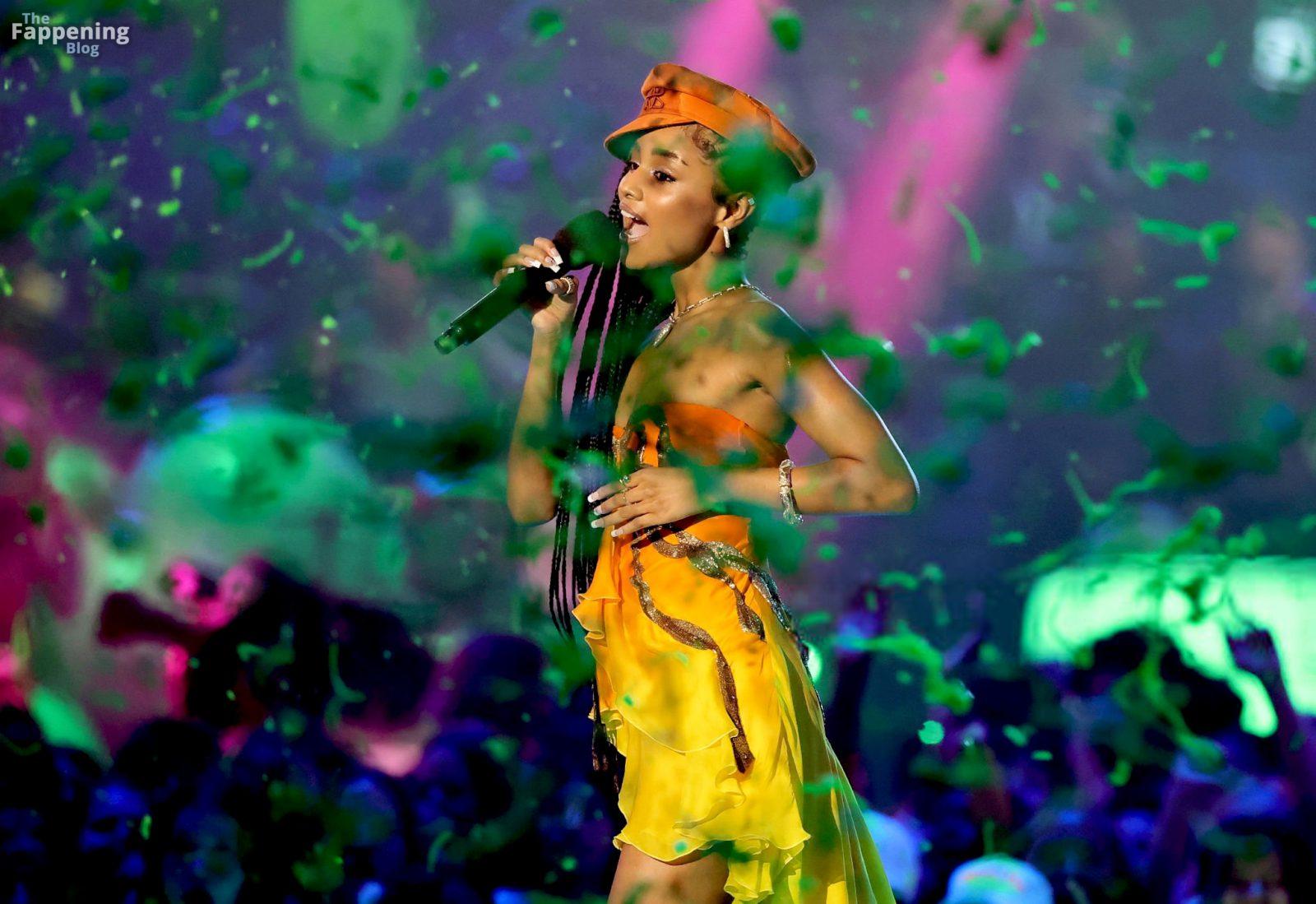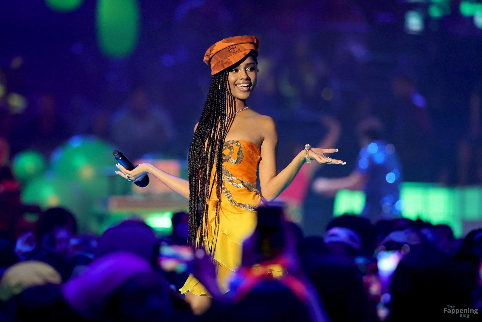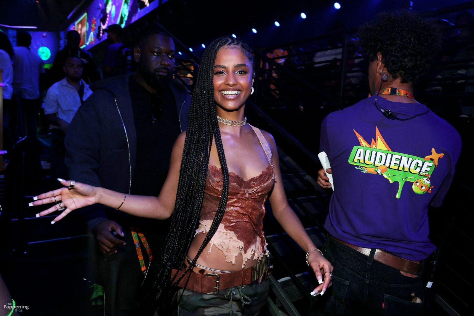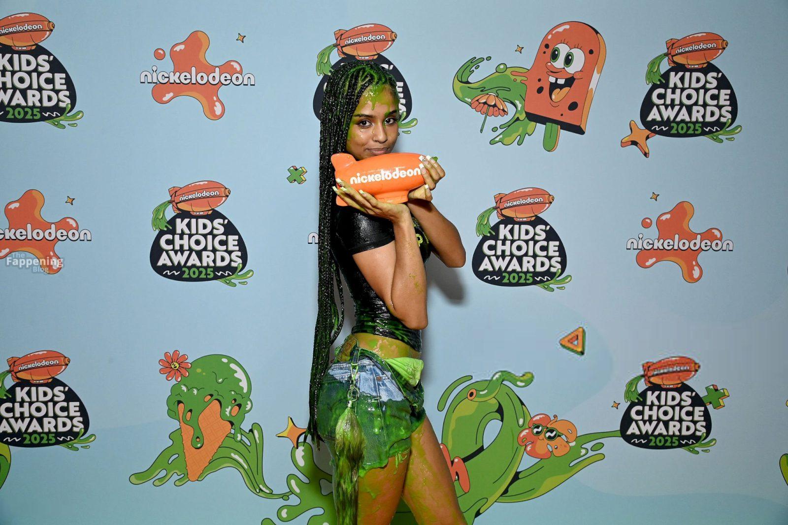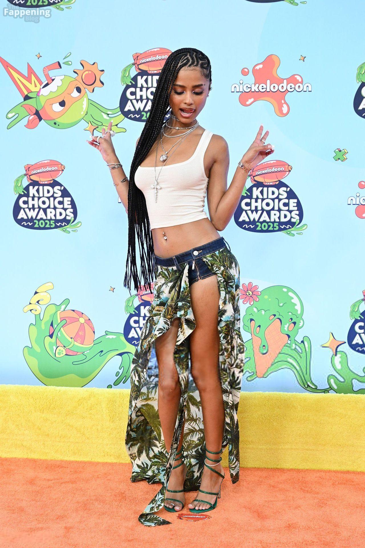 La cantante Tyla si è fatta notare ai Nickelodeon Kids’ Choice Awards 2025. Ha calpestato il tappeto arancione con un outfit che abbracciava la sua figura snella: un crop top crema aderente e a coste che le stringeva il seno, abbinato a una audace gonna con stampa jungle con uno spacco vertiginoso. Date un’occhiata anche alla sua pazzesca esibizione sul palco!