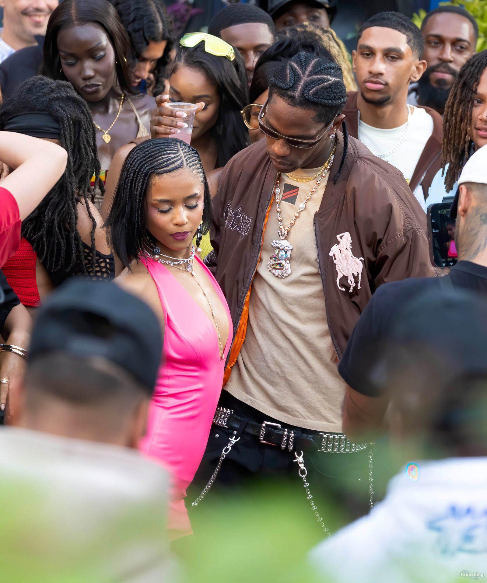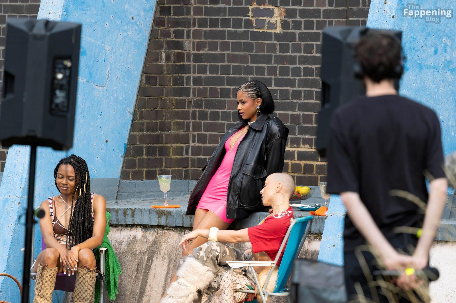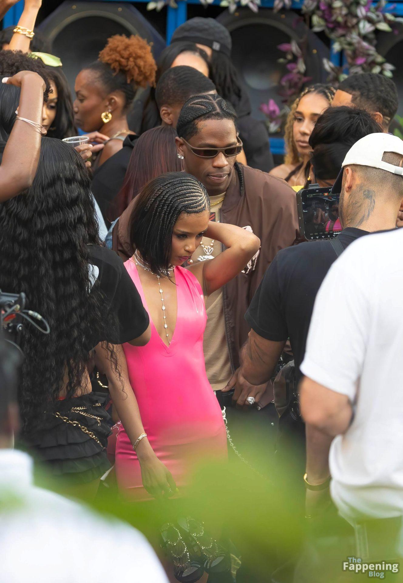 Dai un’occhiata al seno, al sedere e alle gambe di Tyla. È ritratta in un aderente abito rosa in lattice sul set londinese del nuovo video musicale di Travis Scott.