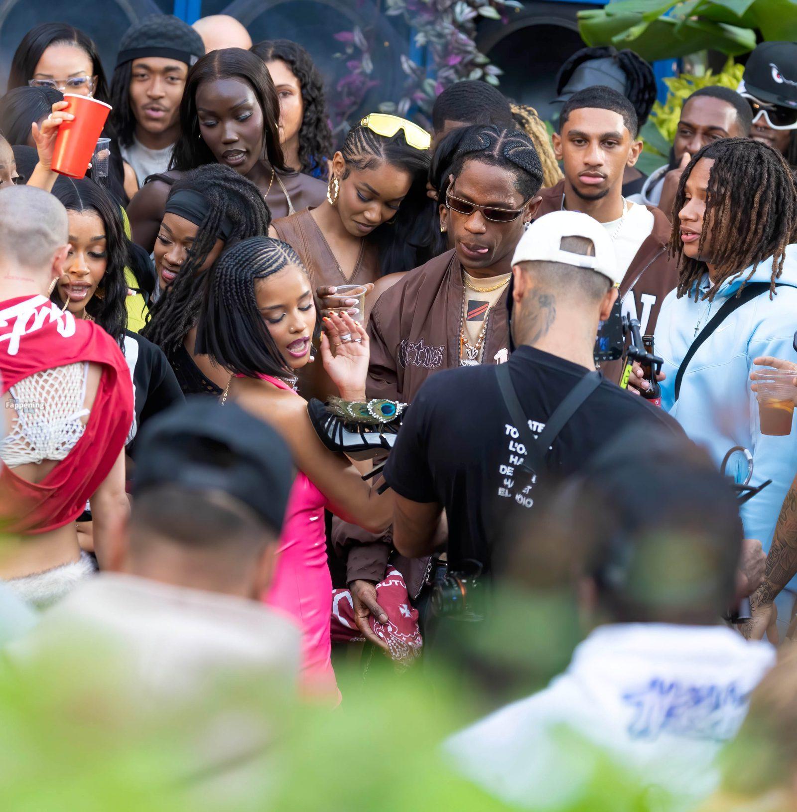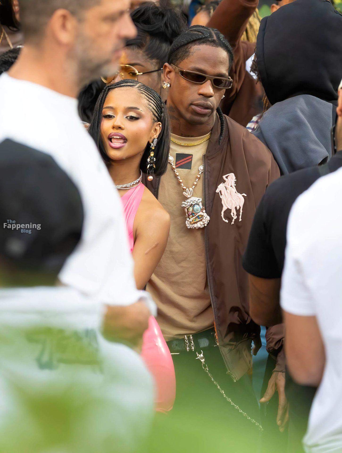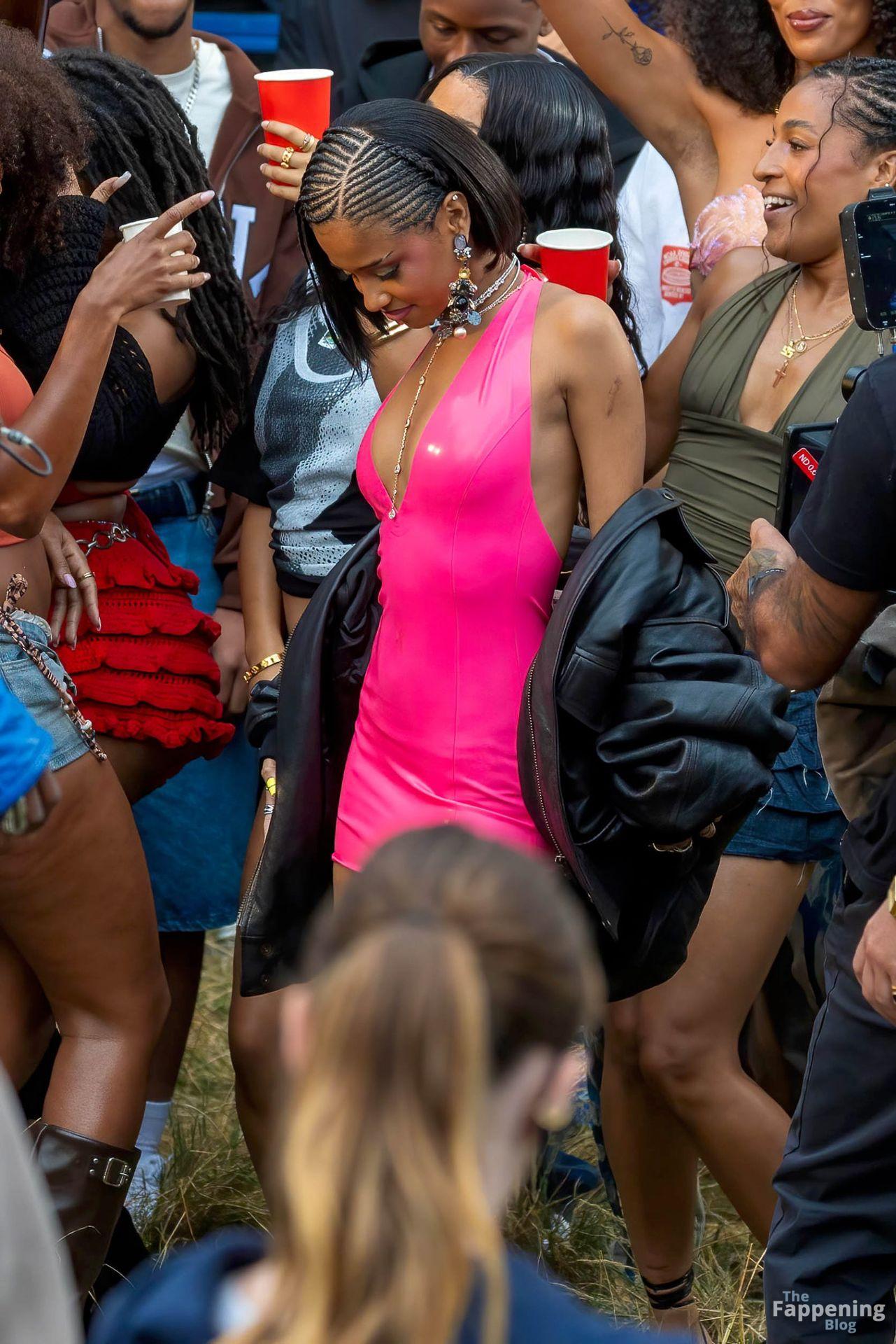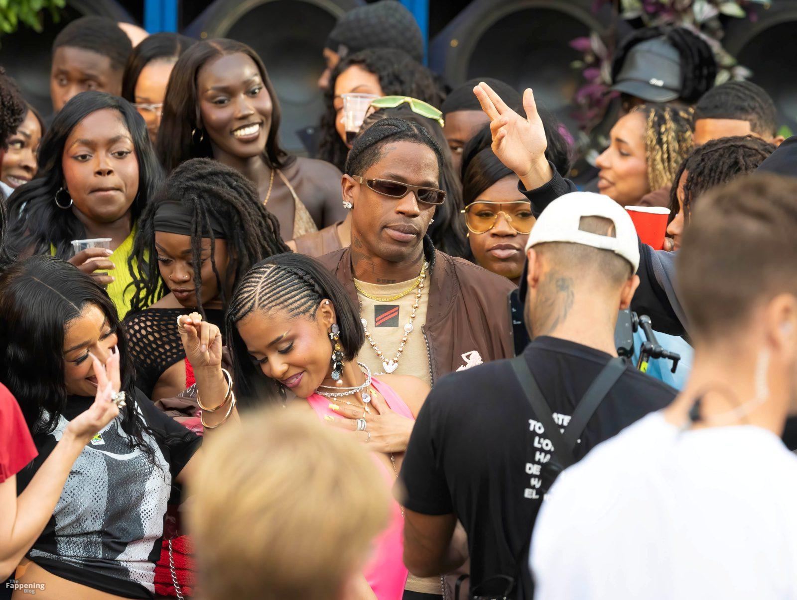 Dai un’occhiata al seno, al sedere e alle gambe di Tyla. È ritratta in un aderente abito rosa in lattice sul set londinese del nuovo video musicale di Travis Scott.