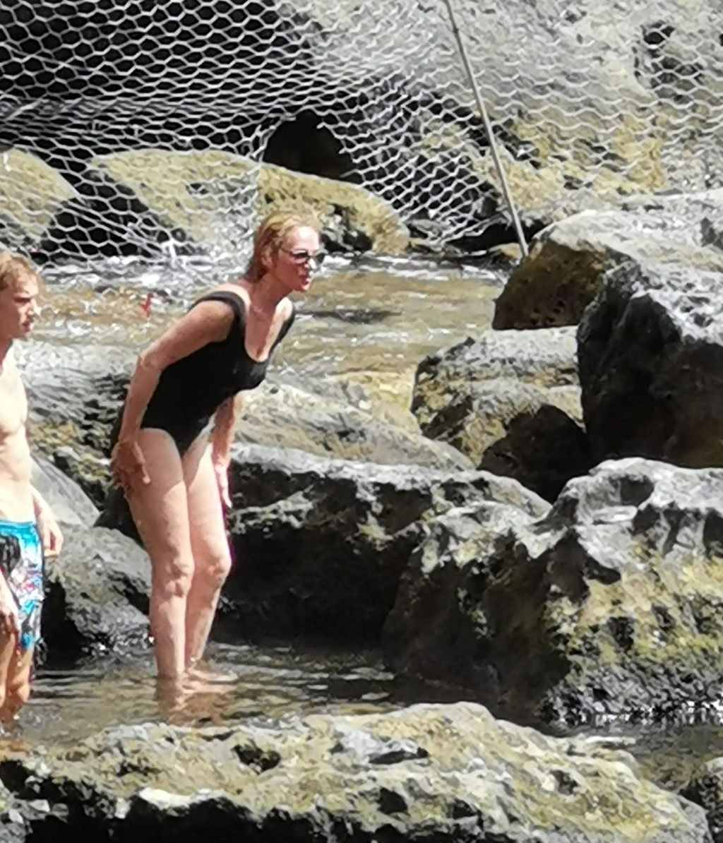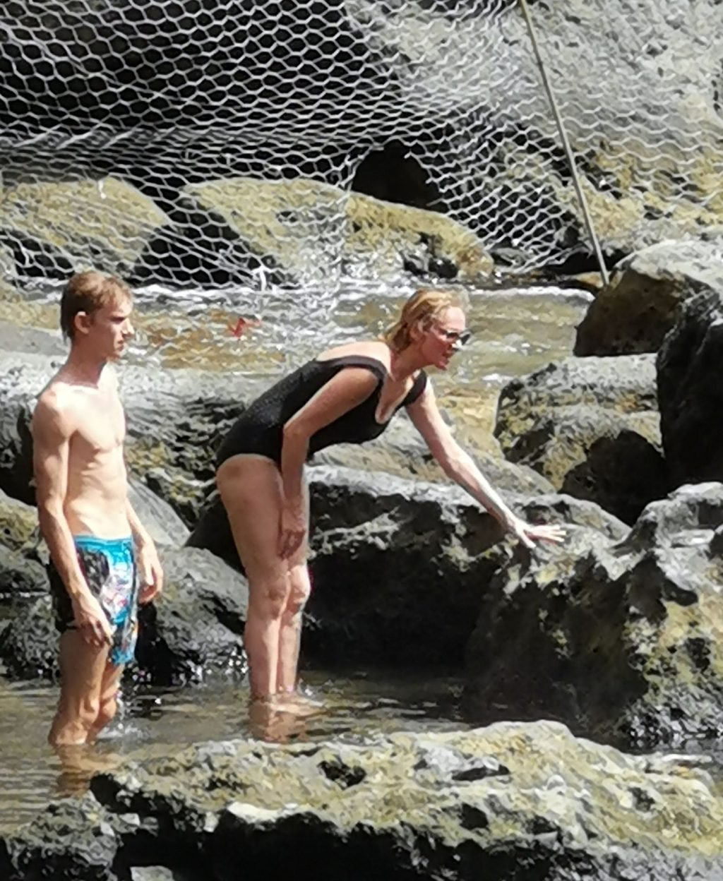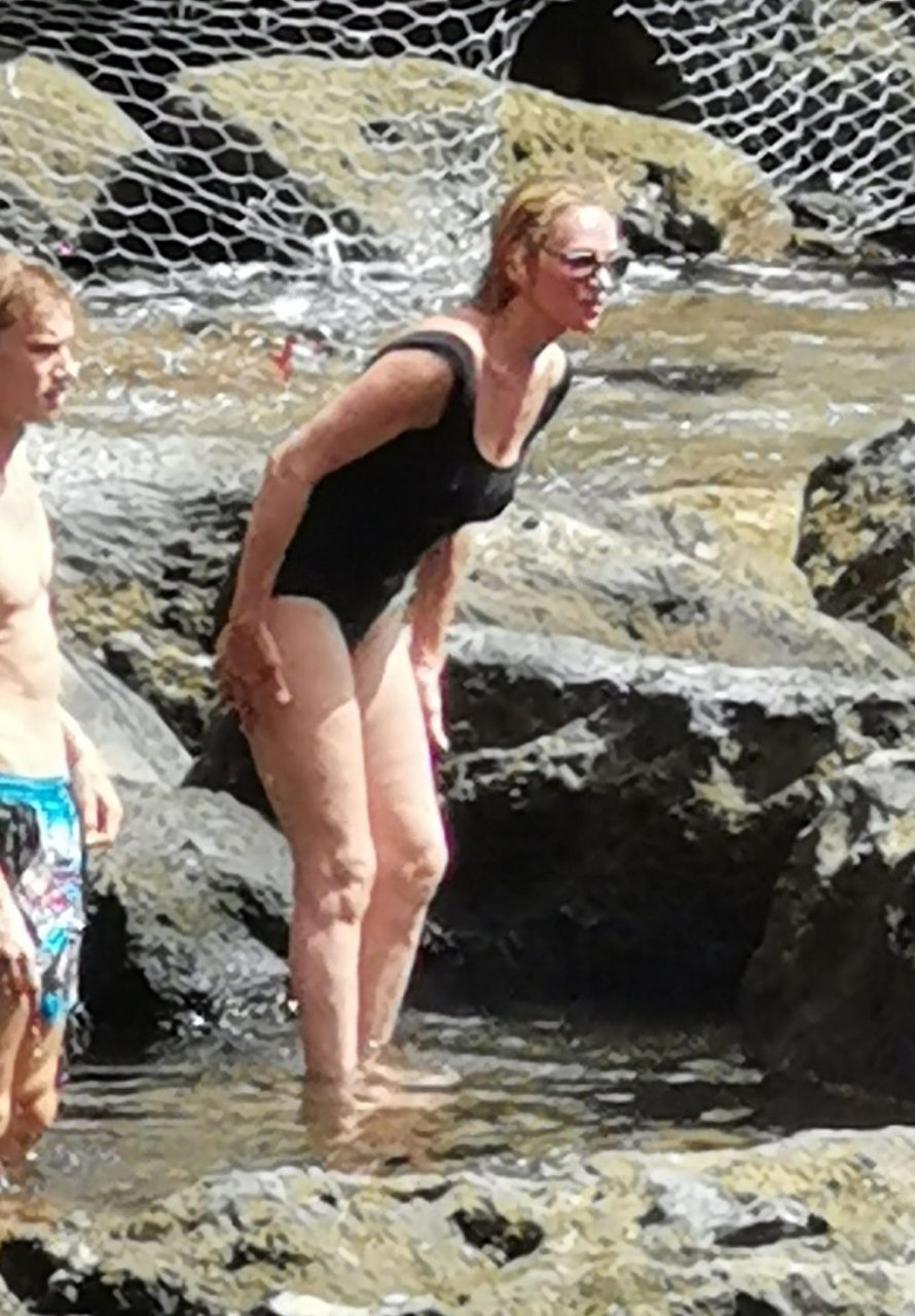 L’attrice e modella americana Uma Thurman è stata fotografata mentre indossava un costume da bagno nero mentre osservava alcune piscine di acqua salata con suo figlio durante la loro vacanza a Ischia, 16/06/2019.