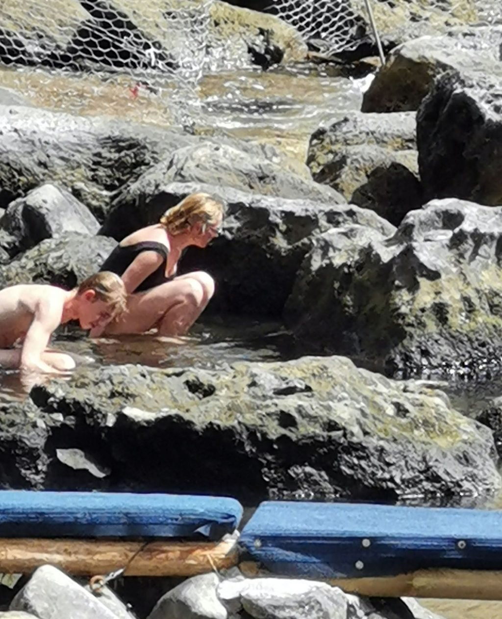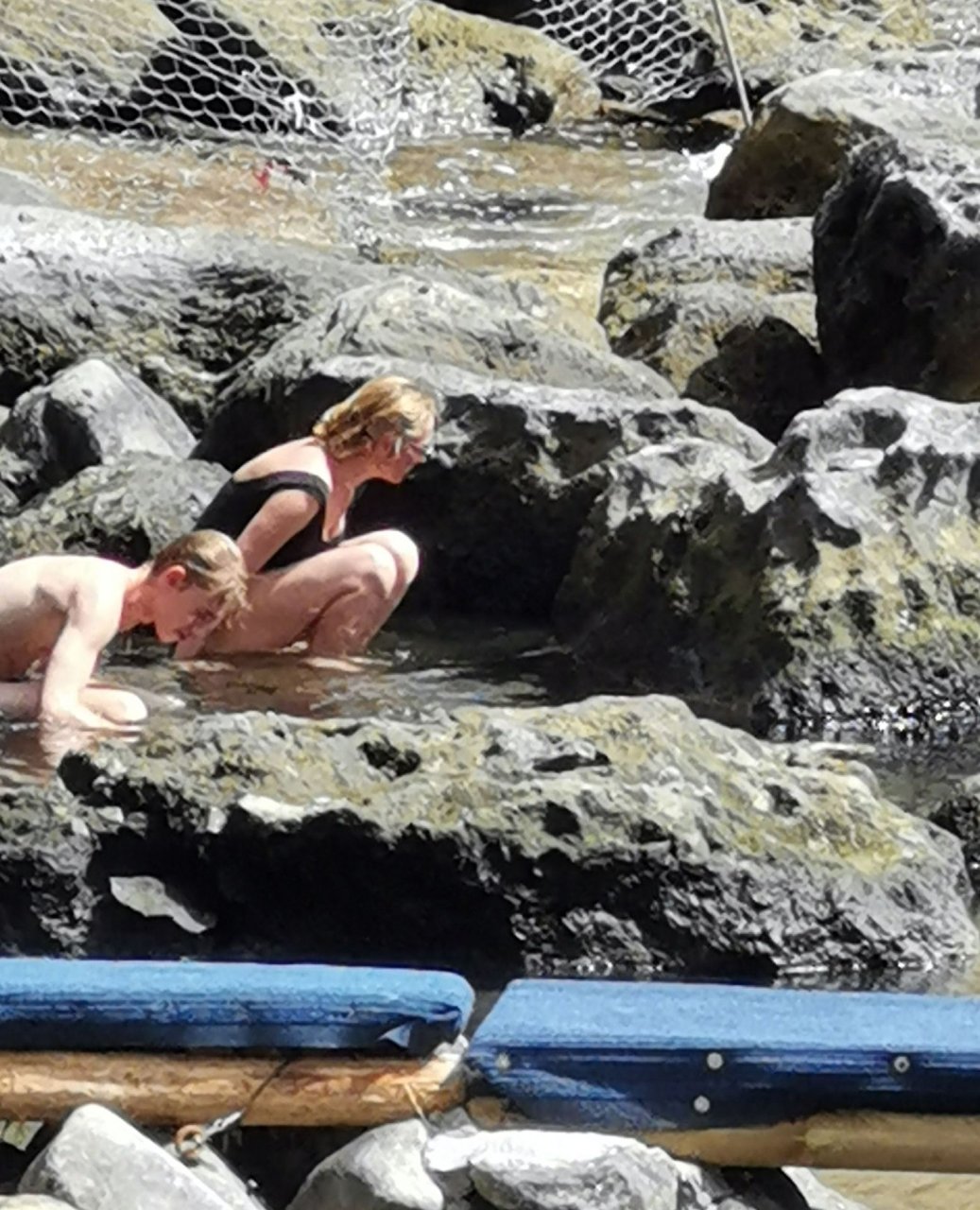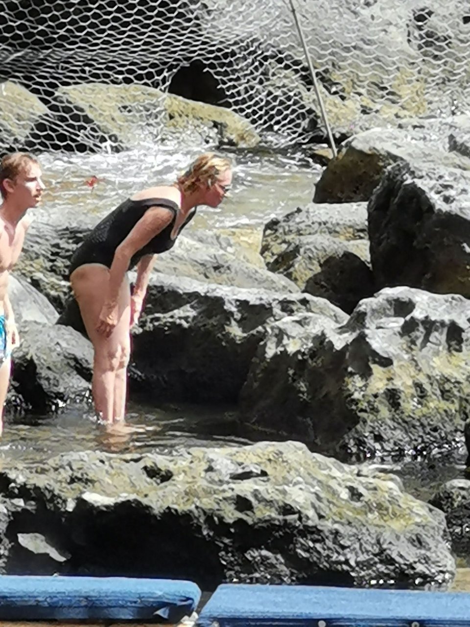 L’attrice e modella americana Uma Thurman è stata fotografata mentre indossava un costume da bagno nero mentre osservava alcune piscine di acqua salata con suo figlio durante la loro vacanza a Ischia, 16/06/2019.