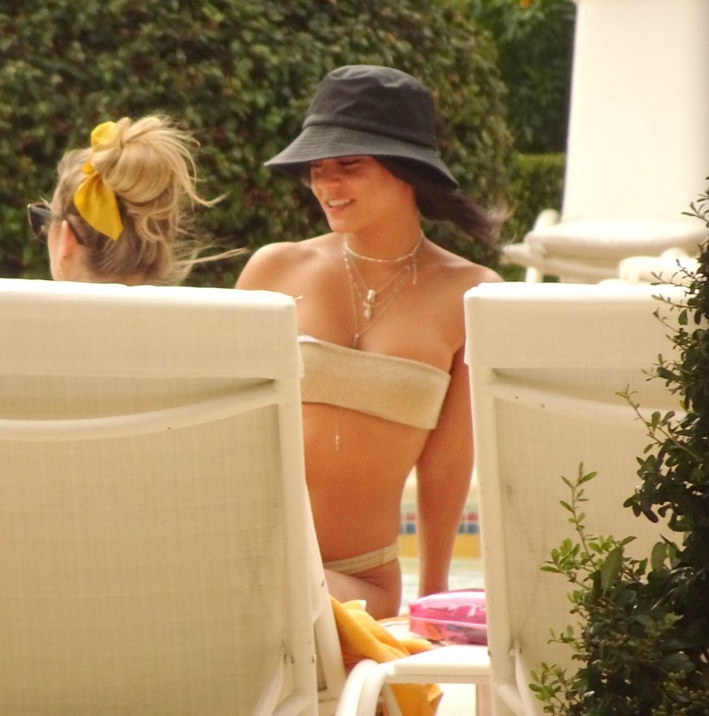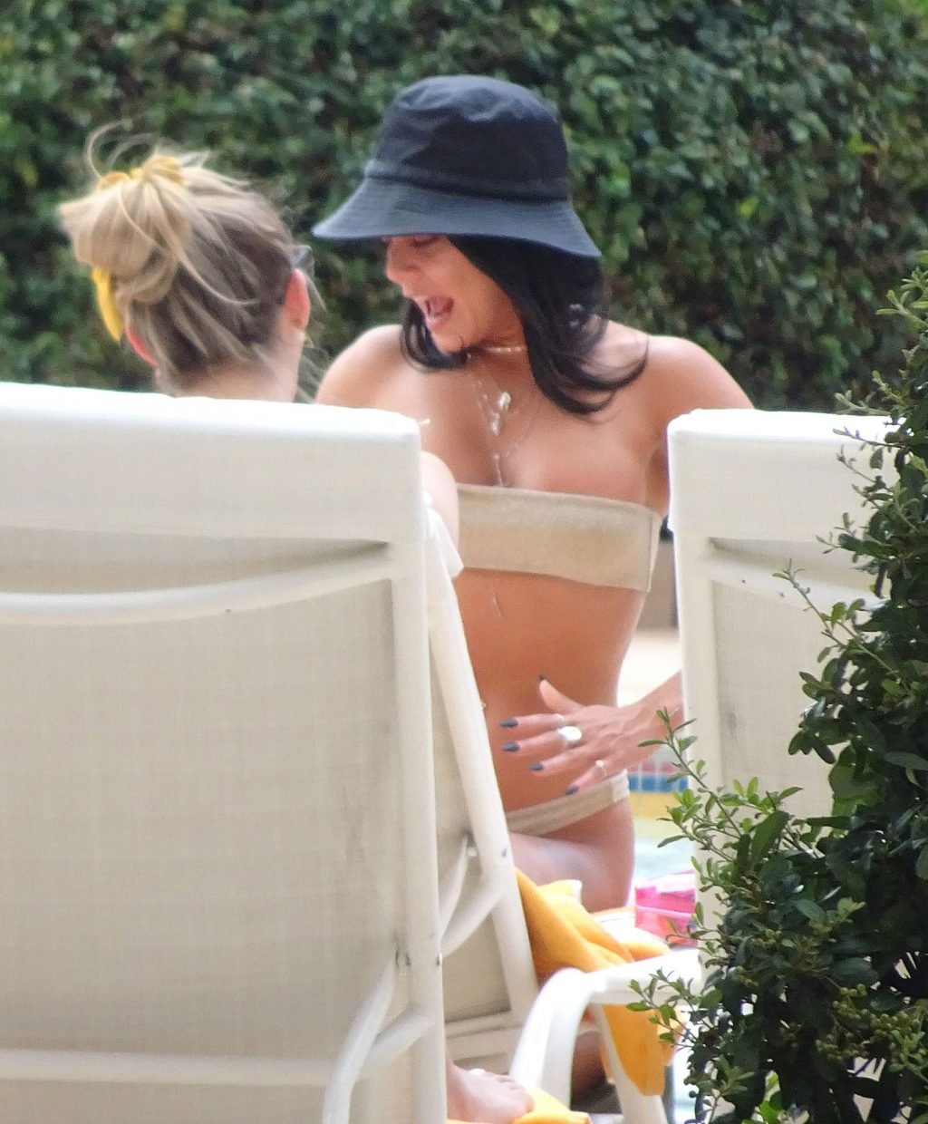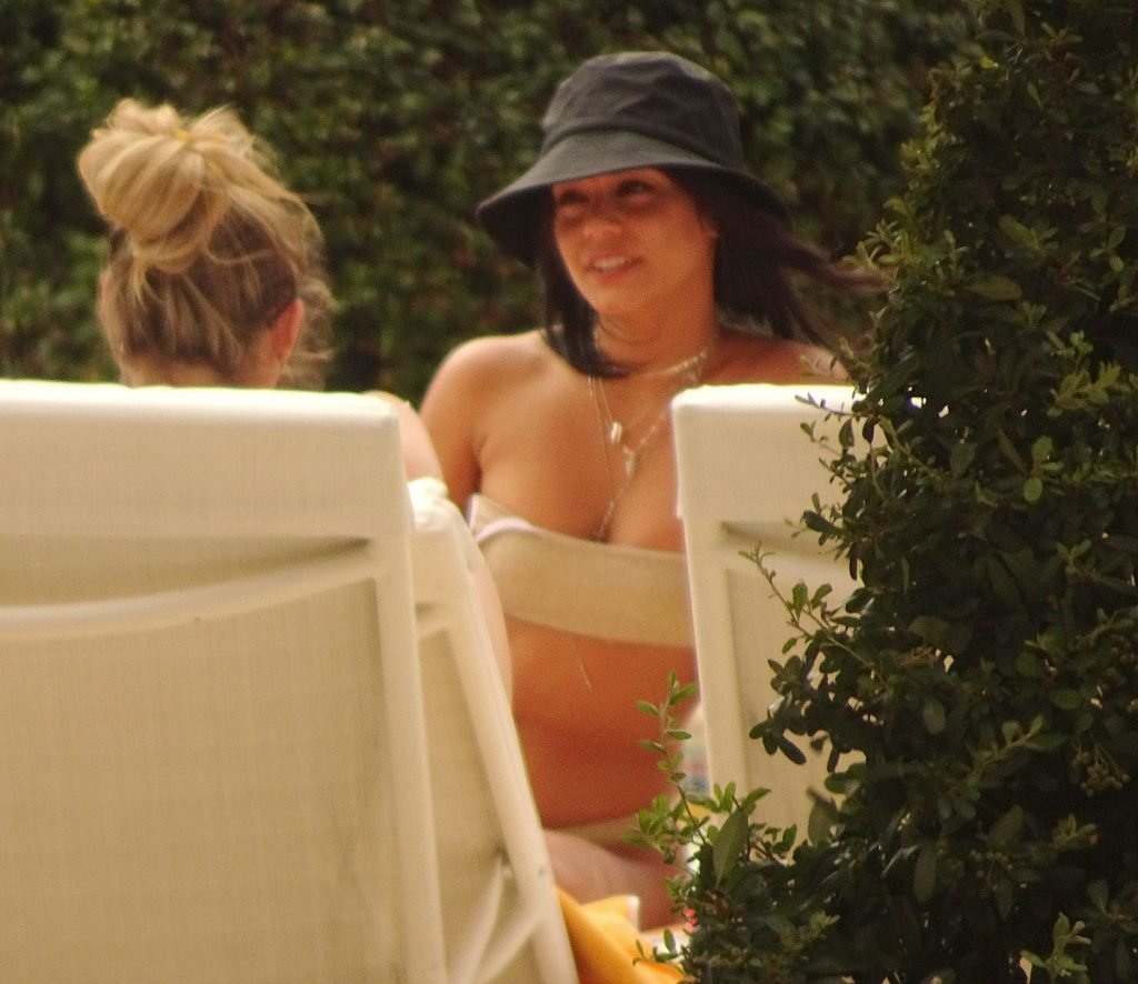 Le ragazze erano sedute intorno alla piscina affollata mentre Vanessa si allentava una delle spalline del bikini prima di tornare più tardi al casinò indossando un cappello nero a tesa larga e una gonna nella Sin City.
