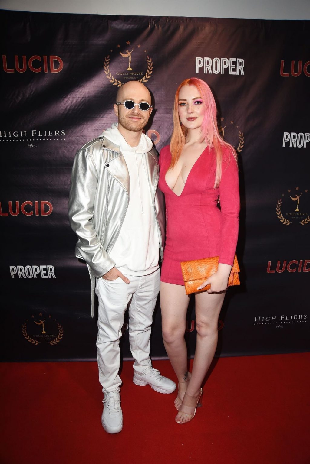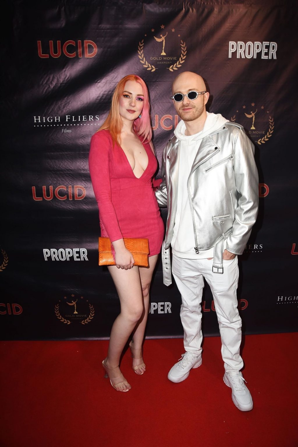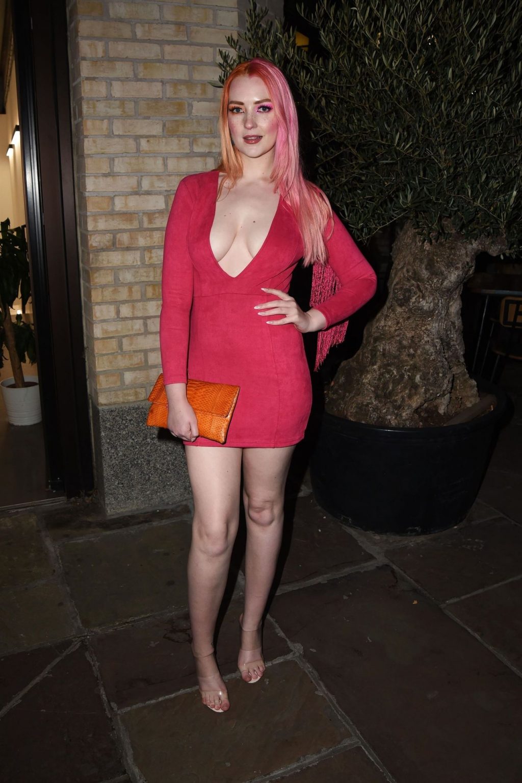 La modella Victoria Clay partecipa alla prima londinese del film LUCID alla Old Street Gallery di Londra, 09/07/2020. La bellezza dalle gambe lunghe mostra il suo décolleté indossando un vestito rosso.