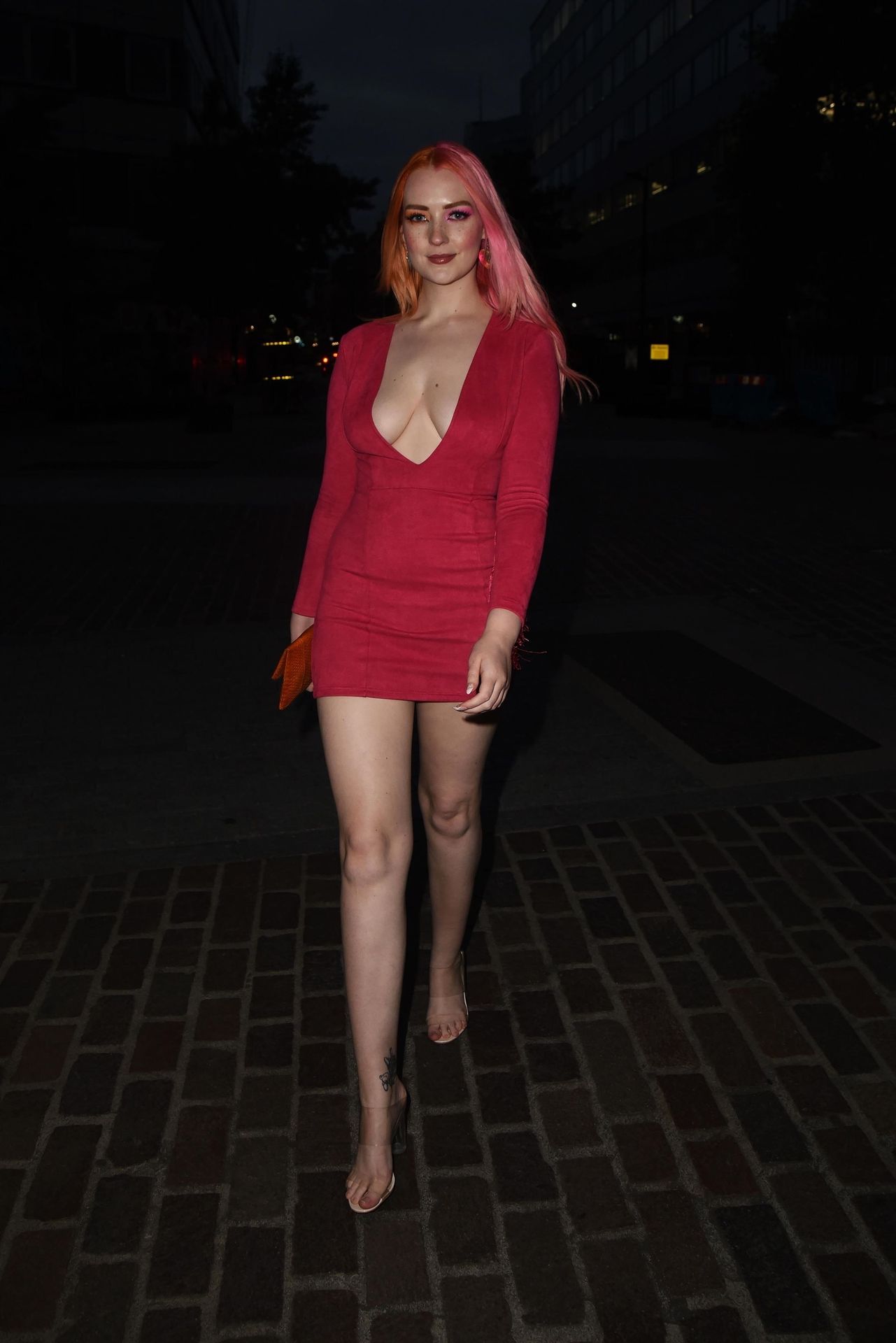 La modella Victoria Clay partecipa alla prima londinese del film LUCID alla Old Street Gallery di Londra, 09/07/2020. La bellezza dalle gambe lunghe mostra il suo décolleté indossando un vestito rosso.