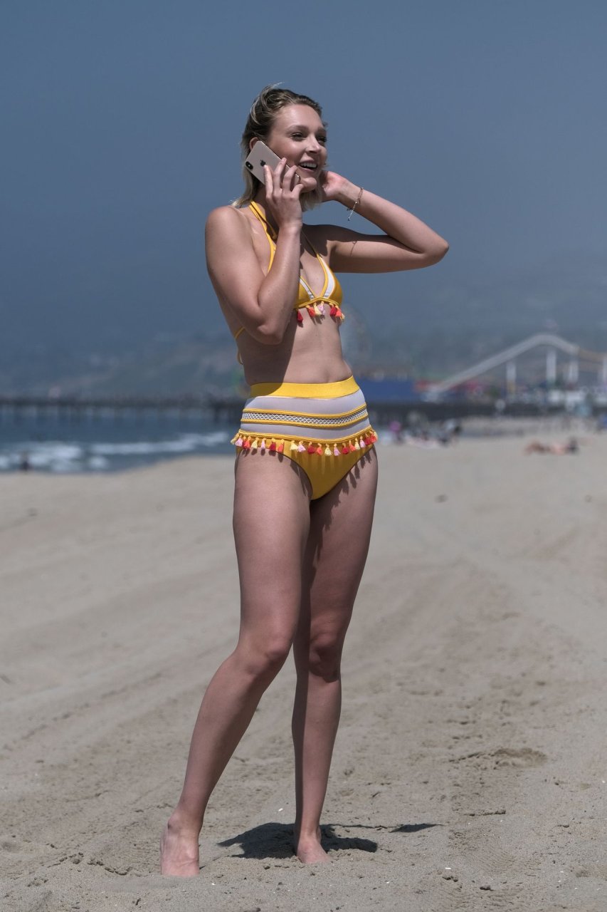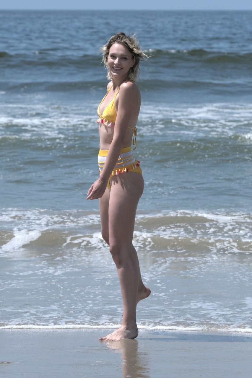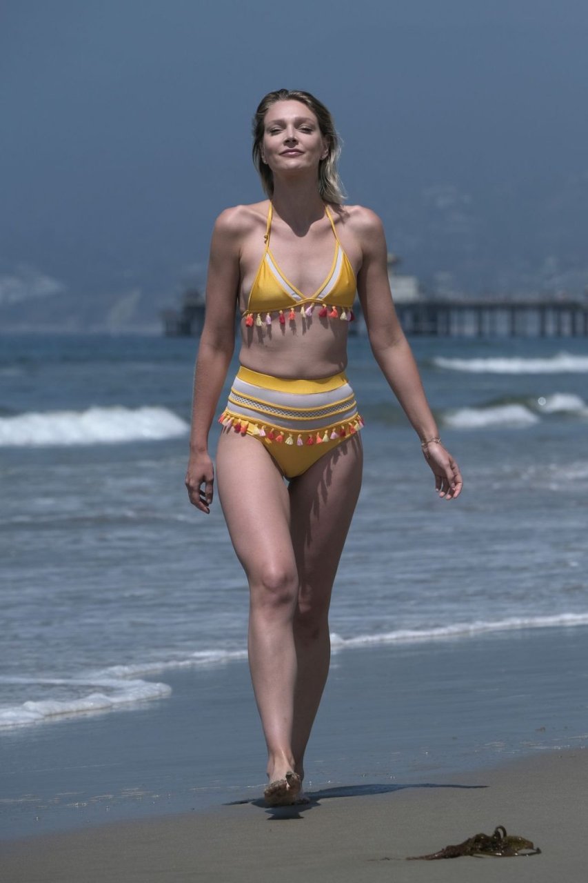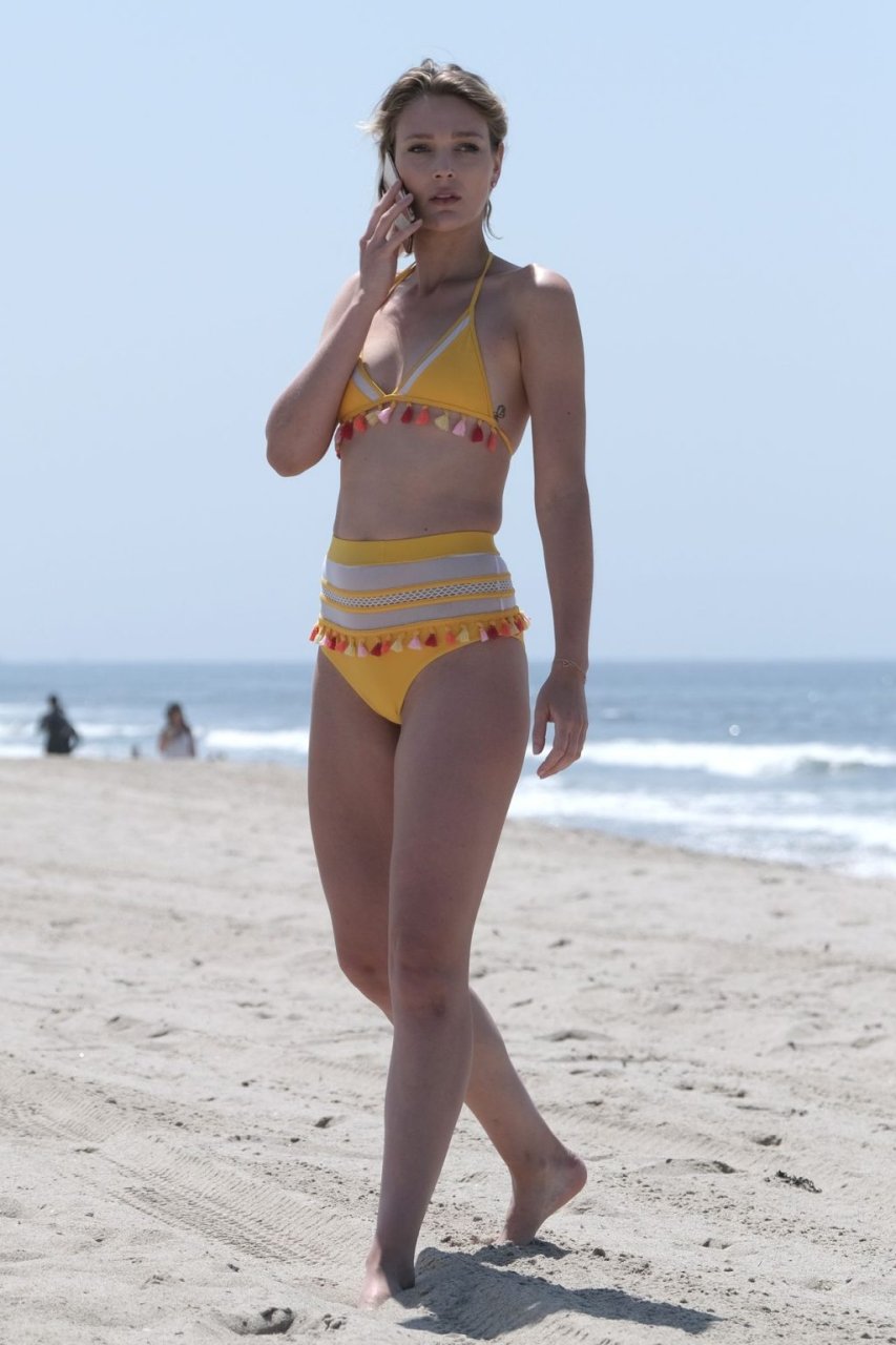 La modella e attrice tedesca Victoria Jancke mostra il suo corpo in bikini con un bikini giallo Tularosa con pompon di Revolve mentre si gode la spiaggia a Santa Monica, 24/04/2019.