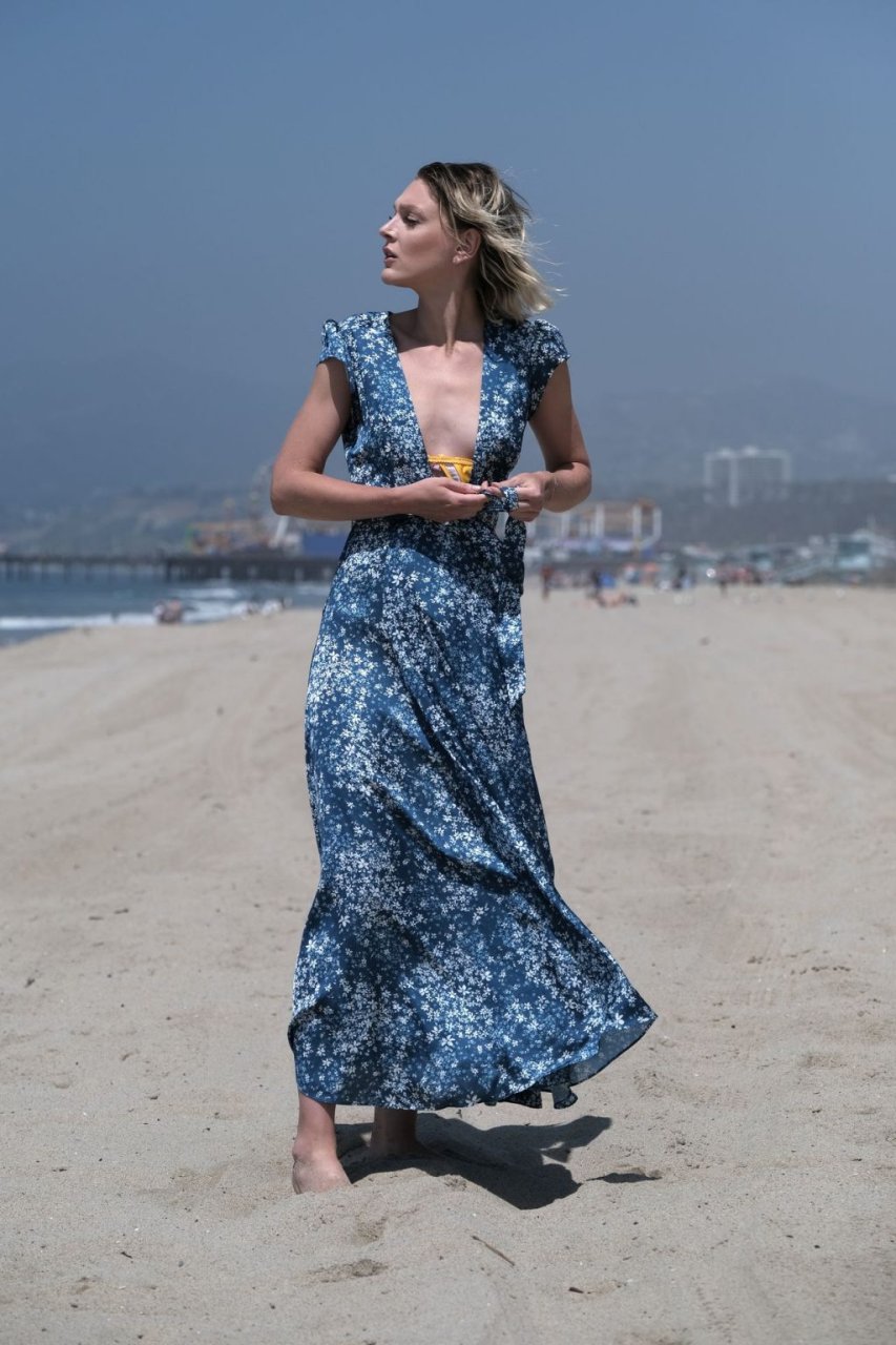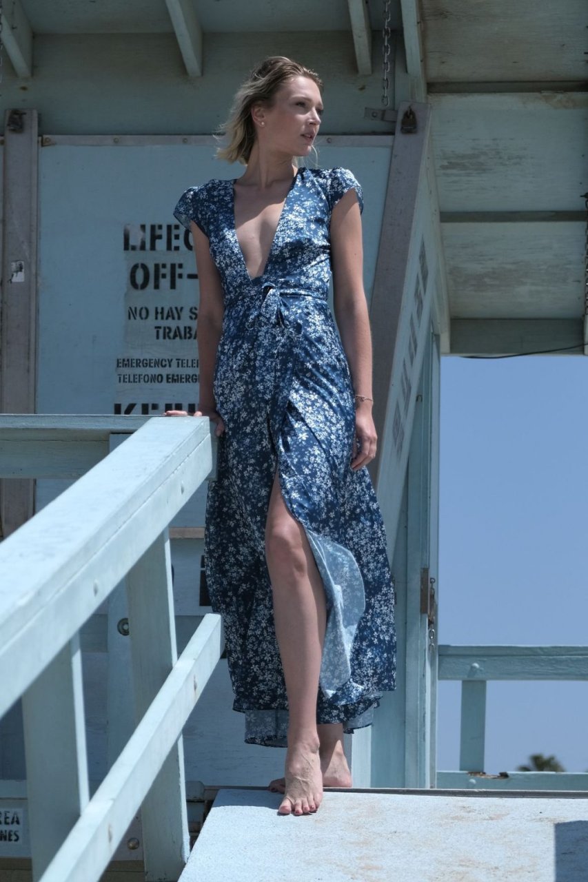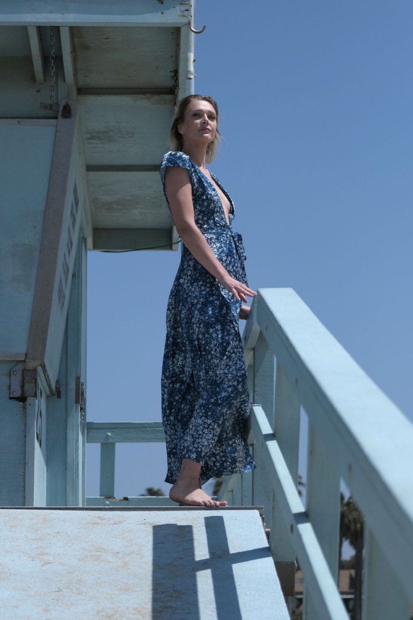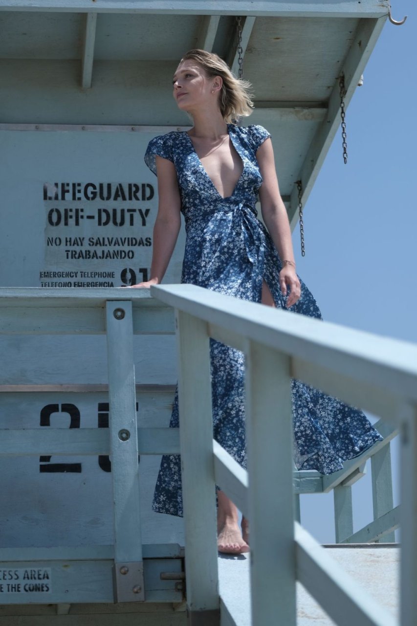 Dopo un po’ di divertimento al sole, Jancke si è poi cambiata indossando un grazioso vestito avvolgente blu Tularosa, sempre di Revolve.