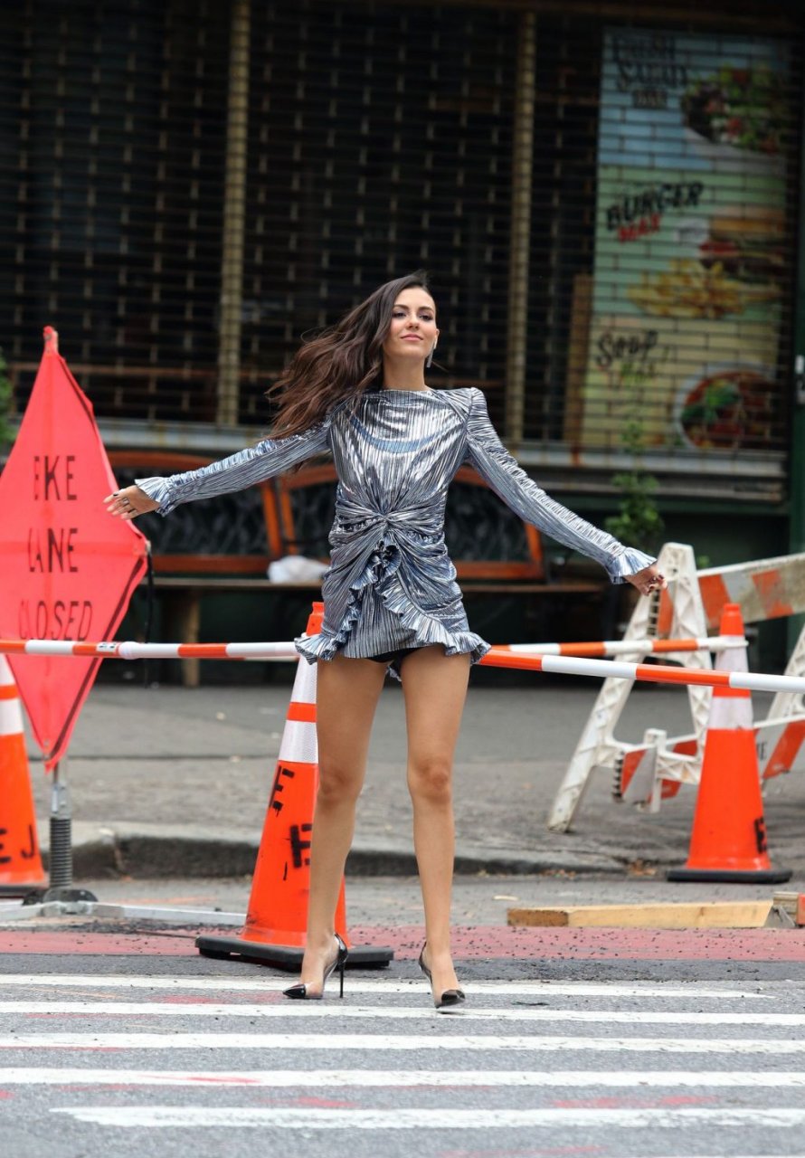 L’attrice Victoria Justice (26) sorride mentre indossa un elegante abito argento per un servizio fotografico nel quartiere TriBeCa di Manhattan, 08/09/2019. La star di Fappening ha mostrato le sue gambe sexy, mostrando un po’ di biancheria intima.