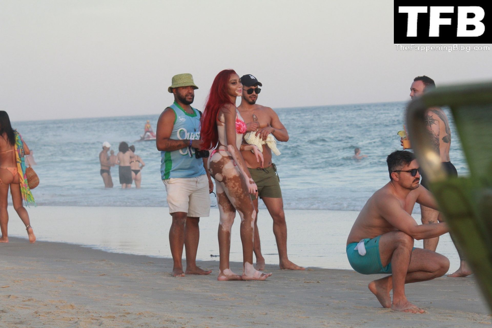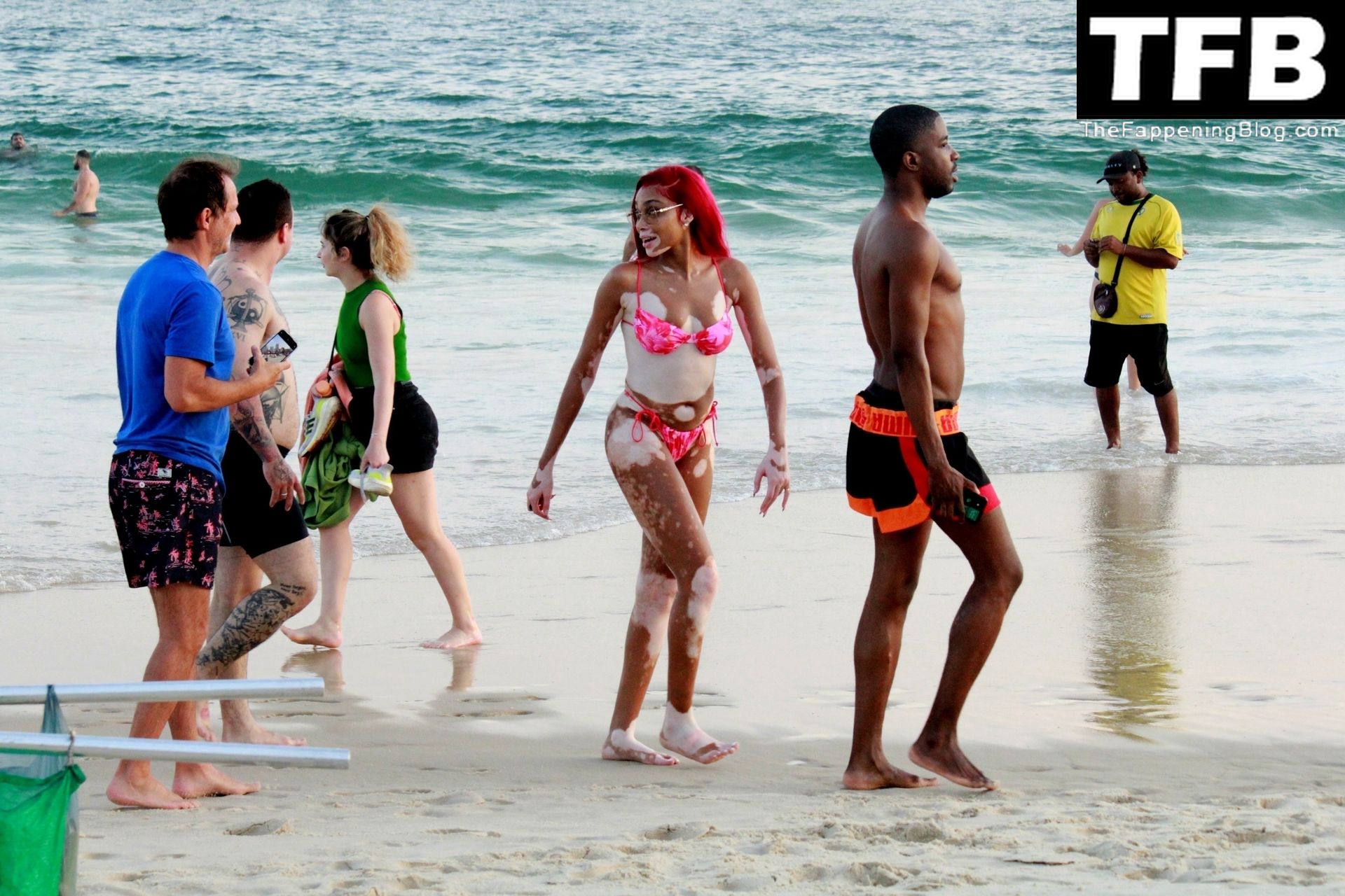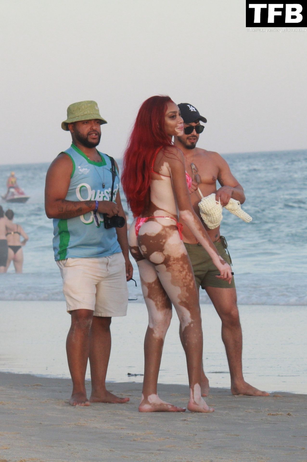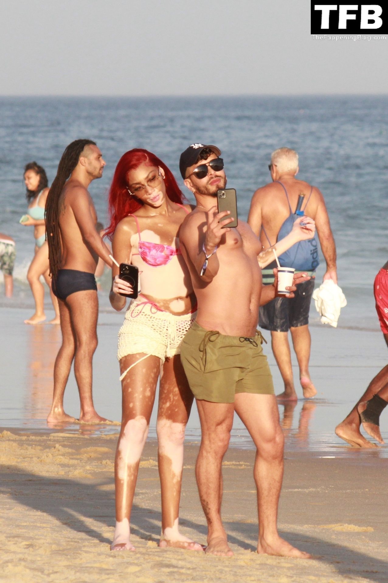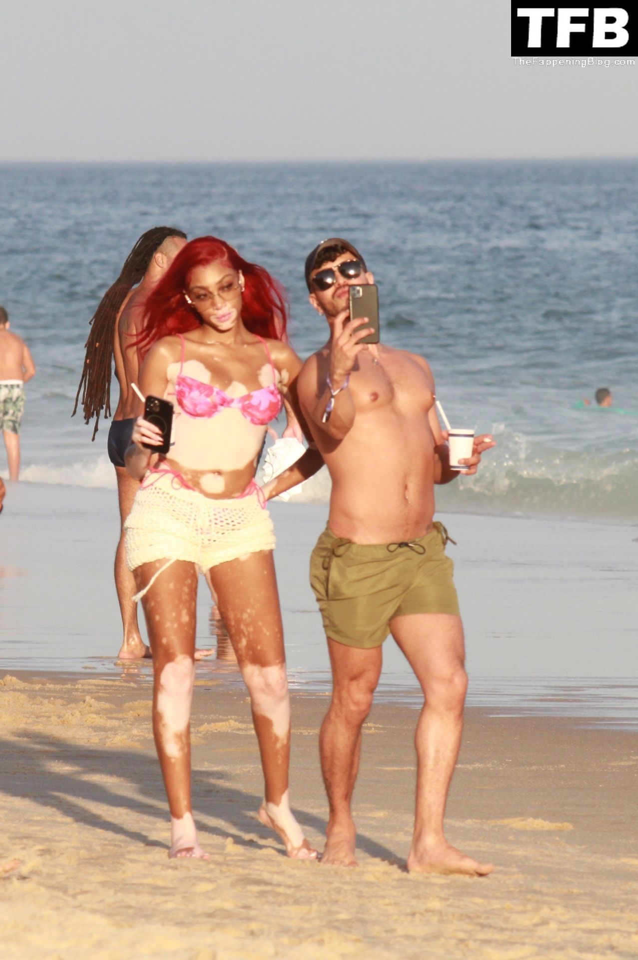 La modella canadese Winnie Harlow mostra il suo corpo in bikini mentre si gode una giornata sulla spiaggia di Ipanema con i fidanzati durante il Camarote N 1 al Marquês de Sapucaí a Rio de Janeiro, Brasile, 23/04/2022.