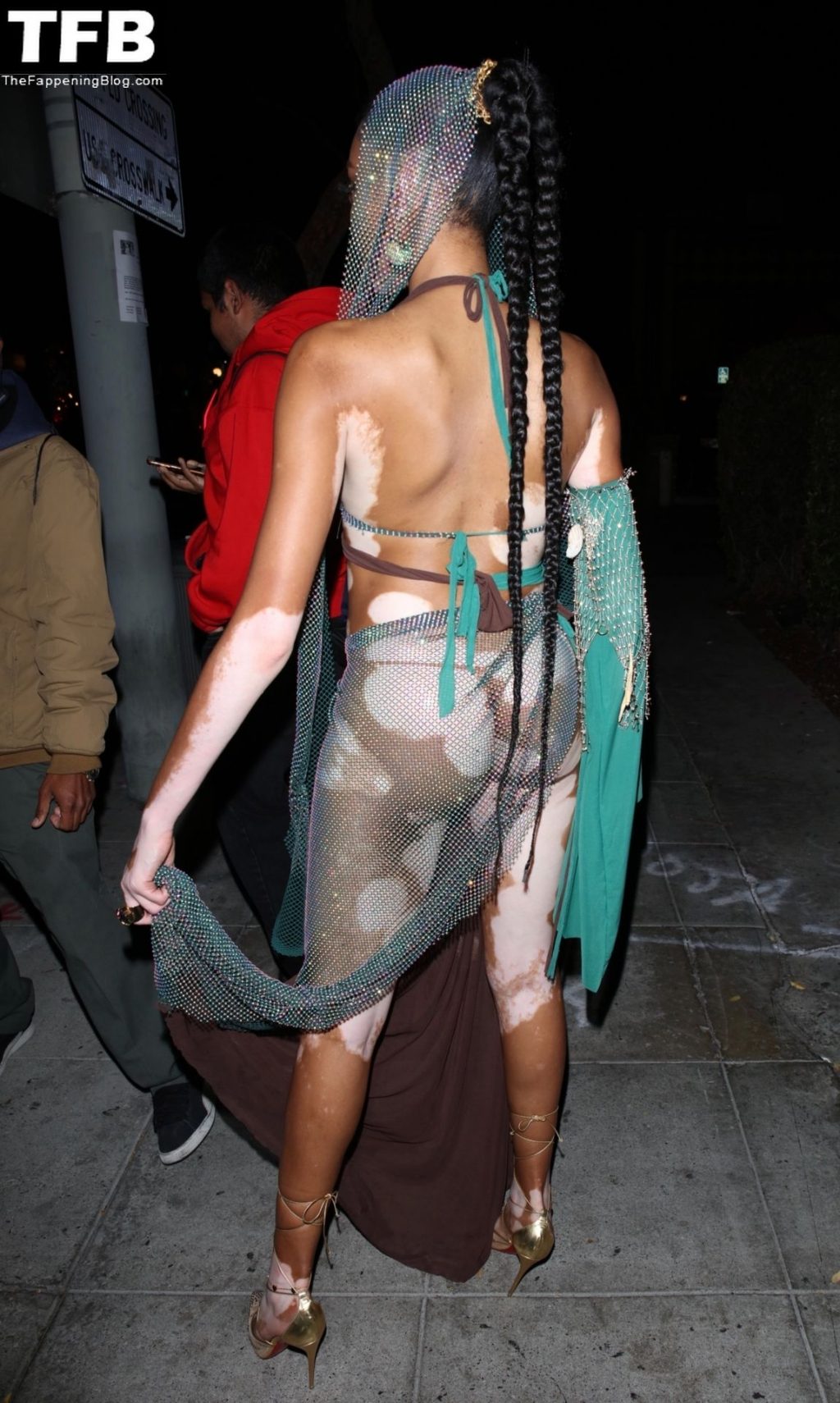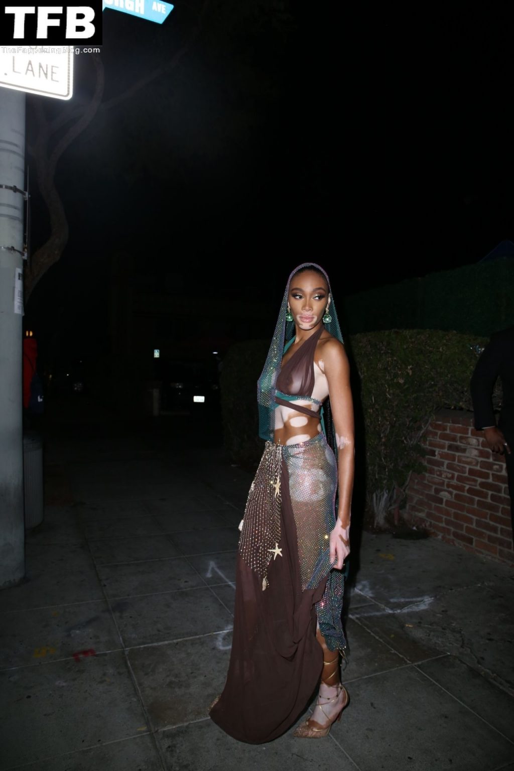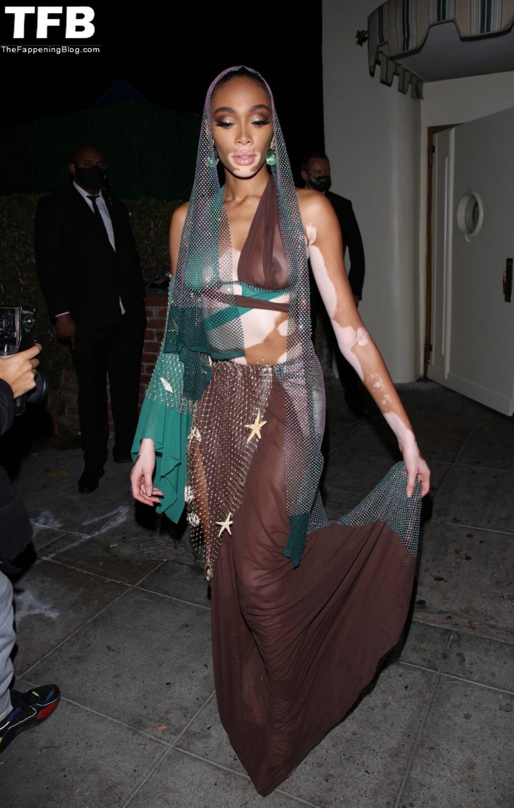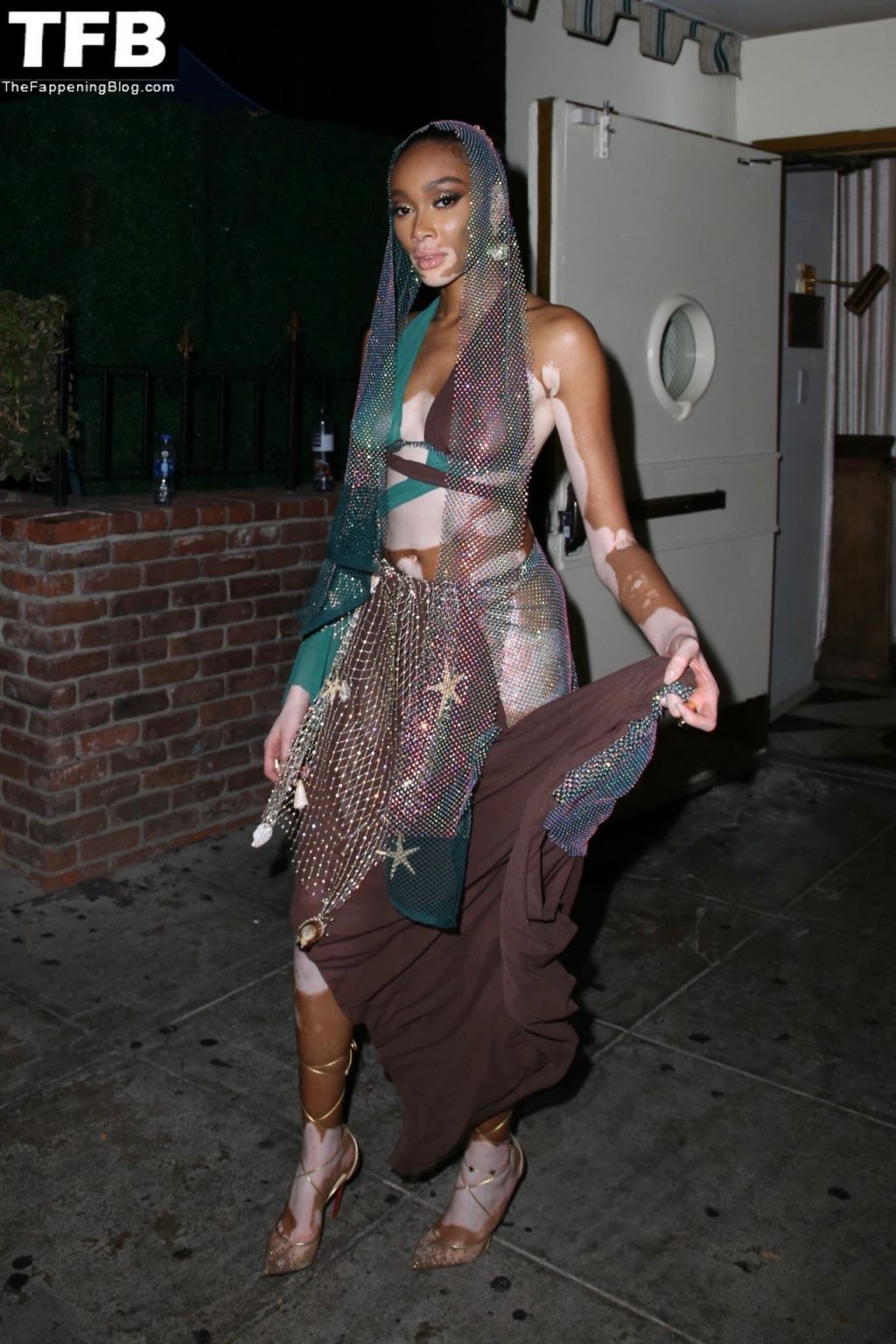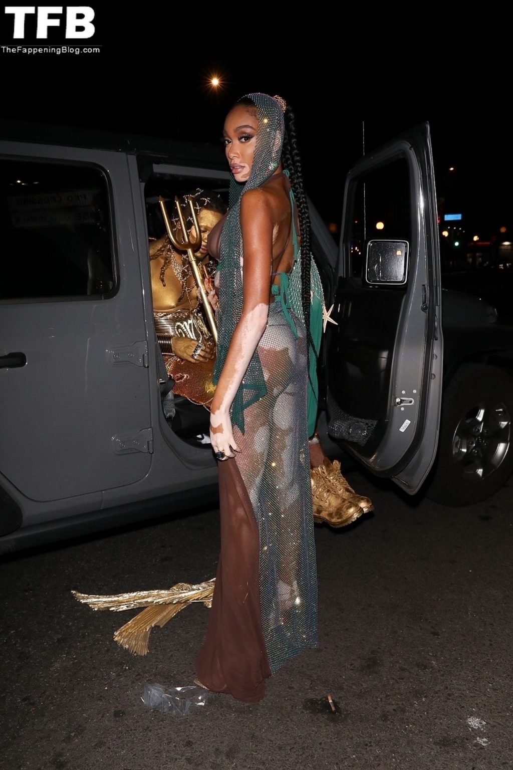 Winnie Harlow stupisce con un costume di Halloween alla festa di compleanno di Doja Cat a West Hollywood, 21/10/2021. La modella appare senza reggiseno con un top in pizzo trasparente e una gonna in rete che lascia intravedere il fondoschiena mentre fa un ingresso alla moda.