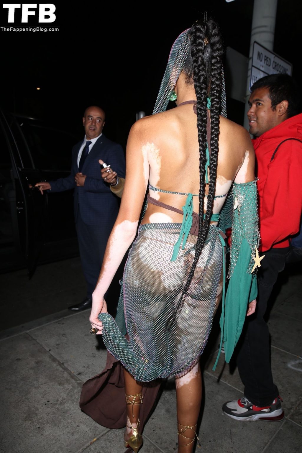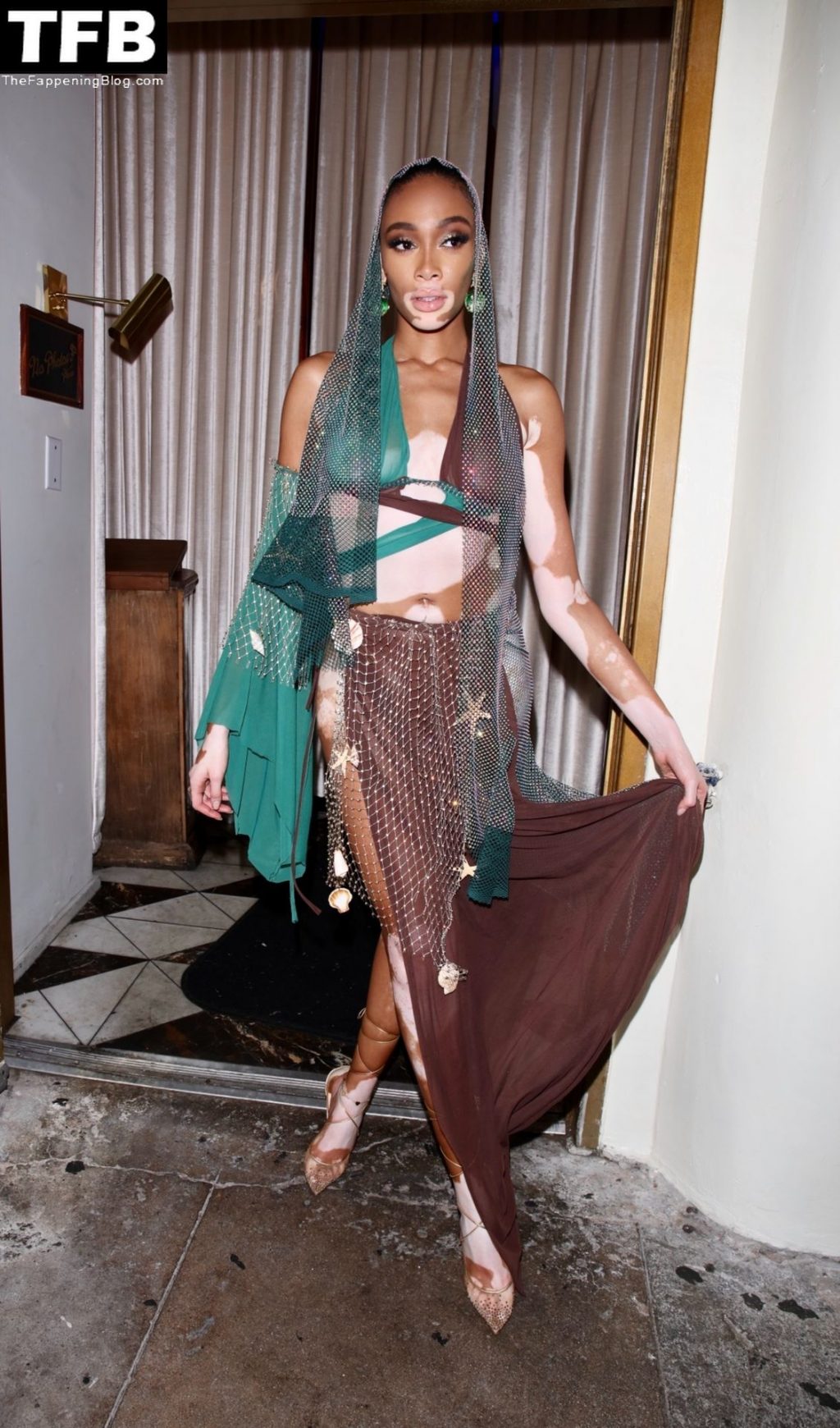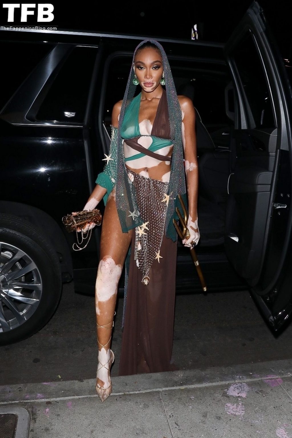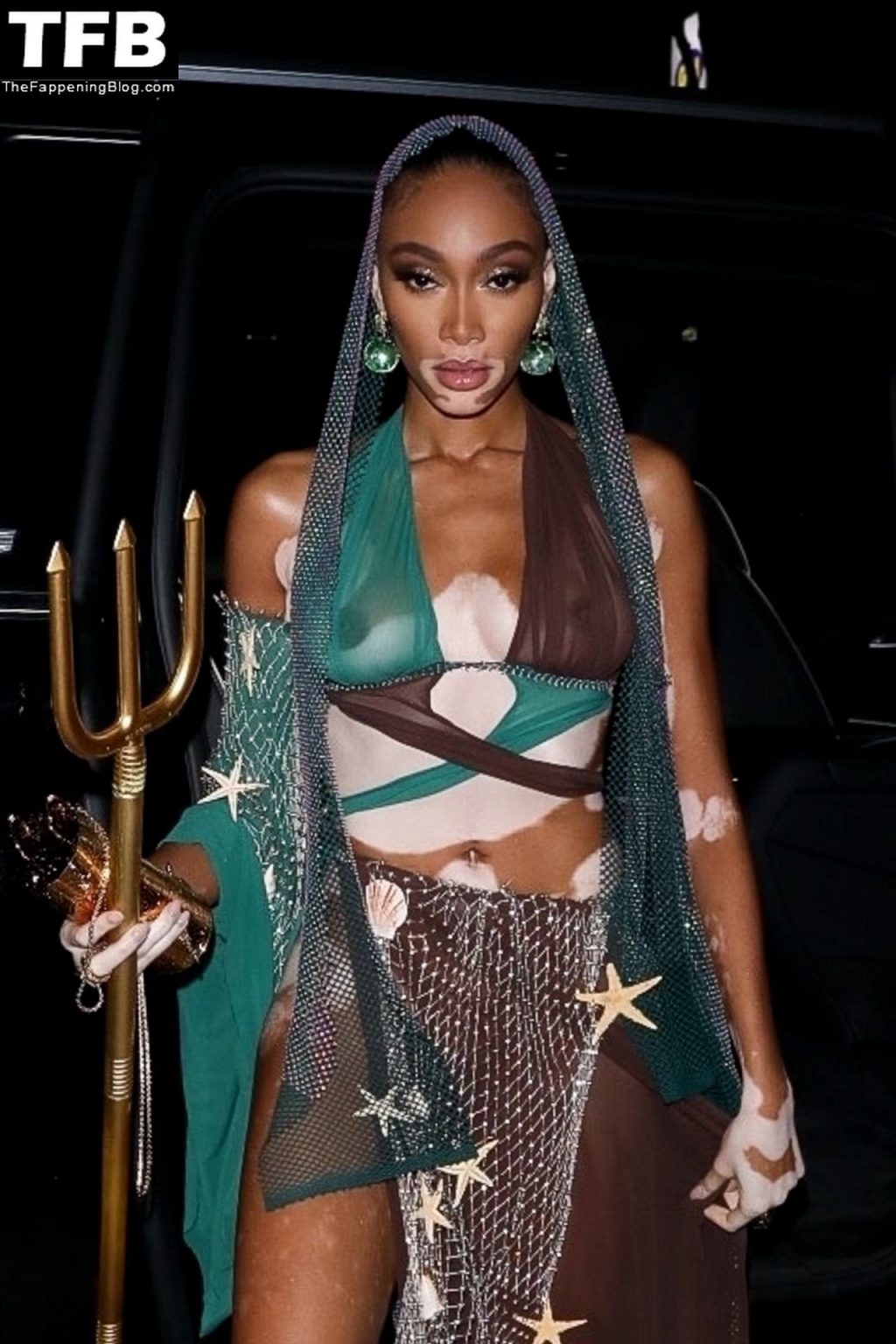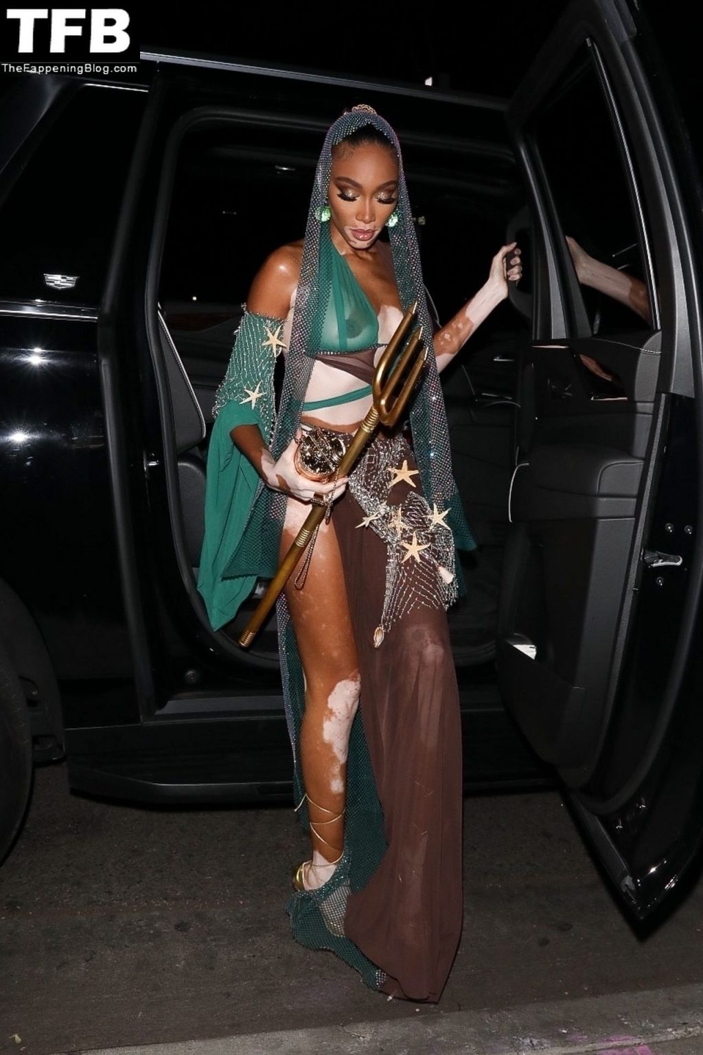 Winnie Harlow stupisce con un costume di Halloween alla festa di compleanno di Doja Cat a West Hollywood, 21/10/2021. La modella appare senza reggiseno con un top in pizzo trasparente e una gonna in rete che lascia intravedere il fondoschiena mentre fa un ingresso alla moda.