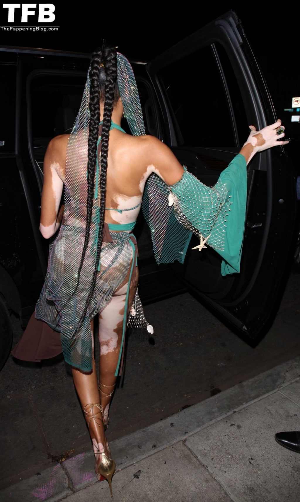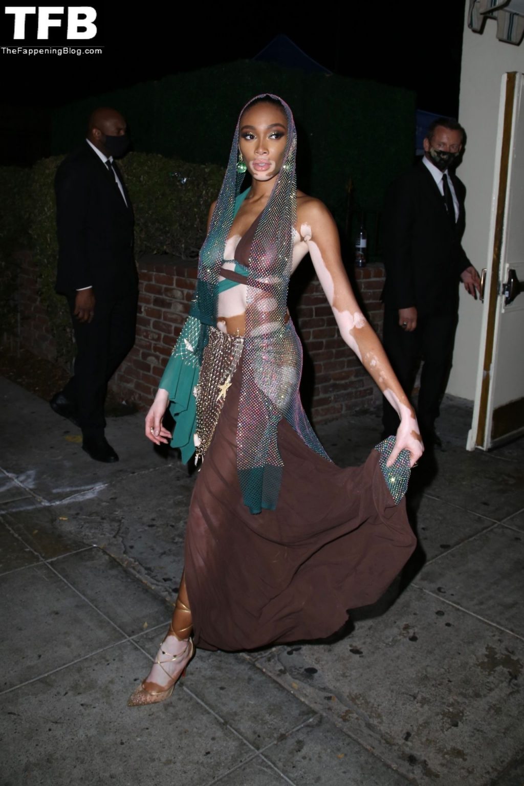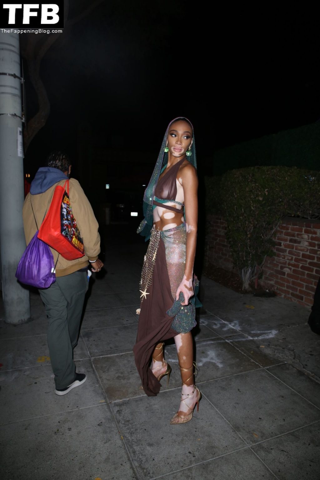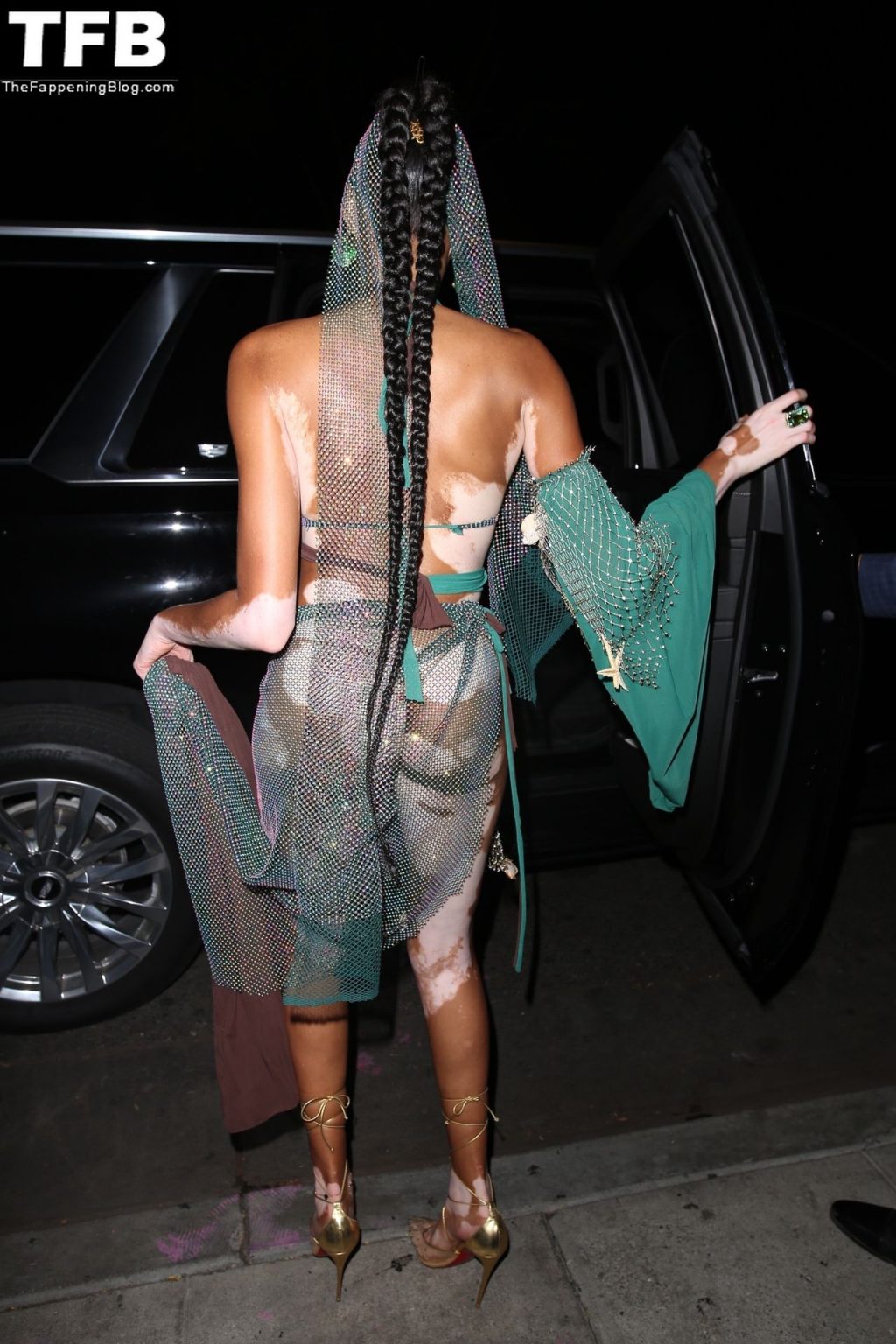 Winnie Harlow stupisce con un costume di Halloween alla festa di compleanno di Doja Cat a West Hollywood, 21/10/2021. La modella appare senza reggiseno con un top in pizzo trasparente e una gonna in rete che lascia intravedere il fondoschiena mentre fa un ingresso alla moda.