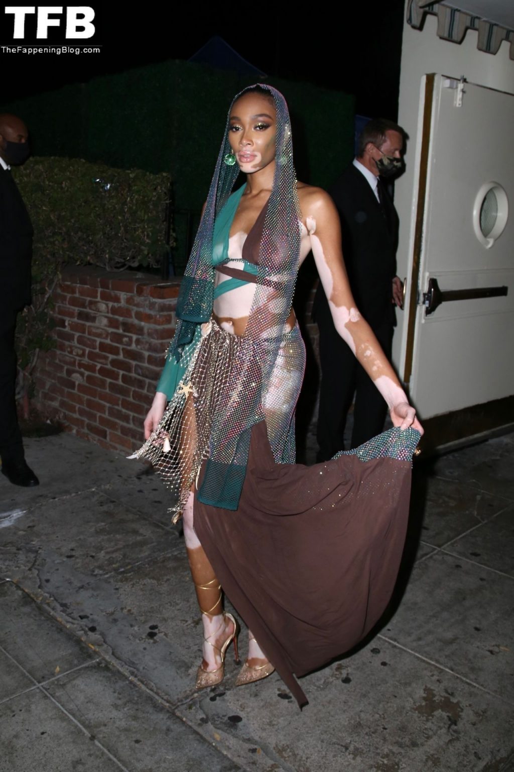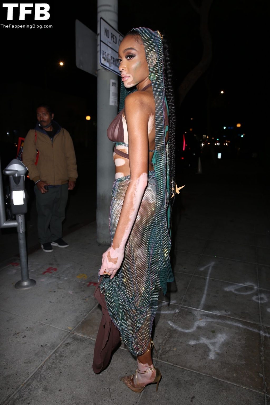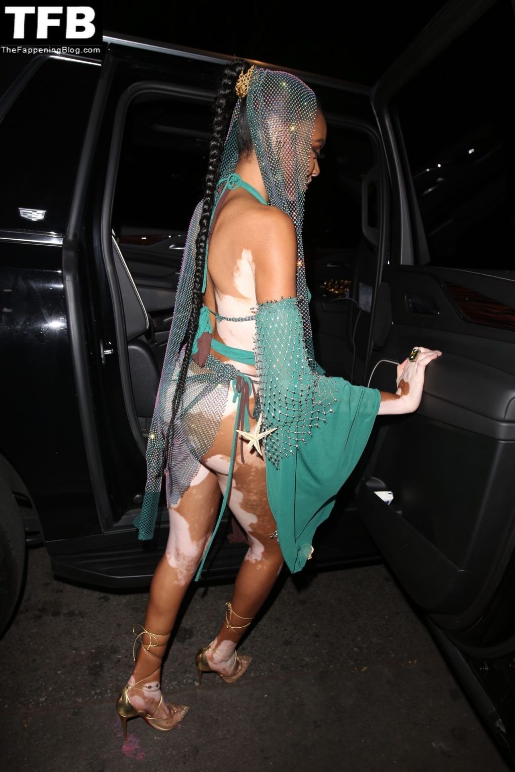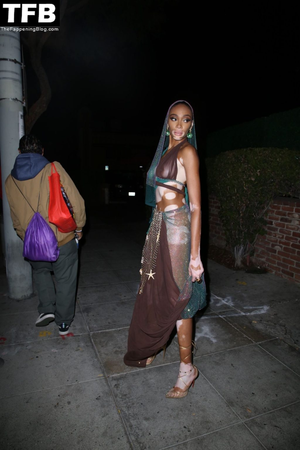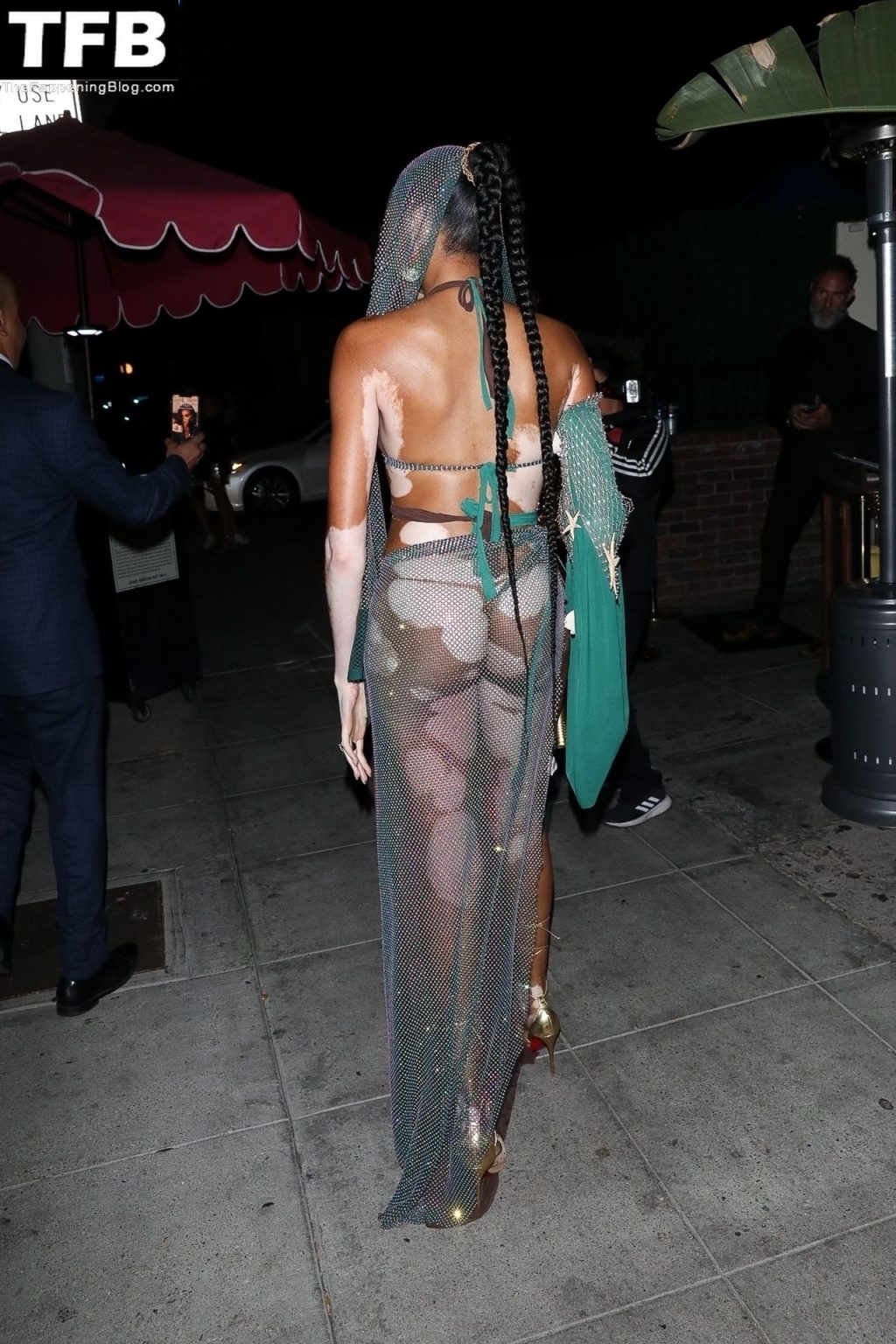 Winnie Harlow stupisce con un costume di Halloween alla festa di compleanno di Doja Cat a West Hollywood, 21/10/2021. La modella appare senza reggiseno con un top in pizzo trasparente e una gonna in rete che lascia intravedere il fondoschiena mentre fa un ingresso alla moda.
