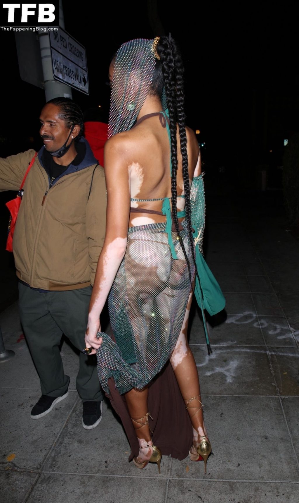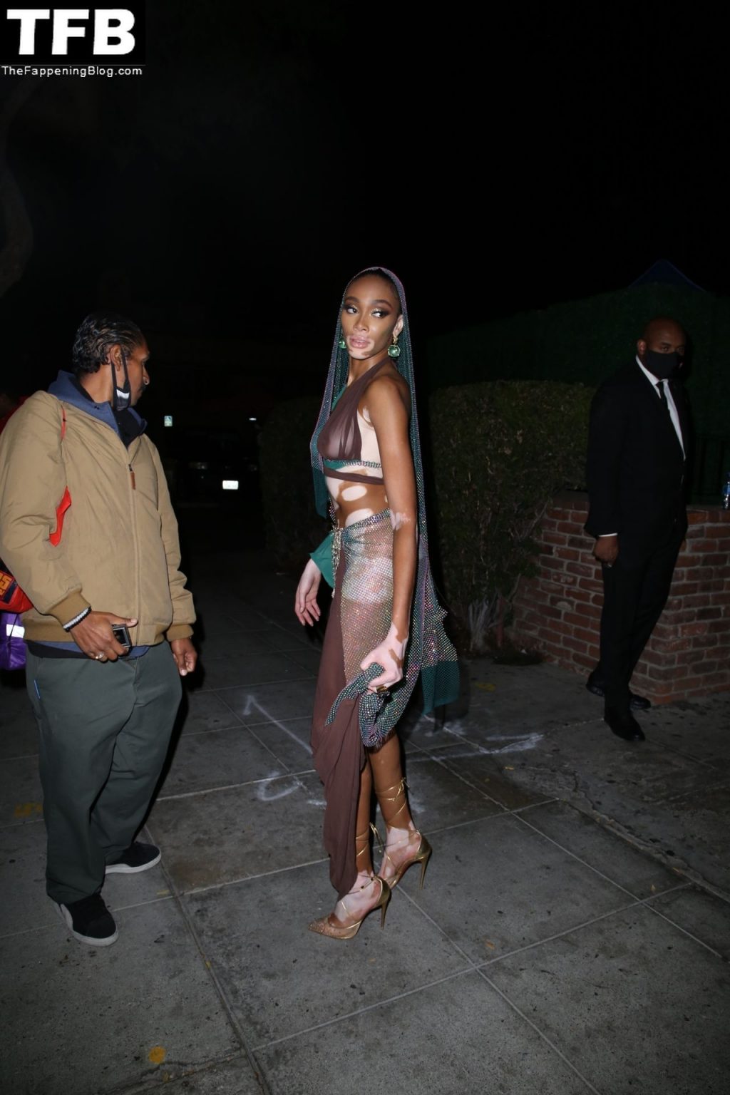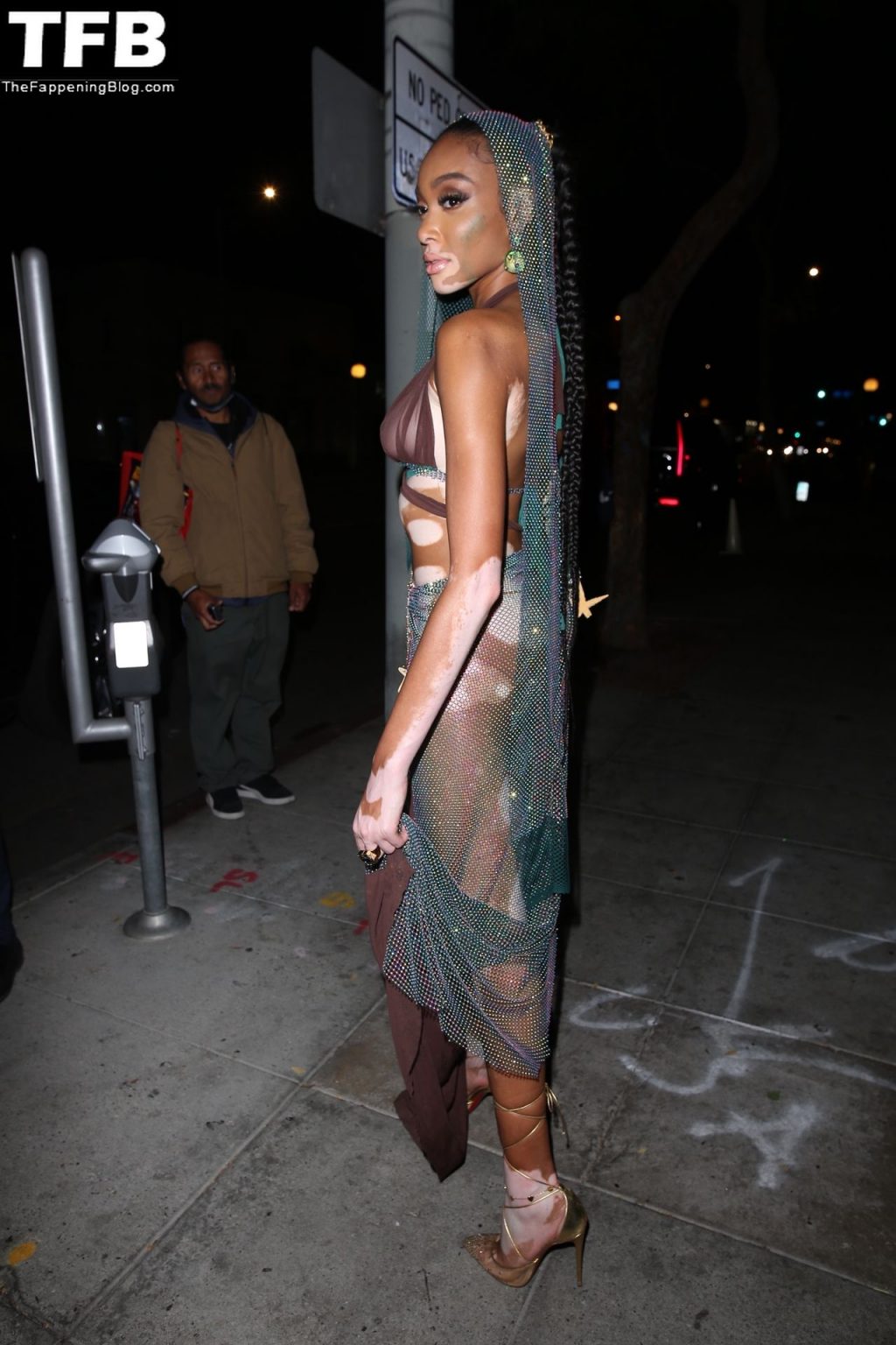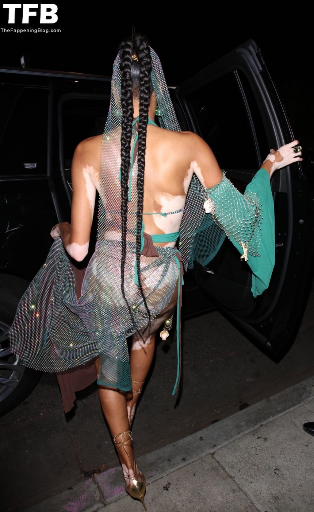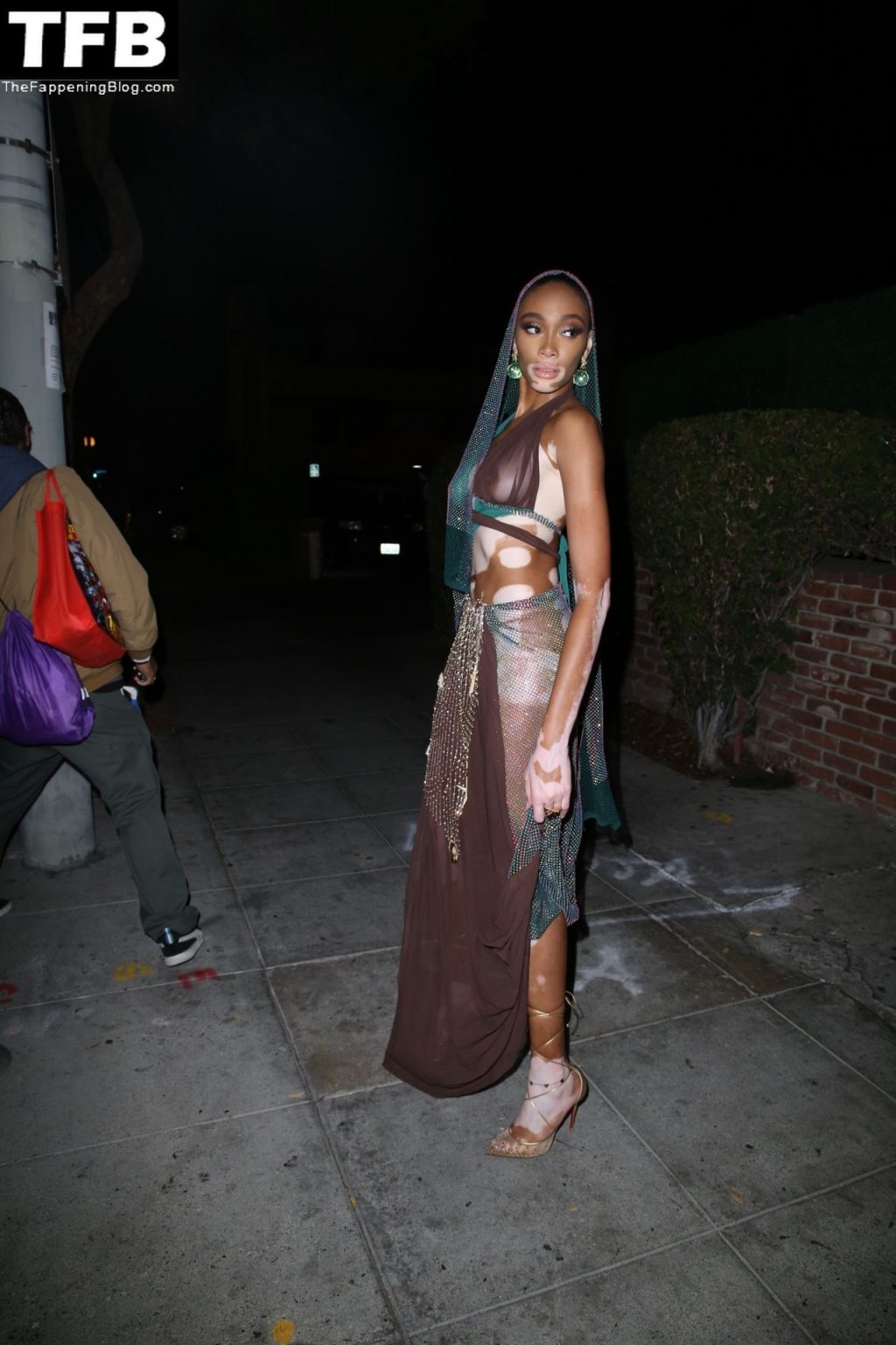 Winnie Harlow stupisce con un costume di Halloween alla festa di compleanno di Doja Cat a West Hollywood, 21/10/2021. La modella appare senza reggiseno con un top in pizzo trasparente e una gonna in rete che lascia intravedere il fondoschiena mentre fa un ingresso alla moda.