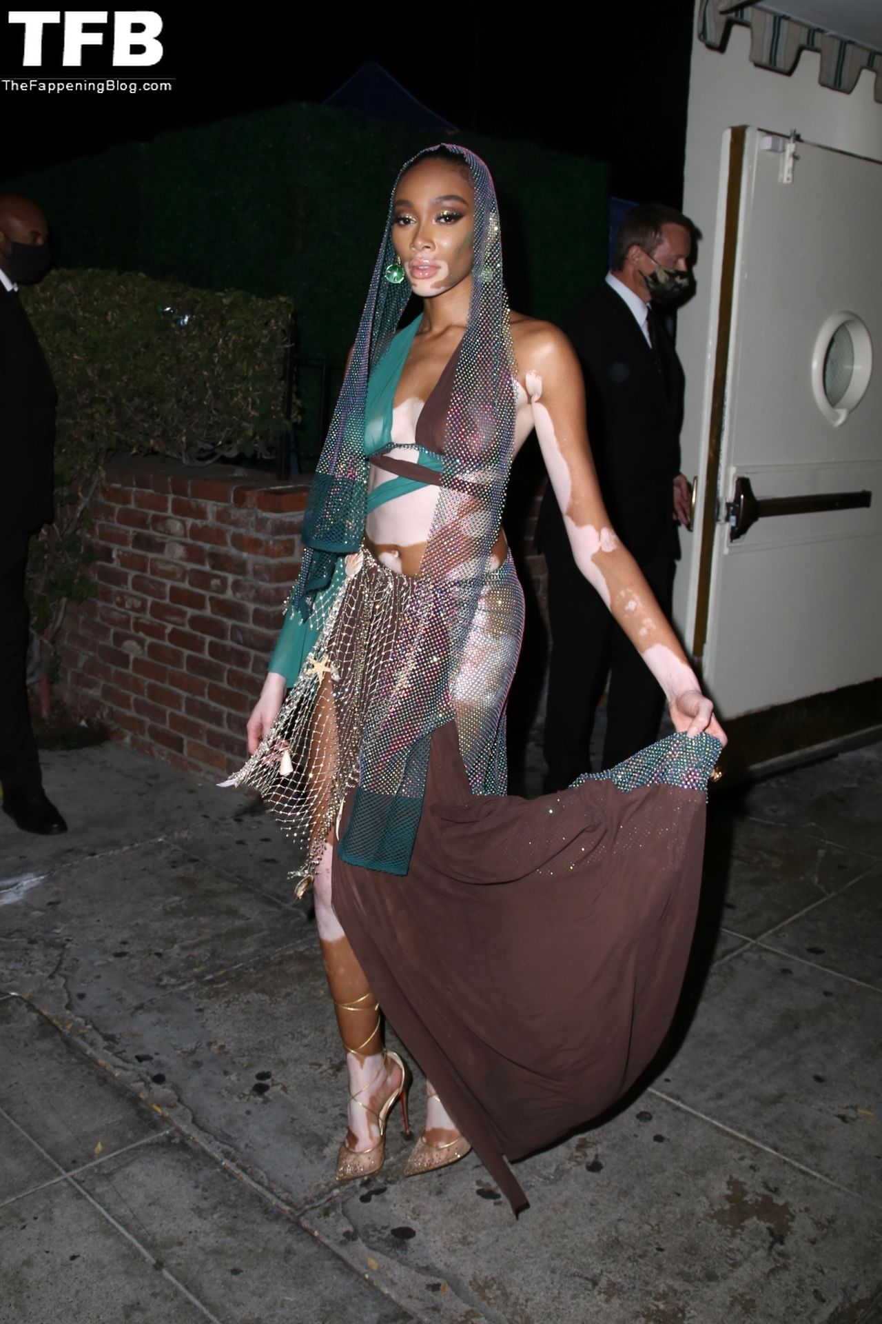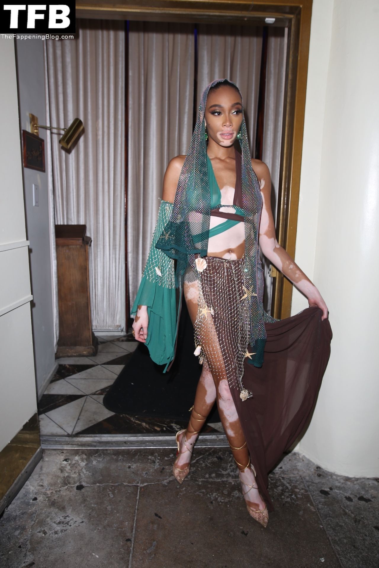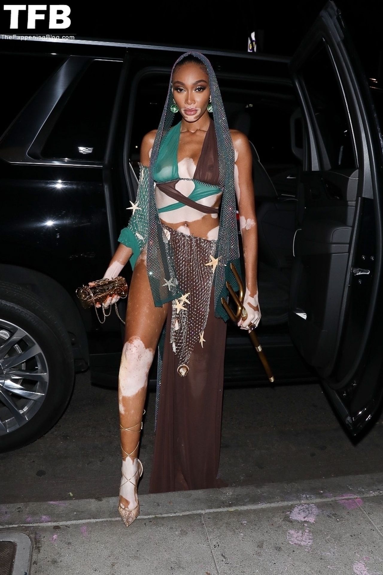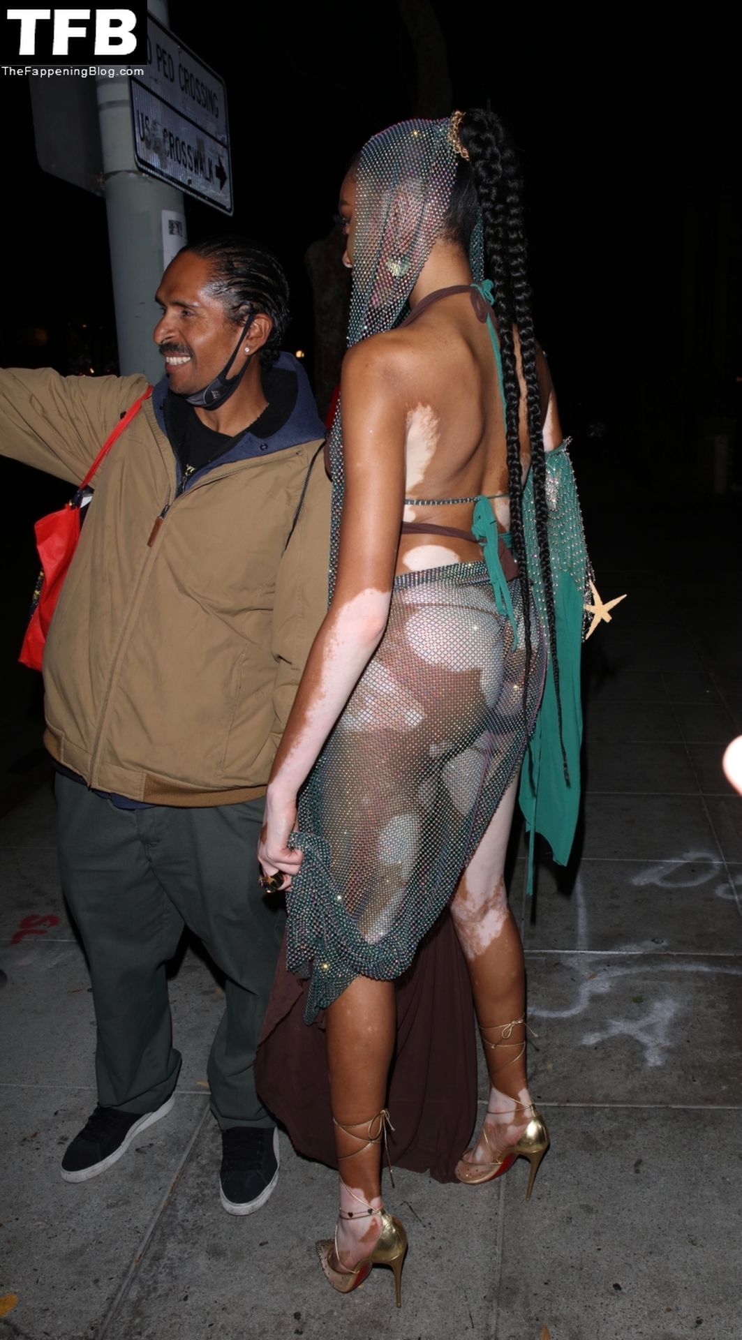 Winnie Harlow stupisce con un costume di Halloween alla festa di compleanno di Doja Cat a West Hollywood, 21/10/2021. La modella appare senza reggiseno con un top in pizzo trasparente e una gonna in rete che lascia intravedere il fondoschiena mentre fa un ingresso alla moda.