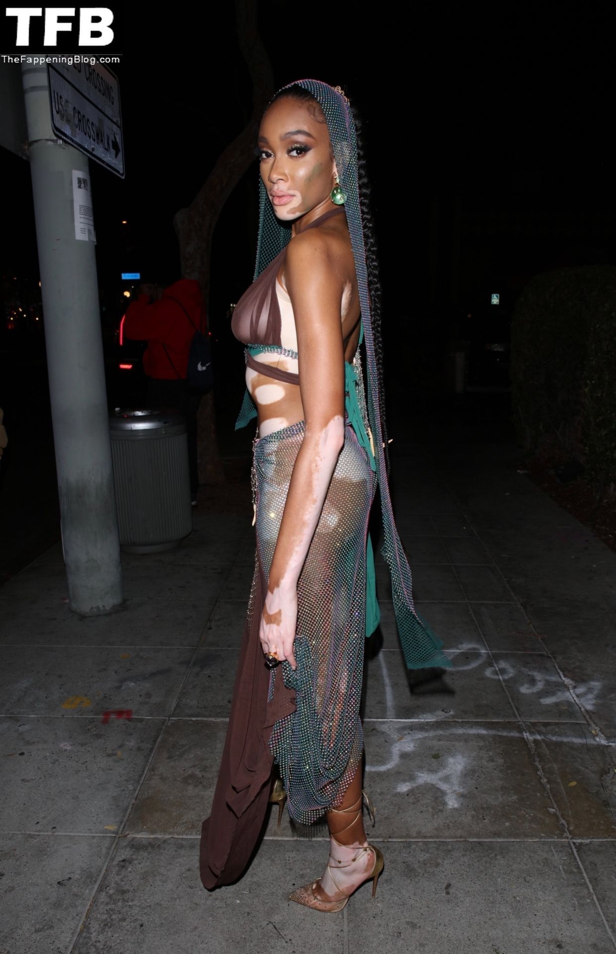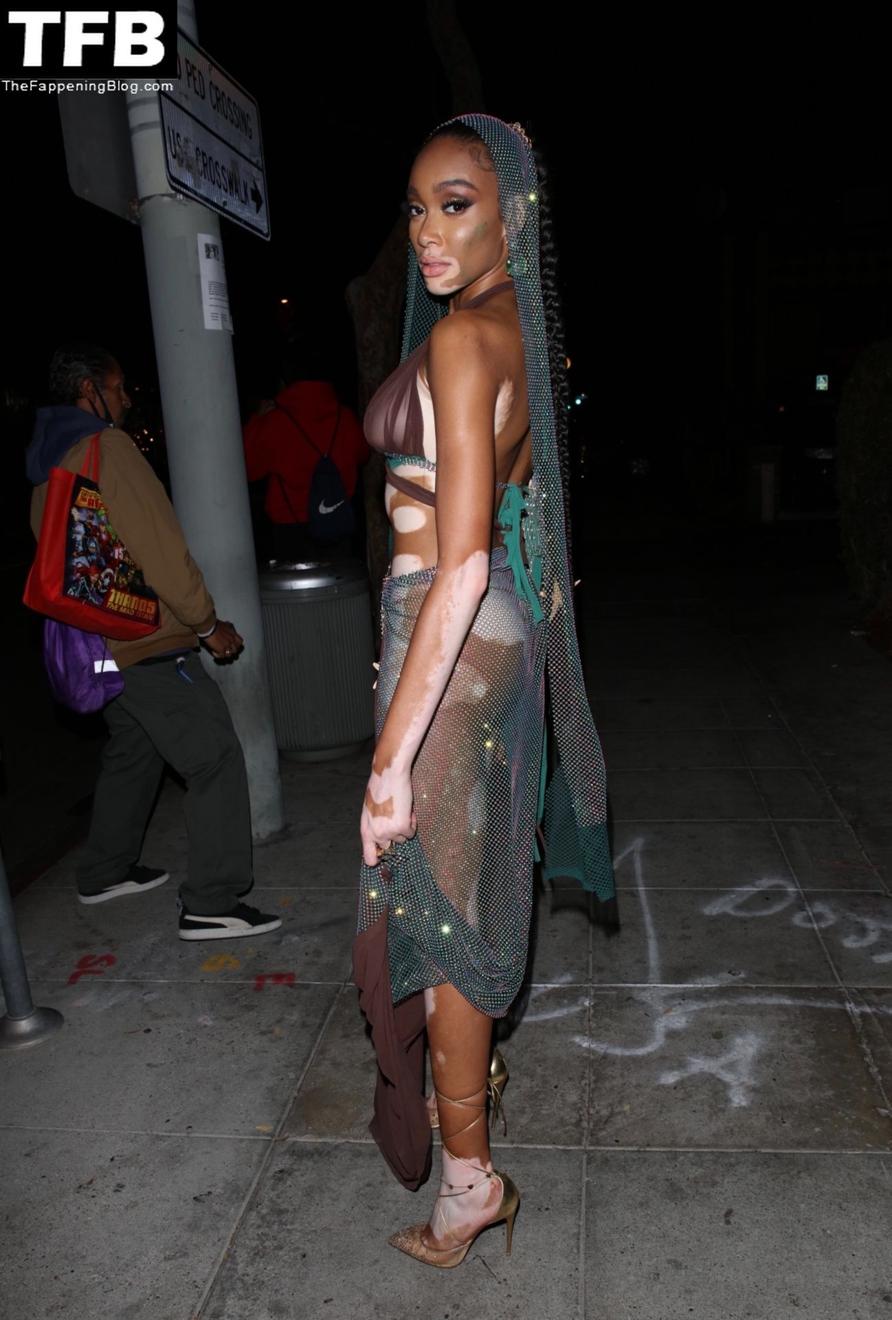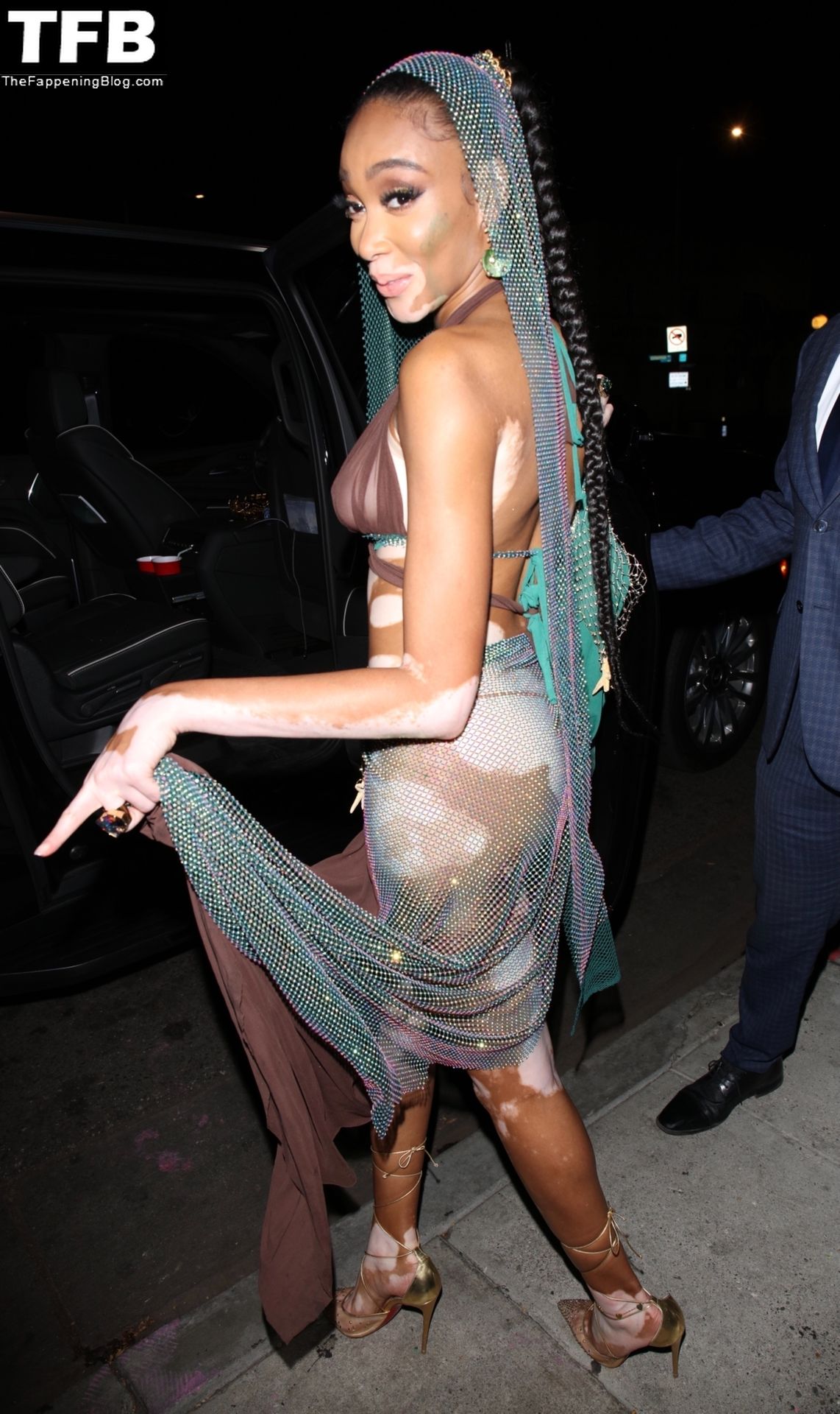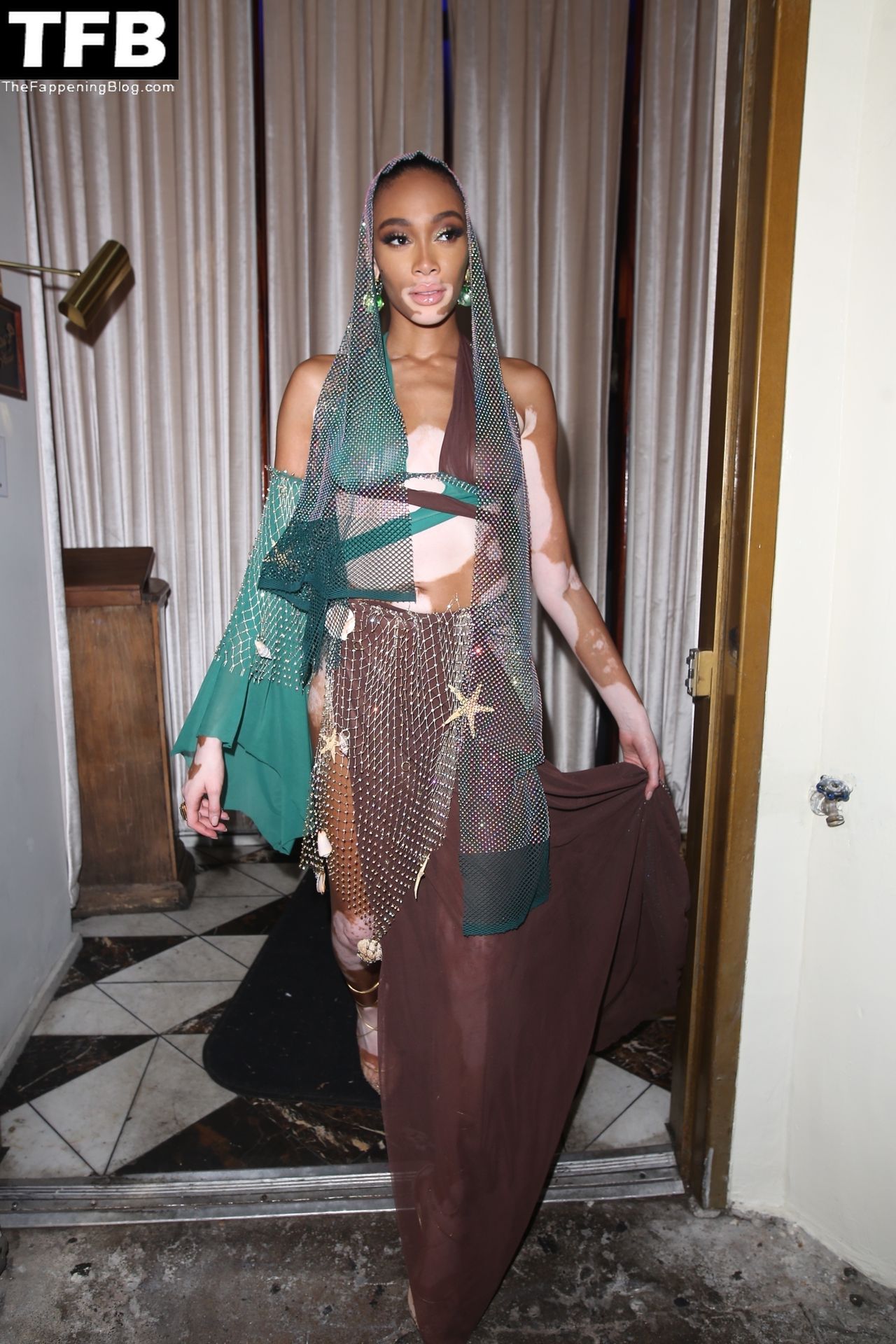 Winnie Harlow stupisce con un costume di Halloween alla festa di compleanno di Doja Cat a West Hollywood, 21/10/2021. La modella appare senza reggiseno con un top in pizzo trasparente e una gonna in rete che lascia intravedere il fondoschiena mentre fa un ingresso alla moda.