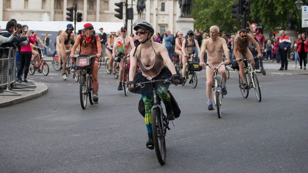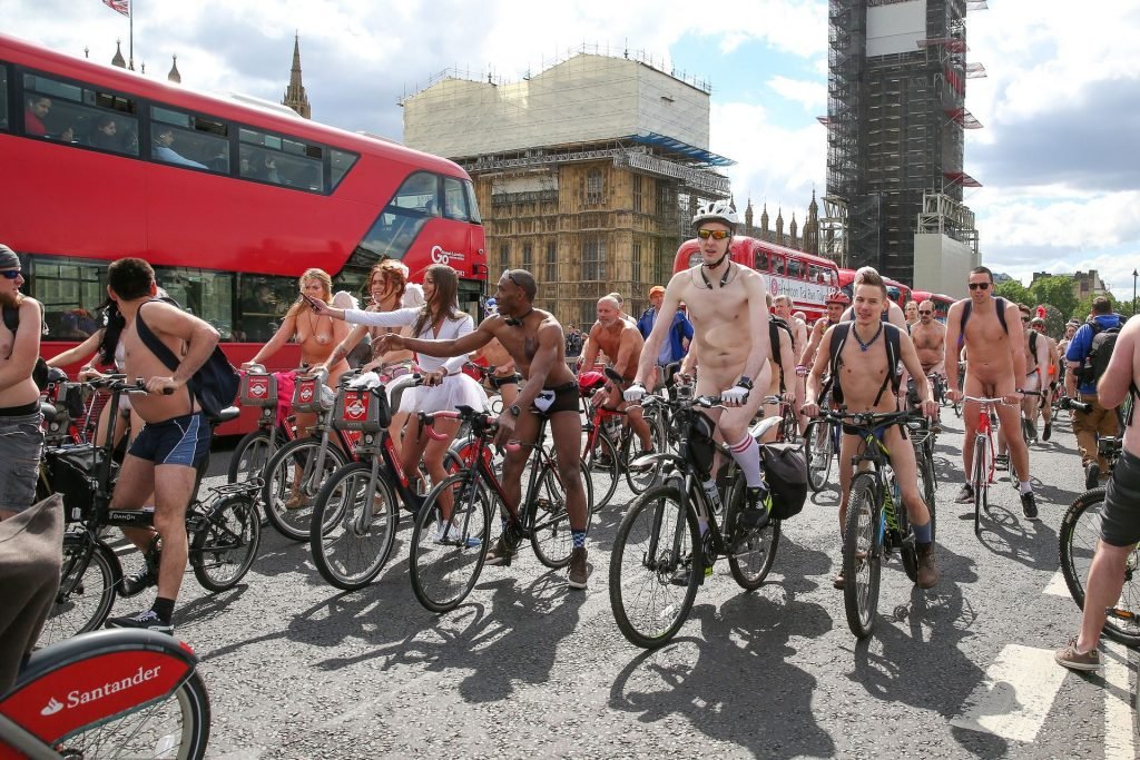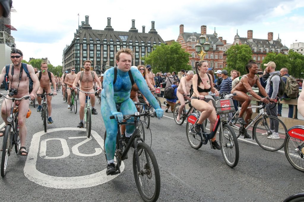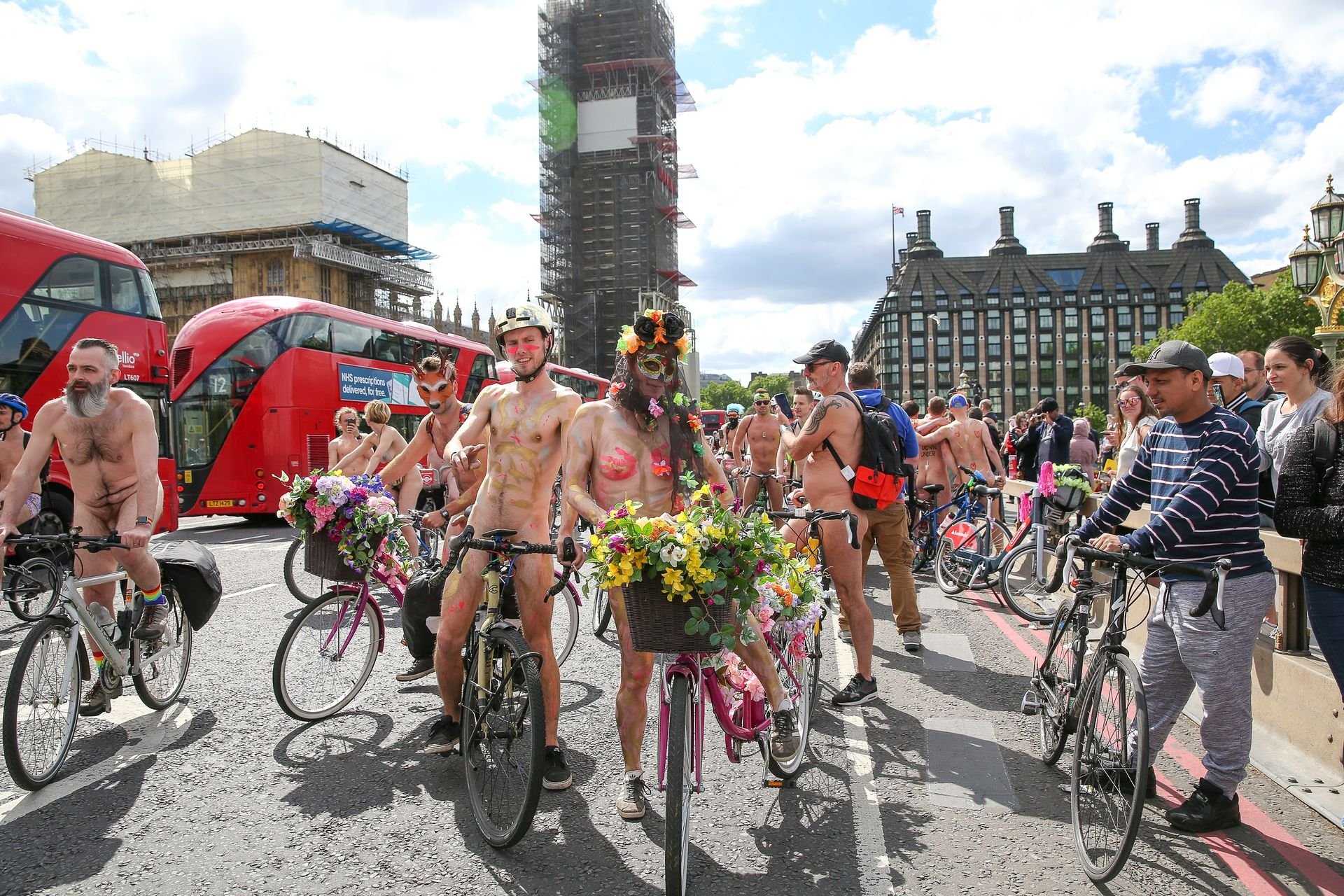 Ciclisti nudi partecipano alla 16ª edizione annuale della corsa in bicicletta nuda attraversando il Westminster Bridge come parte dell’evento World Naked Bike Ride (WNBR), 06/08/2019. I partecipanti dimostrano la vulnerabilità dei ciclisti e protestano contro la cultura dell’auto sensibilizzando sull’importanza dei ciclisti sulle strade.