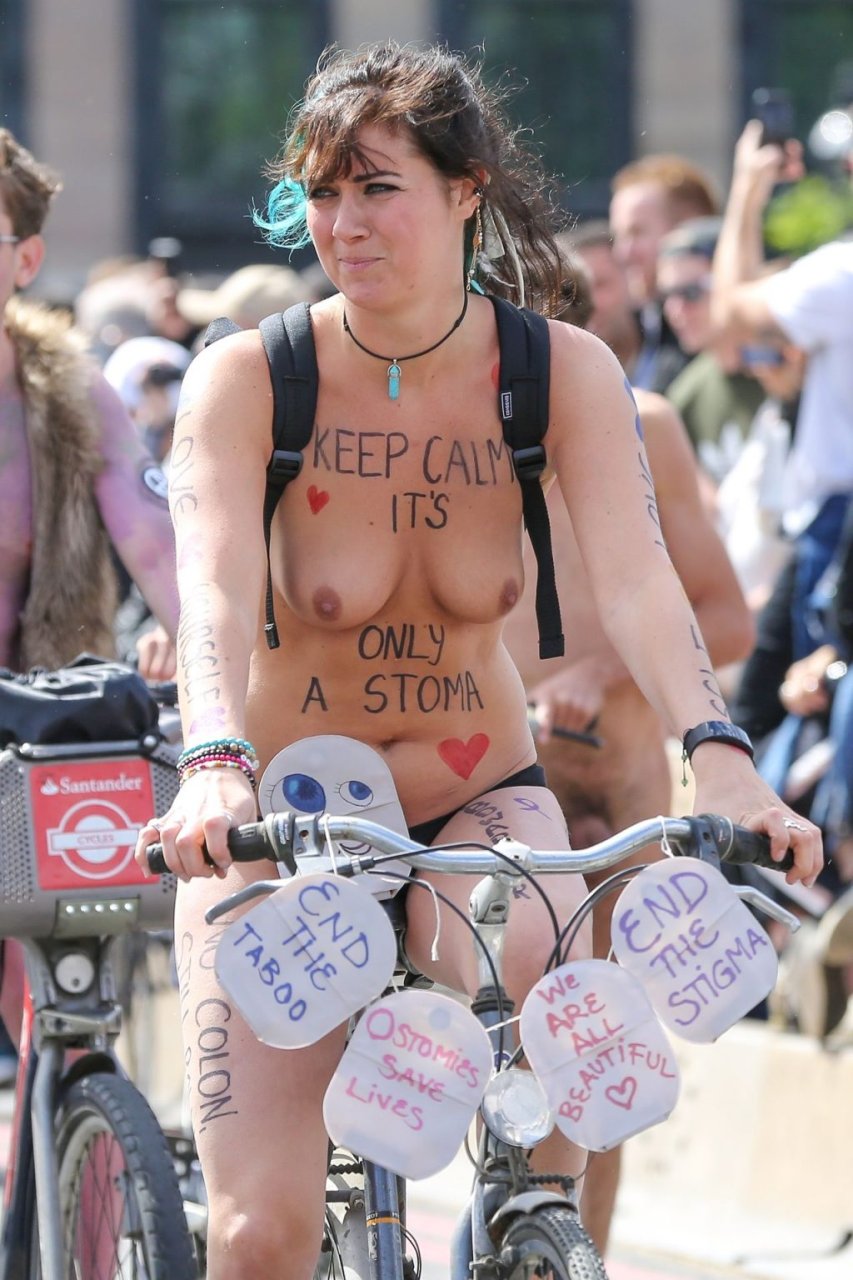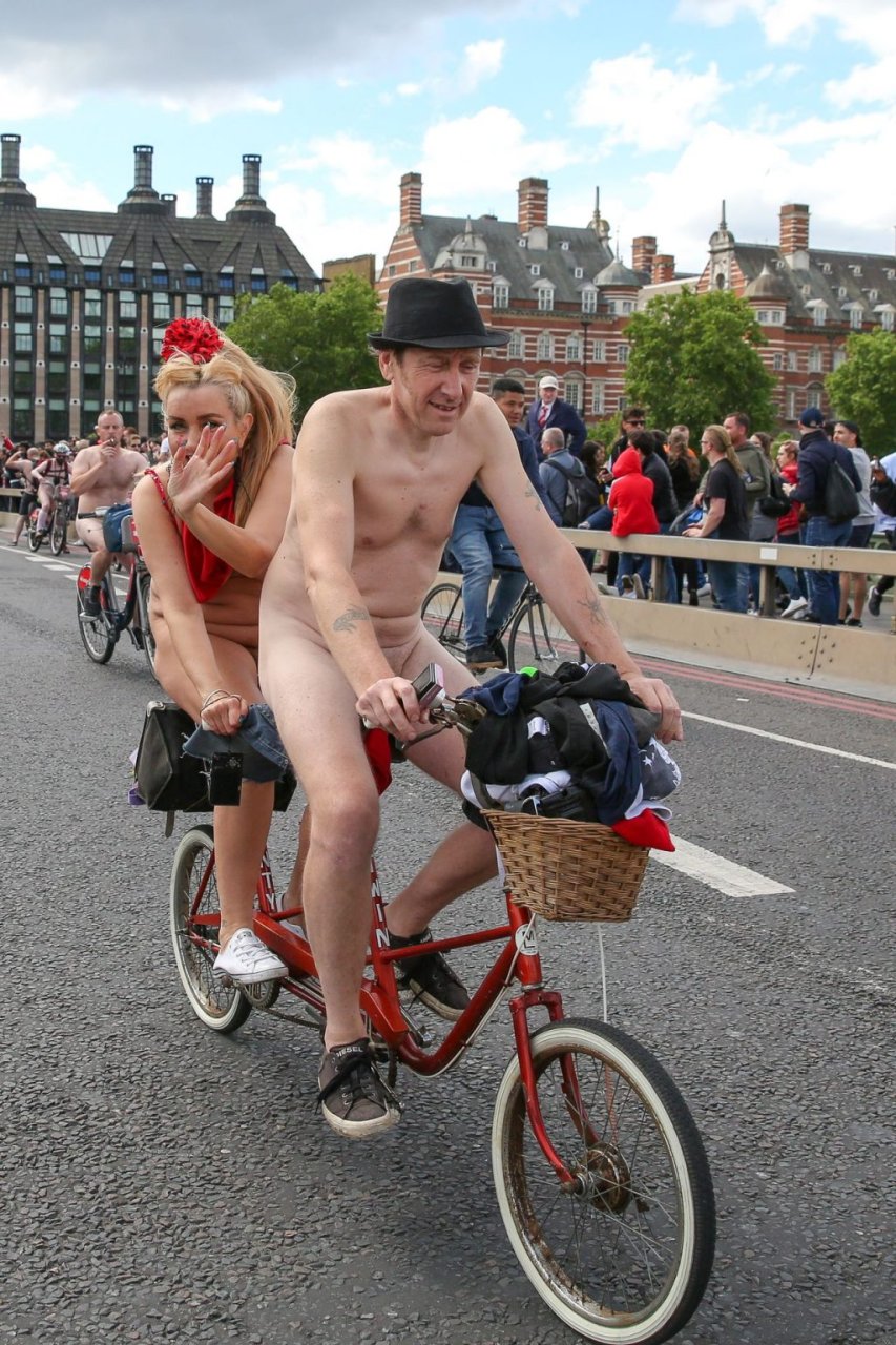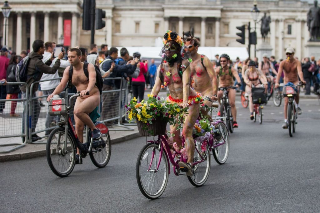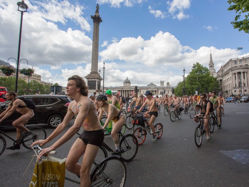 Ciclisti nudi partecipano alla 16ª edizione annuale della corsa in bicicletta nuda attraversando il Westminster Bridge come parte dell’evento World Naked Bike Ride (WNBR), 06/08/2019. I partecipanti dimostrano la vulnerabilità dei ciclisti e protestano contro la cultura dell’auto sensibilizzando sull’importanza dei ciclisti sulle strade.