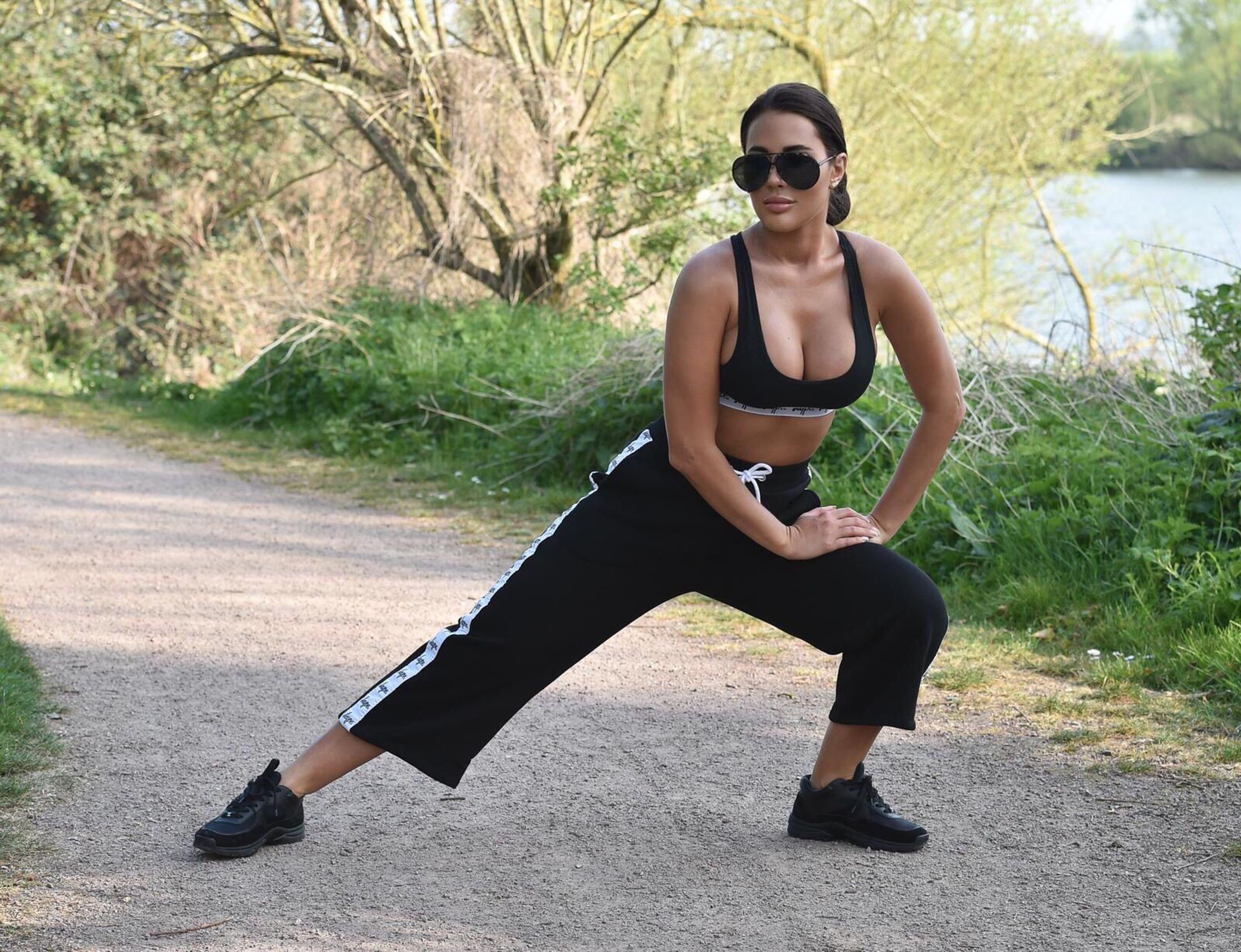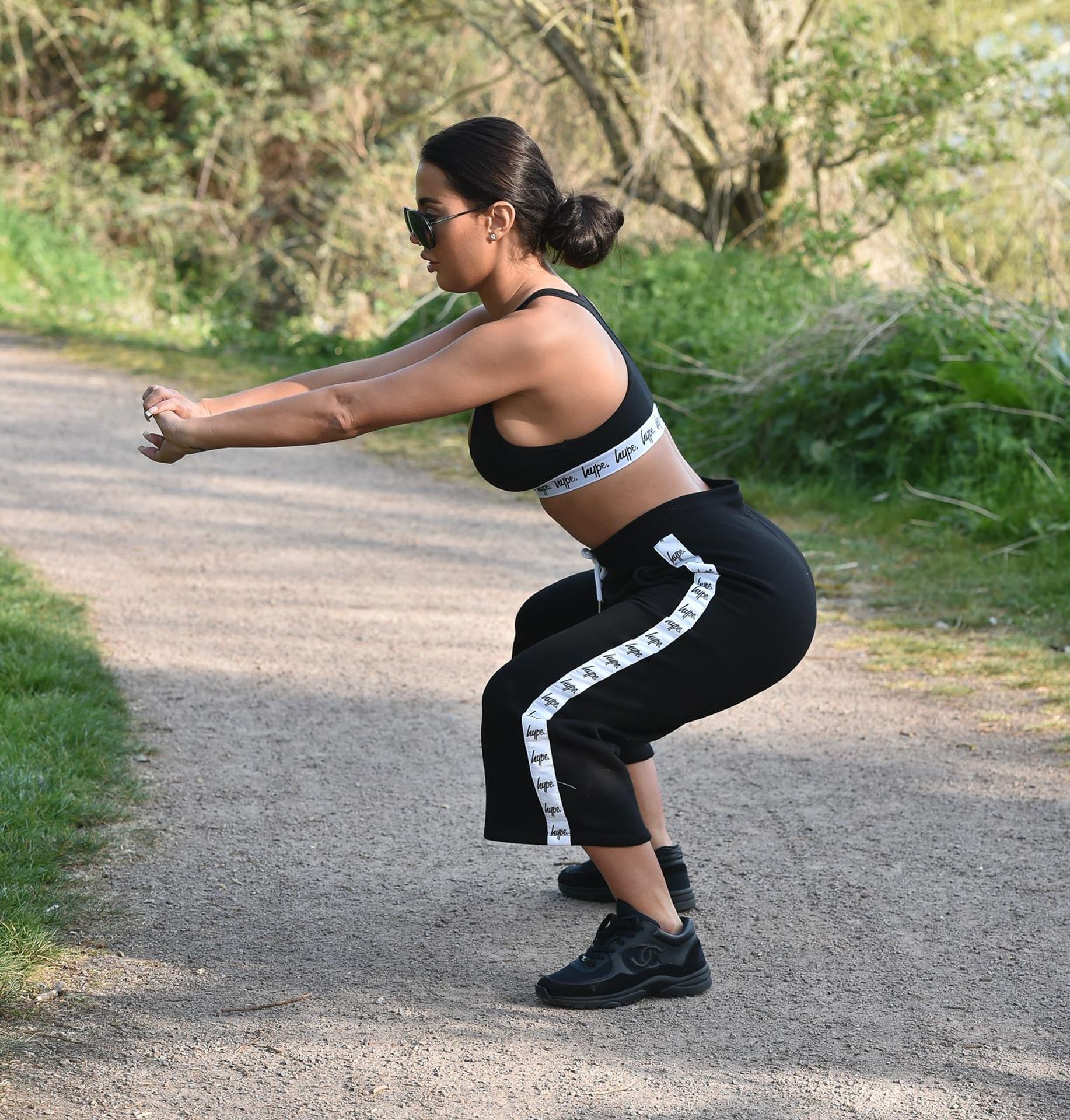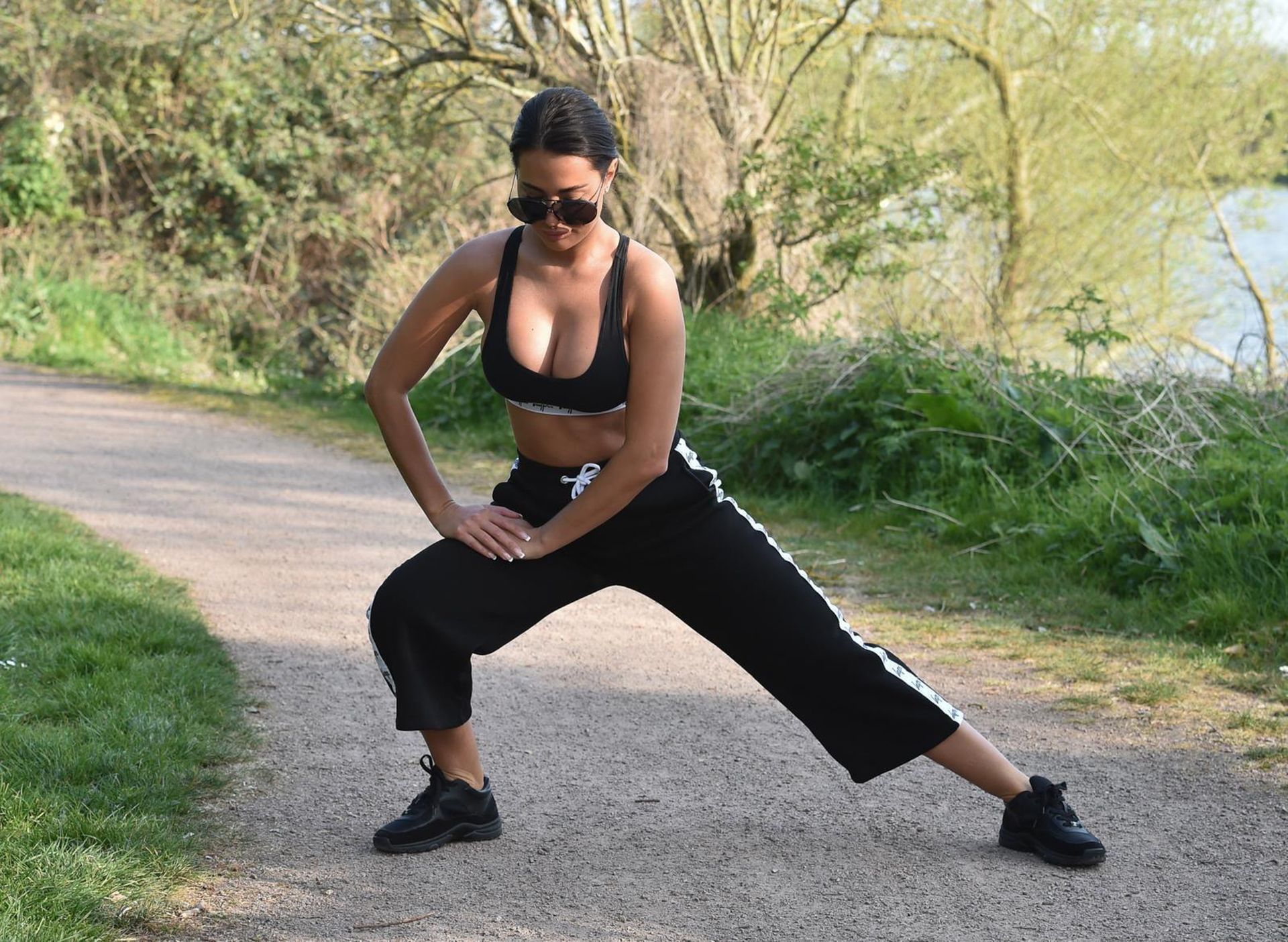La star della TV reality con un fisico prosperoso Yazmin Oukhellou fa il suo allenamento mattutino facendo stretching in un parco locale vicino a casa sua a Essex, 04/12/2020.
