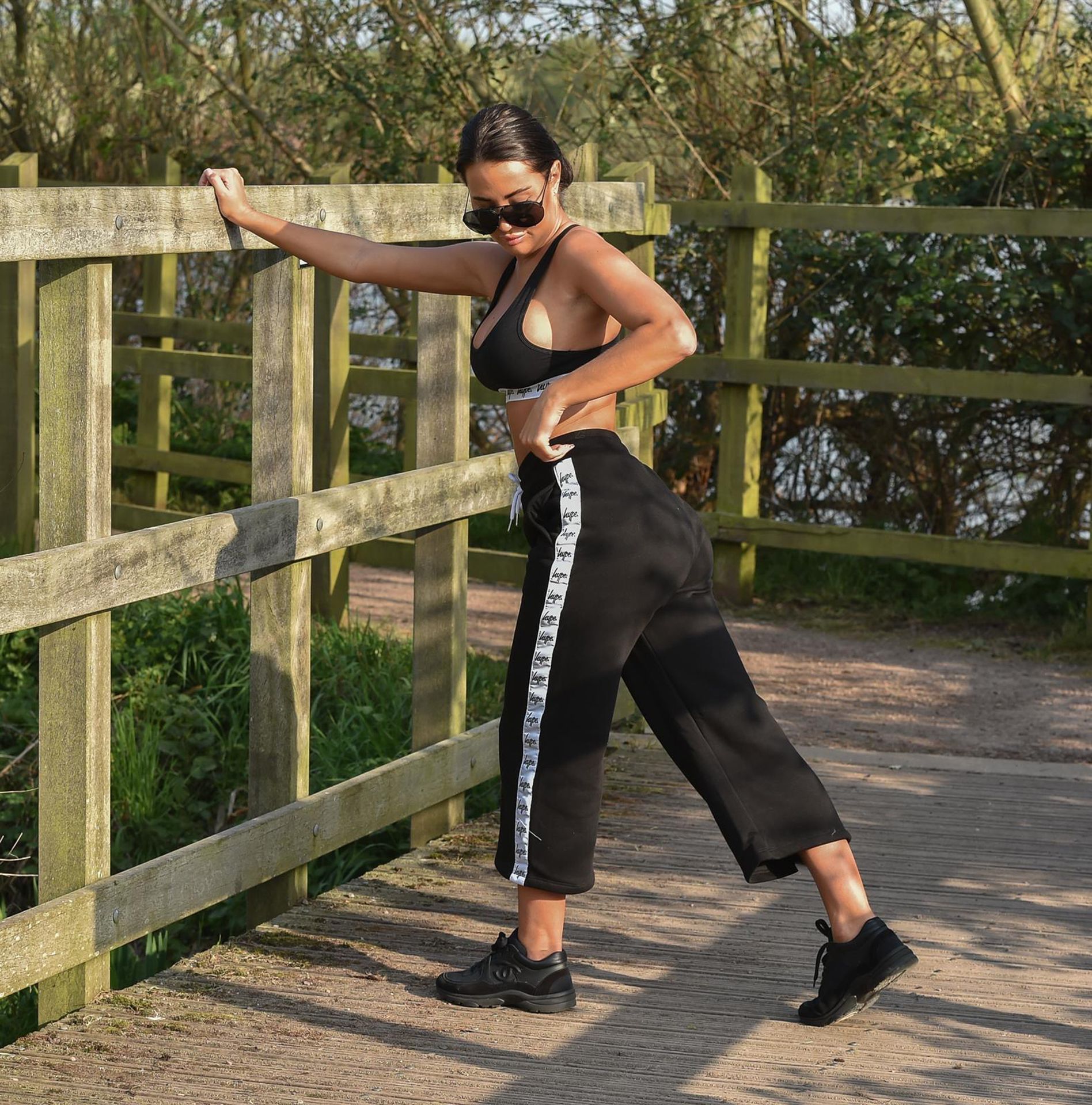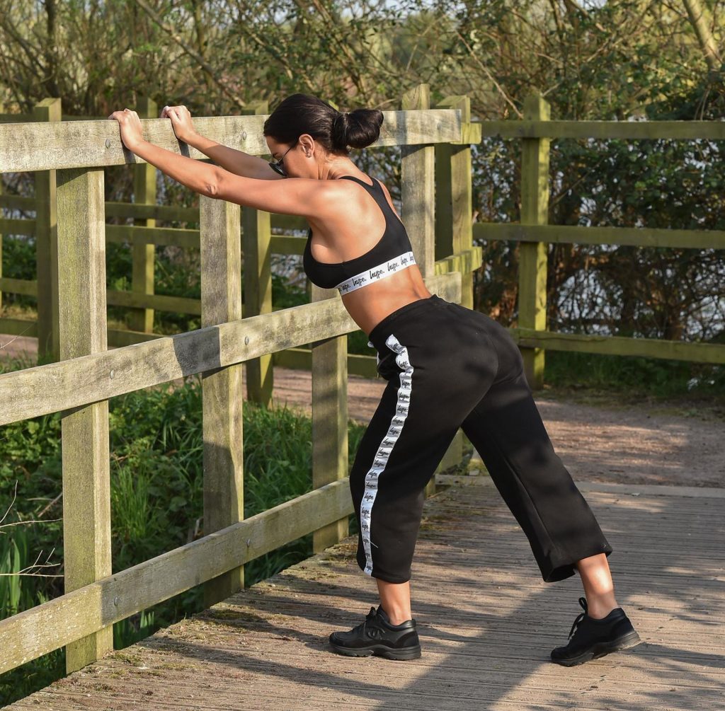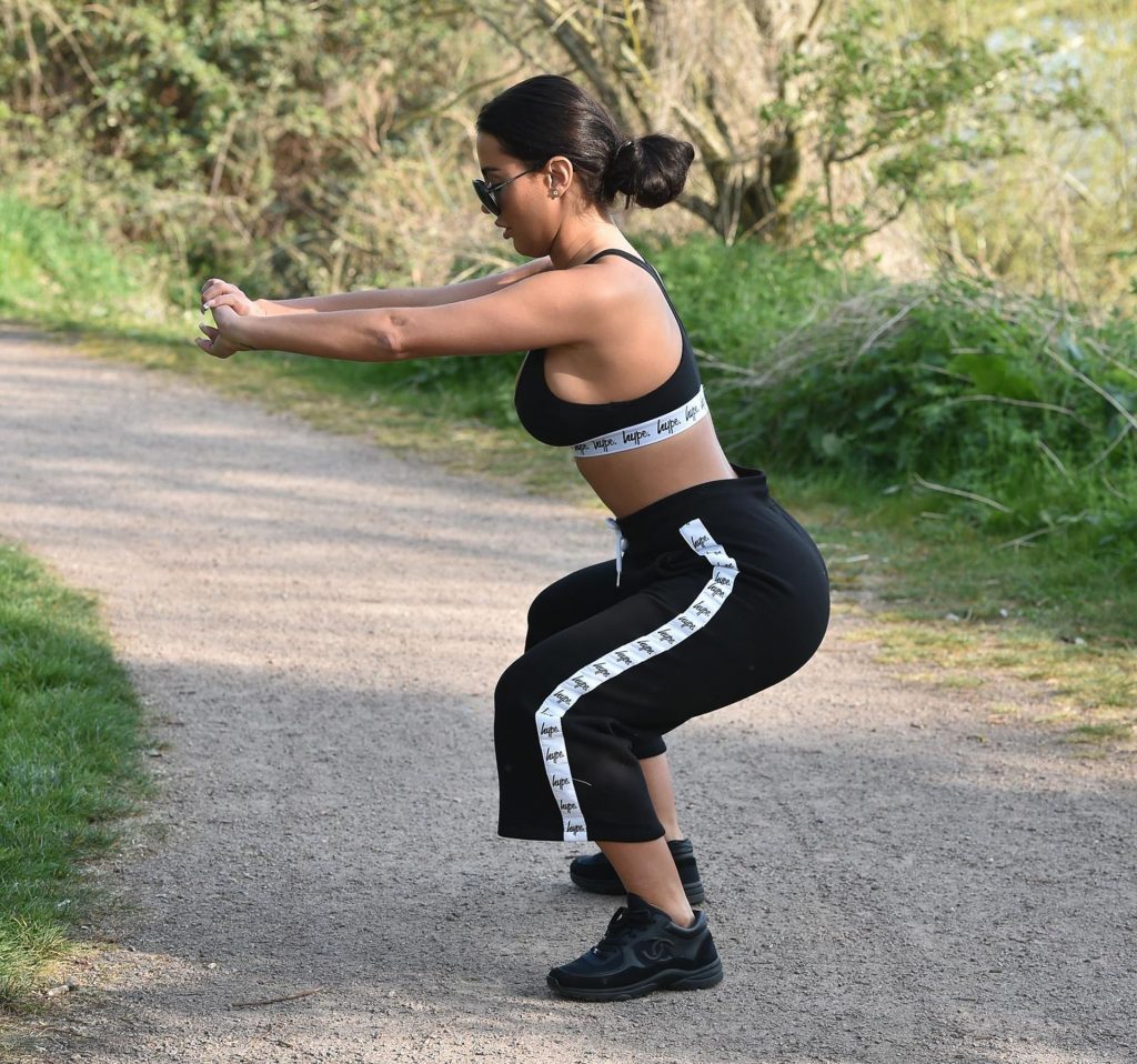 La star della TV reality con un fisico prosperoso Yazmin Oukhellou fa il suo allenamento mattutino facendo stretching in un parco locale vicino a casa sua a Essex, 04/12/2020.